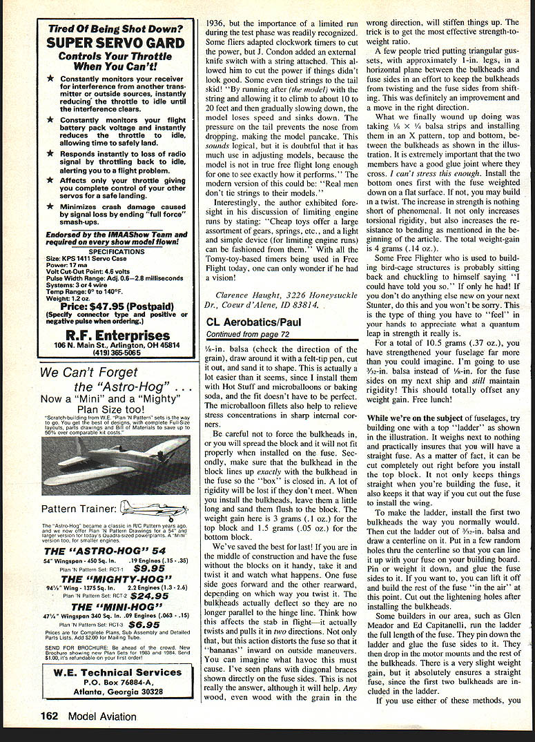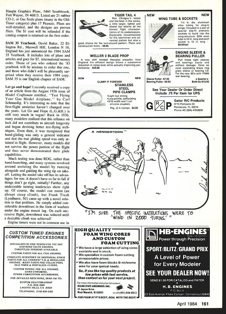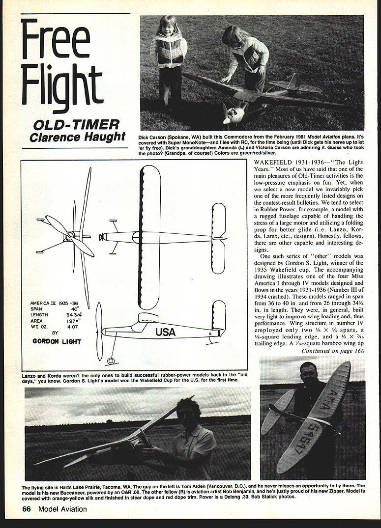 Free Flight OLD- TIMER Clarence Haught AMERICA 1 1935 -36 SPAN 40 LENGTH34 3/4 AREA197 WI OZ407 USjjjfl BY GORDON LIGHT WAKEFIELD 1931-1936The Light Years Most us have said main pleasures Old-Timer activities low-pressure emphasis fun Yet select new model invariably pick frequently listed designs contest-result bulletins tend select Rubber Power example model rugged fuselage capable handling stress large motor utilizing folding prop better glide ie Lanzo Kor da Lamb etc designs Honestly fellows other capable interesting de signs such series other models designed Gordon S Light winner 1935 Wakefield cup accompanying drawing illustrates four Miss America through IV models designed flown years 1931-1936 Number III 1934 crashed models ranged span 36 40 26 through 34 in length general built very light improve wing loading thus performance Wing structure number IV employed two x V4 spars A-square leading edge /g X 7A6 trailing edge /16-square bamboo wing tip Continued page 160 66 Model Aviation Dick Carson Spokane WA built Commodore February 1981 Model Aviation pians its covered Super MonoKoteand fiies RC time being untii Dick gets nerve up let Cr fly free Dicks granddaughters Amanda L Victoria Carson admiring Guess took photo Grandpa course Coiors green/red/siiver Lsnzo Korda werent oniy ones buiid successfui rubber-power models back old days know Gordon S Lights model won Wakefleid Cup US first time flying site Harts Lake Prairie Tacoma WA guy left Tom Alden Vancouver BC never misses opportunity fly model new Buccaneer powered O&R 60 other fellow R aviation artist Bob Benjamin hes justly proud new Zipper Model covered orange-yellow silk finished clear dope red dope trim Power Delong 30 Bob Stalick photos Consumers Guide RC Aircraft Products 242 Pages Photos & Descriptions over 2000 RC Aircraft Products fered 176 companies Outstanding Value Only $495 plus shipping * Send $660 Includes UPS & handlingi Foreign orders send $786 US surfece mail $1049 US air mail Catalogs companies would cost over 10 times price outstanding reference book product lines nearly major man ufacturer distributor importer well unique interesting products small companies seldom advertise national modeling magazines July83 ModelAviation See Local Dealer Order Direct NAMF 160 Model Aviation lessly point making terrific fine lines Any artist knows thatbut us artists satisfied fine-detail work might ask some ques tions next time artist supply store about using better brush Worth try FAC General Dave Stott ex-Commander Bridgeport CT has doing some interesting experimenting dihedral/fin area/thrust line relationships constructed test model adjustable dihedral 40 150 retracting balsa sheet fin variable 6% 10% wing area nose block rotating 1800 give either high thrust low thrust depending plug Daves findings indicate low-winger 5% fin such Northrop Gamma would probably fly OK also noted little no influence thrust line position test model proportions model deliberately about same old Megow two-bit Ryan ST Dave experi enced some problems withwhich sus pected caused overly-generous vertical fin area might find could cure spiral stability problems old traditional way making sheet balsa fin large side cutting off little time testing arrive best area built-up Go smaller smaller until begins get unstable build last size before can read formu lae world figure have right old Yankee habit cut-and-try what makes guys like Stott winners Are Fun Flier Joe Wagner has 50 years modeling savvy going him Deciding emphasis com petition what killing modeling has come up interesting new club called FUN FLIERS joining club mem ber could expect get book modeling fun would cover basics would quarterly magazine chockfull solid how-to info plans un sullied reports trade shows columnists telling about trips Hawaii like would mail-order no frills kit service supply wherewithall make models featured mag Add insurance coverage stepped-up public awareness education program have really attractive idea No rules contests just regional fun-flys T-shirts such participants task monumental Joe congratulated idea make real ity though will require lot support youd like information would like become part FUN FLIERS drop Joe line 136 Waugh Ave New Wilmington PA 16142 Before signing off let just share little idea can save lot hassle comes getting masking other tape off model Brush little lighter fluid naphtha let soften adhesive does little damage paint job certainly makes life easier Bill Warner 423-C San Vicente Blvd Santa Monica CA 90402 FF Old-Timers/Haught Continued page 66 bow completed wing Fuselage long erons A-square balsa deemed insufficient handle torque tension 1 2-oz rubber motor internal motor stick used motor stick built up 3A2 sheet balsa approximately -in square internal formers 2 stick attached directly nose block rested cradle rear fuselage 16-in diameter 24-inpitch prop course free-wheeler designs utilized wing aspect ratios ranging between 71 81 fitted lifting stabilizers 32% 35% wing area Rudders essentially one-half stabilizerbut symmetrical airfoil Model Aviation published interesting article plans Miss America IV billed 1935 Wakefield Champion Au gust 1976 issue days relatively high cost travel resulted much proxy flying Gordon freely admits de sign parameters dictated size available shipping container acquired hand-me-down process Gordon refers models crates term often ap plied airplanes aviators day Gordons 1935 Wakefield win proxyflown Fairey Aerodrome England T H Ives Time first flight 720 out-of-sight crate returned Hanworth Aerodrome landed Puss Moth second official flightbut needed three-flight aver age 226 flight enough win Gordon notified win cablegram next day Miss America IV has donated AMA museum Gordon claims model better shape cant get back Reston see can have very own example after few pleasant hours workshop SAM Champs 84 Cancel trip ledo 1984 Sam Champs has re located Bong AFB Wisconsin As stands now meet will held last week June
