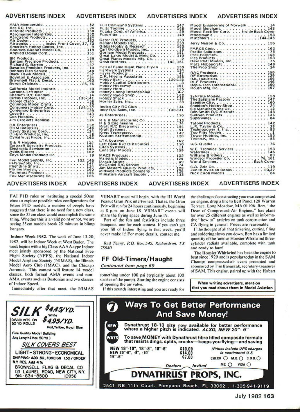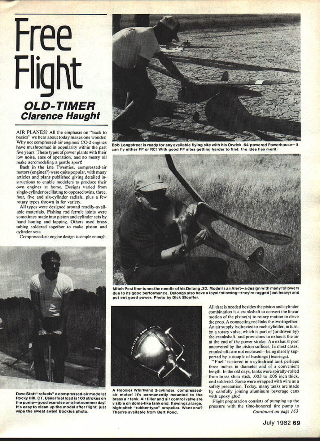 Free Flight OLD- TIMER Clarence Haught AIR PLANES emphasis hack basics hear about today makes wonden compressed-air engines CO-2 engines have mushroomed popularity within past five years types power plants low noise ease operation no messy oil make aeromodeling gentle sport Back late Twenties compressed-air motors engines quite popular articles plans published giving detailed structions enable modelers produce own engines home Designs varied singie-cylinder oscillating opposed twins three four five six-cylinder radials plus few rotary types thrown variety types designed around readily-avail able materials Fishing rod ferrule joints sometimes made piston cylinder sets hand honing lapping Others used brass tubing soldered together make piston cylinder sets Compressed-air engine design simple enough needed besides piston cylinder combination crankshaft convert linear motion pistons rotary motion drive prop connecting rod links two together An air supply directed cylinder turn rotary valve part ofor driven crankshaft provisions exhaust air end power stroke An exhaust port uncovered piston suffices cases crankshafts enclosedbeing merely sup ported couple bushings bearings Fuel stored cylindrical tank perhaps three inches diameter convenient length old days tanks spirally-rolled brass shim stick 003 006 inch thick soldered Some wrapped wire safety precaution Today tanks made carefully joining aluminum beverage cans epoxy glue Flight preparation consists pumping up pressure time-honored tire pump Continued page 163 July 198269 oo uiigstreei reauy tor avaimeome iiying Site witH Orwick 64-powered Powerhouseit can fly either FF RC good FF sites getting harder find idea has merit Mitcfl Post tine-tunesthe needle ot hIS L510fl9 1U MOOI ieria design followers due its good performance Delongs also have loyal followingtheyre rugged heavy put out good power Photo Dick Stouffer Dave Stottrefuels compressed-air model Rocky Hill CT Usual fuel load 100 strokes pumpgood exercise hot sum merday Its easy clean up model after flight just wipe sweat away Bockius photo Hoosier Whirlwind 3-cylinder compressed air motor Its permanently mounted brass air tank Air filler air control valve visible dome-like tank end swings large high-pitch rubber-type propeller Want Theyre available Bert Pond ADVERTISERS INDEX ADVERTISERS INDEX ADVERTISERS INDEX ADVERTISERS INDEX AMA Membership82 Ace RC Inc24 Aerolite Products150 Aeromarine Interprizes152 Aerotrend Products124 Air Design Airtronics Inside Front Cover 37 73 Americas Hobby Center Inc9 Andrews Aircraft Model Co119 Applied Design Corp151 BK Products159 Bantam Precision Products84 Richard G Barron157 Bavarian Precision Products Inc10 Behrens Plan Service149 Black Hawk Models157 Boynton & Associates154 Brownsell Flag & Decal163 Byron Originals25 76 California Model Imports10 Carolina-Taffinder128 Charlies R/C Goodies14 Circus Hobbies Inc136-141 George Clapp158 Columbia Model Crafts25 Consumers Hobby Corp126-1 27 Contempo Enterprises129 Coverite143 Cox Hobbies77 Jim Crockett Replicas124 DA Enterprises152 DGM Industries148 Davey Sy stems Corp134 Du-Bro Products Inc18 Dynathrust Props Inc163 E & R Hobbies132 Eastcraft Specialty Products161 Electronic Servicenter146 Addis Elmore162 Enya Model Products Co19 FAI Model Supply Inc132 146 FHS Supply Inc147 Flightline Shirts124 Flyline Models160 Fourmost Products156 Fox Manufacturing Co125 Full Command Systems147 Fults Tooling148 Futaba Corp America29 Futurfilte149 Gator R/C Products153 Gemini Models Inc153 Gibbs Hobby & Research160 Carl Goldberg Models Inc15 Gorham Model Products151 Great Lakes Model & Mold Co119 Great Planes Models Mfg Co2 Grish Brothers142 161 Hall Fame Giant Plane Flyln158 Hardware Systems134 Hayes Products47 DR Higgins Associates158 Hobby Barn 120-123 Hobby Capitol Distributors8 Hobby Hideaway161 Hobby Horn125 Hobby Lobby International4-7 Hobby Radio Shop162 Hobby Shack128 Homer Sales Inc28 Indian City RC Club134 Indy R/C Sales Inc130-131 J5 Enterprises156 K & B Manufacturing Co132 K & S Engineering74 Kraft R/C Electronics154 Kraft Systems51 Kress Technology132 Kustom Kraftsmanship128 LTA Systems162 Left Bank R/C Distributors150 Litco Systems11 Lone Star Models159 MACS Products132 Majestic Models124 Maxair Sports49 McDaniel R/C Service74 Jim Messers Quality Products128 Midwest Products Company128 Miniature Aircraft Supply133 Model Engineering Norwalk14 Model Merchant143 Model Rectifier Corp side Back Cover Modelmania153 Mutchiers144-145 Jerry Nelson & Co156 PARCS Club162 Pacific Sailpianes75 Peck-Polymers158 Pica Products153 Dave Platt Models Inc75 Plaza Hobbycraft148 Prop Shop24 RAC Products159 RF Enterprises129 RJL Industries156 RLF Products146 Repla-Tech International150 Roush Mfg Co157 Saf-Flite Models Sailplane Factory Satellite City Sheldons Hobby Shop Sig Manufacturing Co Bob Smith R/C Aircraft Sullivan Products rwings Tatone Products LR Taylor & Co Technopower II Inc. Top Flite Models r Hobbies Inc Twinn-K Inc US Quadra WE Technical Services Waterlines Williams Brothers Windsor Propeller Co World Engines - 150 147 24 13 - 148 135 84 - 28 - - 155 - 76 153 146 83 76 161 Back Cover CA Zaic Co119 Zenith Aviation Books2337 Nick Ziroli Models84 ADVERTISERS INDEX ADVERTISERS INDEX ADVERTISERS INDEX ADVERTISERS INDEX FAI FID rules instituting special 50cm class explore possible rules configurations future Fl D models number people have suggested no need new class since 35cm class would accomplish same thing Whether valid point seeing 35cm models break 25 minutes blimp hangars Indoor Week 1982 week June 13-20 1982 will Indoor Week West Baden week begins abigClass AAAA-type Indoor meet jointly sponsored National Free Flight Society NFFS National Indoor Model Airplane Society NIMAS Illinois Model Aero Club IMAC Chicago Aeronuts contest will feature 14 model classes both formal AMA events nonAMA events such Bostonian two classes Indoor Speed Immediately after meet NIMAS VITNART meet will begin III World Peanut Gran 