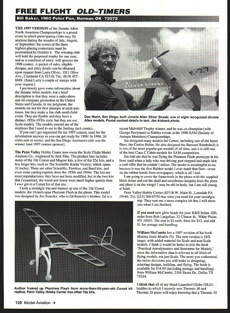 FREE FLIGHT OLD-TIMERS 111 THE 1997 VERSION Jimmie Allen North American Championships postal event participating clubs may fly anytime during months July August September scores three highest-placing contestants must postmarked October 6 winning club will hold perpetual trophy year condition entry will sponsor 1998 contest packet rules eligible designs entry details can obtained upon request Larry Oliver 1011 Olive Ave Coronado CA 92118 Tel 619 4378889 Send Larry couple stamps request previously gave some information about Jimmie Allen models brief description radio-show oil-company promotion United States Canada judgment models first attempts stick-andtissue make fun club small-field event flyable have distinct 1920s-1930s style Scale models models remind airplanes used see Smiling Jack comics cant get organized 1997 contest send information anyway can get ready 1998 1996 20 clubs sent scores San Diego Aeroneers club winner 1997 contest sponsor Penn Valley Hobby Center now owns Scale flight Model Airplane Co originated Jack Fike product line includes l0 Comet Megow kits few 25 kits few larger kits such Scientific Korda Victory spans 32 inches other Scientific Peerless Burd kits some catalog reprints 1930s 1940s kits exact reproductions have modified two kits examined wood tissue much higher quality ever got Comet kit era took nostalgia trip framed up l0 Comet models 16-inch-span Phantom flash photo model designed Joe Konefes Ed Konefess brother Ed recent Mulvihill Trophy winner co-champion George Perryman Rubber events 1996 SAM Society Antique Modelers Championships Joe designed models Comet including better fliers Curtiss Robin also designed Buzzard Bombshell popular gas models time still best Class C Cabin models SAM competition Joe told flying Phantom Flash prototype front yard lady driving past stopped made him cash offer couldnt refuse model meaningful because first Rubber model ever made fleweven rubber bands newspapers I am going cover framework photo supplied black tissue cut skull crossbones insignia plans place wings may old body am still young heart Penn Valley Hobby Center 837-B W Main St Lansdale PA 19446 Tel [215] 368-0770 has what need nostalgia trip sent complex kit will show am finished need new glow heads K&B Infant 020 order Bob Langelius 32 Clinton St White Plains NY 10603 cost $5 three $12 add $1 postage handling William McCombs has 1997 revision book Making Scale Models Fly new version 16% larger added material Scale non-Scale models think would better title book Practical Aerodynamics Structures Models since informative data relevant kinds flying models just Scale understand better decisions will make designing selecting designs building flying book available $1695 including postage handling William McCombs 2106 Siesta Dr Dallas TX 75224 think Hand-Launched Glider HLG buddies recently sent Thermic 18 Thermic 20 plans will enjoy knowing Thermic 18 122 Model Aviation Munn San Diego built Jimmie Allen Silver Streak eight recognized Jimmie Allen models Postal contest details text Jim Alaback photo Author framed up Phantom Flash more-than-50-year-old Comet kit replica Penn Valley Hobby Center has other 100 kits won HLG event 1996 SAM Championships believe best design competition have betterthan-average arm better-than-average building skills Hank Cole design available Bob Larsh 45 5 Whitcomb Ave Indianapolis IN 46241 Send him SASE 1$ ask HLG list want try modem Academy Model Aeronautics HLG competition get plan #201 magazine get corresponding article September 1977 issue Robert Dunhams highlycapable design has won first place National Aeromodeling Championships Nats other contests Jim OReilly has plans catalog includes several Old-Timer some modem Free Flight designs Jim highly competent draftsman uses CAD something else dont understand plans precise parts fit together Recent additions Jims catalog Alert 020 Replica 42-inch-span class Texaco sizes Swoose 19 09 recently SAM-approved sizes Coles Cirrus Cruiser Smoothie Rubber model Bob Cahills Hoosier Hiflier 1935 300 sq Rubber model perhaps first two-blade folding propeller catalog $2 Jim OReilly 4760 N Battin Wichita KS 67220 s ls s Precision Instruments FREE CATALOG __LArI-IES CAMPBELL TOOLS Co 2100-M Selma Rd Spnngfleld 044 45505 513-3224562 800 tutter orders L0Okifl tor nose gear solution Need 12 ii BEngIe MoeILengthslenLengthSIeC RE 300 43/1620 4091469 RE $60 351/6 43/16 4091469 RE400 43/16AO- 60$1469 RF450 451/6 43/16As- 60$1499 RE 500 2 43/1660- 9091636 RF610 243/97/3260- 1201975 RE 610 293/67/3260- 1291960 OF 710 243/97/3260- 12$1960 RF36J31065/3243/67/3240- 12$1999 RE 57J51075/3243/87/3240-12$2039 RE 7703/10953/1641/21/4 Gas$2057 RF07~L41/23/6 Ploase support hobby shop Direct add $3tO S&H USA Fults Tooliog P0 Box 155 Savoy IL 61874 TFAh @11 Glow Plugs Introduces NEW SUPER COOL Plug Hi Temp Insulator ony $209 addition . FIREBALL R/C IDLE BAR plug $209 Hot & Standard Non-Idle Bar plugs still $169 Swanson Associates PO Box 151 Since 9948 Wayne NJ 07470 clntroductory Class Created Specifically Scale Model Aircraft Paint Scheme & Features Which May Documented Are No Minimum Size Limitations AMA Weight & Engine Limits Apply SASE Info Pak Mr Ray Kelley Pres Fort Bend R/C Club 1011 Deerfield Road Richmond Texas 77468 Telephone 281 341 5397 6 8pm Mon thru Fri Fort Oen IVC Club July1997 123