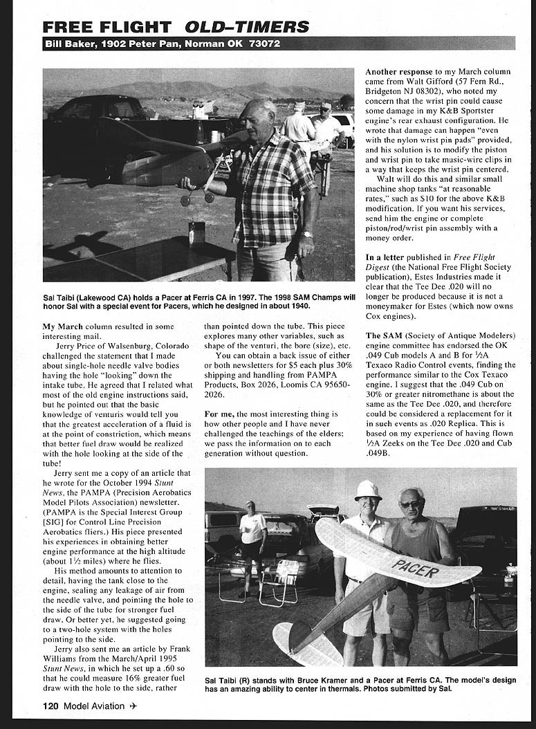 FREE FLIGHT OLD-TIMERS March column resulted some interesting mail Jerry Price Walsenburg Colorado challenged statement made about single-hole needle valve bodies having hole looking down intake tube agreed related what old engine instructions said pointed out basic knowledge venturis would tell greatest acceleration fluid point constriction means better fuel draw would realized hole looking side tube Jerry sent copy article wrote October 1994 Stunt News PAMPA Precision Aerobatics Model Pilots Association newsletter PAMPA Special Interest Group [SIG] Control Line Precision Aerobatics fliers piece presented experiences obtaining better engine performance high altitude about 11/2 miles flies method amounts attention detail having tank close engine sealing leakage air needle valve pointing hole side tube stronger fuel draw better yet suggested going two-hole system holes pointing side Jerry also sent article Frank Williams March/April 1995 Stunt News set up 60 50 could measure 16% greater fuel draw hole side rather pointed down tube piece explores other variables such shape venturi bore size etc can obtain back issue either both newsletters $5 plus 30% shipping handling PAMPA Products Box 2026 Loomis CA 956502026 interesting thing other people have never challenged teachings elders pass information generation question Another response March column came Walt Gifford 57 Fern Rd Bridgeton NJ 08302 noted concern wrist pin could cause some damage K&B Sportster engines rear exhaust configuration wrote damage can happen nylon wrist pin pads provided solution modify piston wrist pin take music-wire clips way keeps wrist pin centered Walt will similar small machine shop tanks reasonable rates such $10 above K&B modification want services send him engine complete piston/rod/wrist pin assembly money order letter published Free Flight Digest National Free Flight Society publication Estes Industries made clear Tee Dee 020 will no longer produced because moneymaker Estes now owns Cox engines SAM Society Antique Modelers engine committee has endorsed OK 049 Cub models B /2A Texaco Radio Control events finding performance similar Cox Texaco engine suggest 049 Cub 30% greater nitromethane about same Tee Dee 020 therefore could considered replacement such events 020 Replica based experience having flown /2A Zeeks Tee Dee 020 Cub 049B 120 Model Aviation Taibi Lakewood CA holds Pacer Ferris CA 1997 1998 SAM Champs will honor Sal special event Pacers designed about 1940 Sal Taibi R stands Bruce Kramer Pacer Ferris CA models design has amazing ability center thermals Photos submitted Sal New products report Toledo show Vintage Stunt Championships report Scepter CL Stunt Allen Brickhaus Model . Stan Alexander &itsy Visit web Site I/Ii//wsIIIa 22522 Auburn Dole Et Tom Ca 92630-5005 114 583 1455 received note Greg York 6326 Corwin Rd Waynesville OH 45068 Tel [513] 897-0311 indicating 32 cigar boxes ignition engine parts invited send him list needs SASE Jimmie Allen Postal contest information can obtained John AIling 30188 Air Flight Dr Valley Center CA 92082 have mentioned before bears repeating can get P&W Old-Timer kits via Aerodyne 1924 E Edinger Santa Ana CA 92705 Tel [714] 258-0805 Fax [714] 259-1025 What did make clear kits sold under Midway Models Co label also available products old Hobby Horn sad personal experience before run old engine integral tank check interior tank dirt debris interested receiving Stunt News PAMPA newsletter mentioned previously address subscriptions PAMPA 158 Flying Cloud Isle Foster City CA 94404 newsletter $20 second-class mail $35 firstclass mail dues expire December 31 might want start January 1999 issue Stunt News impressive publication features abundance Old-Time Stunt stuff has quality photo reproduction intend 1998 SAM Champs week September 14 see old flying buddies take photos main goal socialize See XIII Kit Features Wire Spoked Wheels Machine Gun Kit Fuil Cockpit Turubuckles & Hardware Color Plans Photo Package Scale Documents Book CNC Machined Laser Cut Parts 1/6 1/4 & 1/3 Scales FOR FULL LINE OF KITS AND ACCESSORIES ORDER YOUR CATALOG TODAY $500 CK MO VISA MC ARIZONA MODEL AIRCRAFTERS 14795 NORTH 78 WAY #800 SCOTTSDALE AZ 85260 TO PLACE ORDER CALL 602-348-3733 FAX ORDERS 602-348-3773 122 Modei Aviation Basics Two-Meter sailplane Leon Kincaid Hornet Aero Electric 3706 N 33rd St Galusburg MI 49053 Fax/Phone 616-665-9693 E-Mail neroelectricQwarldnetatt nut Enterprises easy applicotion V lightweight terniolo points br libergiass lobric proven contest arena Bee I99ee eex ee sound stress relief WALSTON RETRIEVAL SYSTEWf 725 Cooper Lake Rd SE Smyrna GA 30082 770-434-4905 NO-657-4672 Fax 770-431-0119 Visa AmEx
