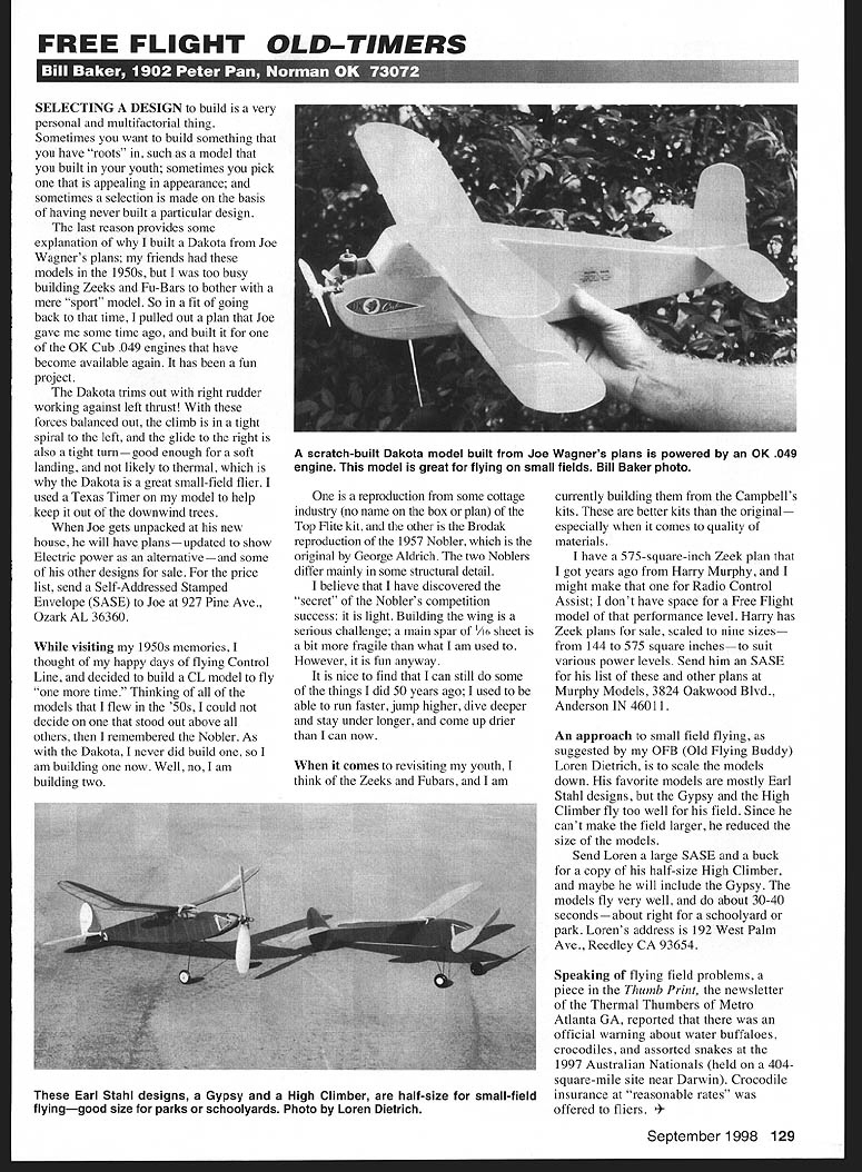 FREE FLIGHT OLD-TIMERS SELECTING DESIGN build very personal multifactorial thing Sometimes want build something have roots such model built youth sometimes pick appealing appearance sometimes selection made basis having never built particular design last reason provides some explanation built Dakota Joe Wagners plans friends models 1950s too busy building Zeeks Fu-Bars bother mere sport model So fit going back time pulled out plan Joe gave some time ago built OK Cub 049 engines have become available again has fun project Dakota trims out right rudder working against left thrust forces balanced out climb tight spiral left glide right also tight turngood enough soft landing likely thermal Dakota great small-field flier used Texas Timer model help keep out downwind trees Joe gets unpacked new house will have plansupdated show Electric power alternativeand some other designs sale price list send Self-Addressed Stamped Envelope SASE Joe 927 Pine Ave Ozark AL 36360 visiting 1950s memories thought happy days flying Control Line decided build CL model fly time Thinking of models flew 50s could decide stood out above others remembered Nobler As Dakota never did build am building now Well no lam building two reproduction some cottage industry no name box plan Top Flite kit other Brodak reproduction 1957 Nobler original George Aldrich two Noblers differ mainly some structural detail believe have discovered secret Noblers competition success light Building wing serious challenge main spar /16 sheet bit fragile what am used However fun anyway nice find can still some things did 50 years ago used able run faster jump higher dive deeper stay under longer come up drier can now comes revisiting youth think Zeeks Fubars am currently building Campbells kits better kits original especially comes quality materials have 575-square-inch Zeek plan got years ago Harry Murphy might make Radio Control Assist dont have space Free Flight model performance level Harry has Zeek plans sale scaled nine sizes 144 575 square inchesto suit various power levels Send him SASE list other plans Murphy Models 3824 Oakwood Blvd Anderson IN 46011 An approach small field flying suggested OFB Old Flying Buddy Loren Dietrich scale models down favorite models mostly Earl Stahl designs Gypsy High Climber fly too well field Since cant make field larger reduced size models Send Loren large SASE buck copy half-size High Climber maybe will include Gypsy models fly very well about 30-40 secondsabout right schoolyard park Lorens address 192 West Palm Ave Reedley CA 93654 Speaking flying field problems piece Thumb Print newsletter Thermal Thumbers Metro Atlanta GA reported official warning about water buffaloes crocodiles assorted snakes 1997 Australian Nationals held 404square-mile site near Darwin Crocodile insurance reasonable rates offered fliers ember 1998 129 scratch-built Dakota model built Joe Wagners plans powered OK 049 engine model great flying small fields Bill Baker photo Earl Stahl designs Gypsy High Climber half-size small-field flyinggood size parks schoolyards Photo Loren Dietrich