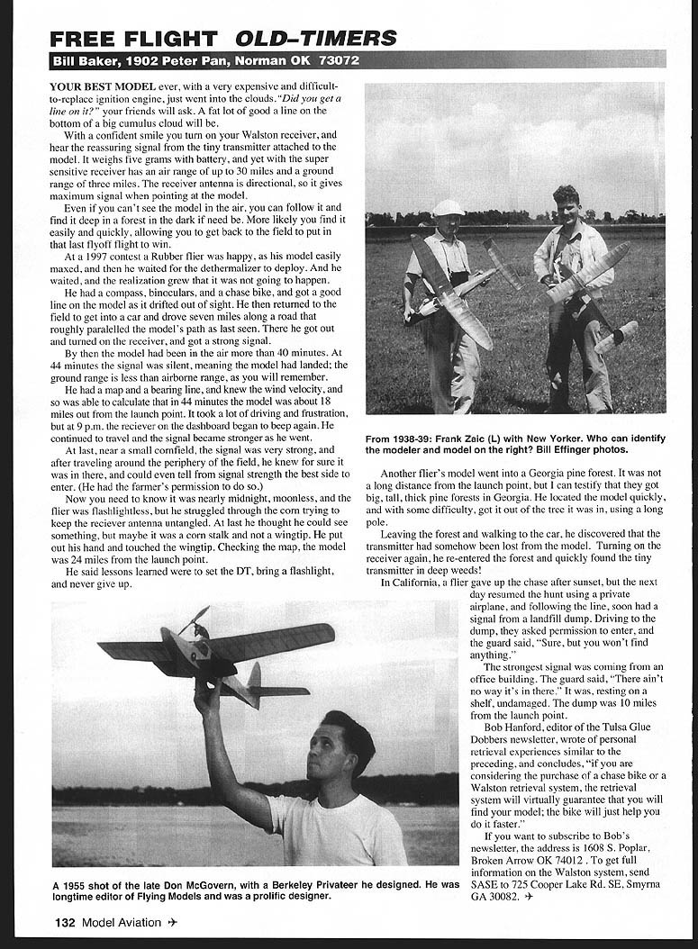FREE FLIGHT OLD-TIMERS j1 EE YOUR BEST MODEL ever very expensive difficultto-replace ignition engine just went clouds Did get line friends will ask fat lot good line bottom big cumulus cloud will confident smile turn Walston receiver hear reassuring signal tiny transmitter attached model weighs five grams battery yet super sensitive receiver has air range up 30 miles ground range three miles receiver antenna directional gives maximum signal pointing model cant see model air can follow find deep forest dark need likely find easily quickly allowing get back field put last flyoff flight win 1997 contest Rubber flier happy model easily maxed waited dethermalizer deploy waited realization grew going happen compass binoculars chase bike got good line model drifted out sight returned field get car drove seven miles along road roughly paralelled models path last seen got out turned receiver got strong signal model air 40 minutes 44 minutes signal silent meaning model landed ground range less airborne range will remember map bearing line knew wind velocity able calculate 44 minutes model about 18 miles out launch point took lot driving frustration 9 pm reciever dashboard began beep again continued travel signal became stronger went last near small cornfield signal very strong after traveling around periphery field knew sure could tell signal strength best side enter farmers permission Now need know nearly midnight moonless flier flashlightless struggled through corn trying keep reciever antenna untangled last thought could see something maybe corn stalk wingtip put out hand touched wingtip Checking map model 24 miles launch point said lessons learned set DT bring flashlight never give up Another fliers model went Georgia pine forest long distance launch point can testify got big tall thick pine forests Georgia located model quickly some difficulty got out tree using long pole Leaving forest walking car discovered transmitter somehow lost model Turning receiver again re-entered forest quickly found tiny transmitter deep weeds California flier gave up chase after sunset next day resumed hunt using private airplane following line soon signal landfill dump Driving dump asked permission enter guard said Sure wont find anything strongest signal coming office building guard said aint no way its resting shelf undamaged dump 10 miles launch point Bob Hanford editor Tulsa Glue Dobbers newsletter wrote personal retrieval experiences similar preceding concludes considering purchase chase bike Walston retrieval system retrieval system will virtually guarantee will find model bike will just help faster want subscribe Bobs newsletter address 1608 S Poplar Broken Arrow OK 74012 full information Walston system send SASE 725 Cooper Lake Rd SE Smyrna GA 30082 Model Aviation -39 Frank Zaic L New Yorker can identify modeler model right Bill Effinger photos 1955 shot late Don McGovern Berkeley Privateer designed longtime editor Flying Models prolific designer