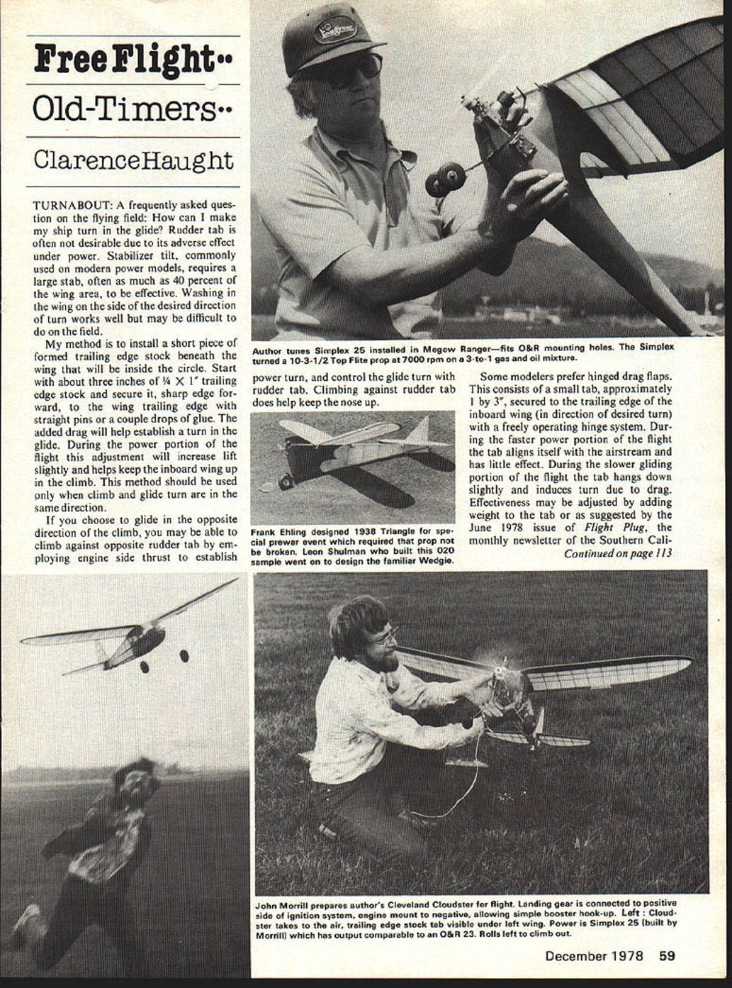 Free Flight Old-Timers ClarenceHaught TURNABOUT A frequently asked ques tion flying field can make ship turn glide Rudder tab often desirable due its adverse effect under power Stabilizer tilt commonly used modern power models requires large stab often much 40 percent wing area effective Washing wing side desired direction turn works well may difficult field method install short piece formed trailing edge stock beneath wing will inside circle Start about three inches Vt X 1 trailing edge stock secure sharp edge ward wing trailing edge straight pins couple drops glue added drag will help establish turn glide During power portion flight adjustment will increase lift slightly helps keep th Thoard wing up climb method should used climb glide turn same direction choose glide opposite direction climb may able climb against opposite rudder tab em ploying engine side thrust establish power turn control glide turn rudder tab Climbing against rudder tab does helo keeo nose up Some modelers prefer hinged drag flaps consists small tab approximately 1 3 secured trailing edge inboard wing direction desired turn freely operating hinge system Dur ing faster power portion flight tab aligns itself airstream has little effect During slower gliding portion flight tab hangs down slightly induces turn due drag Effectiveness may adjusted adding weight tab suggested June 1978 issue Flight Plug monthly newsletter Southern Cali Continued page 113 Author tunes Simplex 25 installed Megow Rangerfits O&R mounting holes Simplex turned 1O-3-i/2Top Flite prop atlOOO rpm ona 3-to-i gas oil mixture I-rank niing uesagouu cial prewar event requuruu u prop broken Leon Shulman built 020 sample went design familiar Wedgie AVAILABLE IN 2 SCALE SIZES LARGE FOR I-3/4---2 SCALE MODELS SMALL FOR I-1/41-/2 SCALE MODELS PICA PRODUCTS 2657 NE 188 ST. MIAMI FL 33180 t TELEPHONE 932-8008 gave us Peanut Scale Embryo En durance serious modelers have eyes first International Free Flight contest held Woodvale England August round out spectrum free-flight scale events such meeting has long needed Will continue blossom full recognized status RC CL events does will thanks group dedicated modelers put great deal effort organizing running participating memorable beginning Ranging Eric Coates winning superscale DH9a W Dennis daring twin-engined Handley Page HP 400 garnered second fine ships could make 30second qualifying flight wide variety models took part Terry Manly took home third Blackburn Swift Bill Hannans fine C02 Farman Moustique proxied fourth MacDonald S-21 rubber ship qualify flown fifth Joe Barnes Britains finest rubber fliers Finishing sixth last among qualifiers D Hunts C02 Comper Swift Rumors have Canada may next years site get going model now Dont scared off word international good solid stable flyable model has much chance seldom-flown superscale prone give problems Total entries numbered under 20 year notice participation can succeed becoming annual international official event TWA month Iron Mike Midkiffs rubber-powered wheels-up Hellcats coming legend Built Bill Hannan plans Flying Scale Models WW II $695 621 W 19th St Costa Mesa CA 92627 two Mikes mini-masterpieces have flown away five six-minute flights models span 21 weighed 12 14 oz out rubber 8 props 20 pitch turned 24 long motors two loops 3/16 flat rubber models both climbed left glided right Mike feels designs stability part due Navys insistence good low-speed handling characteristics time Hellcat service Hints tips photos TWAS welcome Bill Warner 423-C San Vicente Blvd Santa Monica CA 90402 FF Old Timer/H aught continued page 59 fornia Ignition Flyers floating drag tab Out wing can useful glide circle trim method some OT designs couple its disadvan tages however its simple field move out along wing fine tuning can get knocked off transporting just handling model SCAMPER Hugo Lung has solved problems nicely mounts tabs TE two tiny aligator clips piece wire 1/16 045 connects clips provides tab hinge wire can soldered clips after sleeving aluminum tubing tab attached wire can attached di rectly tab extended through clips washer soldered side clip hold unit together Simple functional neat Speaking newsletters August sue Informer distributed Central Indiana Aeromodelers has ex cellent article Bob Larsh Gold berg Zipper Editor Harry Murphy will glad send newsletter $300 per year Contact him 3824 Oakwood Blvd Anderson IN 46011 same issue CIA Informer reported OT HLG event First time ever event OT HLG drew 16 entries variety designs well dog-eared pages Zaic Yearbooks old model mags came some ra ther unorthodox looking creations includ ing couple twin-tailed weirdos also quite hilarious times listen grunts groans put forth over-40 gang attempting weakarm heave Heavens vintage model designs has admit December1978 113 IVE Weve done new innovative manufacturing process allows7 us reproduce authentic markings incredibly strong thin Mylar sheeting Pressure sensitive ease application colors fuel proof fade proof J decals will lay flat painted marking rich J assortment styles available ranging World War current insignias Look new decalci well other fine Pica Products hobby store Grumman Guardian XTB3F-28 / Class Carrier IBy IgCatalog25cRog Edwards DERNISTIC MODELS PO BOX 6974 ALBUG NM 87197 HLG designs have also come long way since concepts 30s uld say progress has made recent years Could also said Sweepette Zipper HLG Someone care tackle Im no expert subject Anyway proved interesting diversion gitem ready next year fellas Youve got winter thumb through auld mags books Whats Name Its interesting note names attached various contests Northwest various clubs have established traditional meets unusual names Strat 0 Bats Seattle RAG Meet rubber glider Boeing Hawks Power Bash allpower contest prizes clear last place based 6-flight total Misery Meet held February under un usual weather conditions varying fog sunshine everything between meet approximately 20 years old about Silents Please 