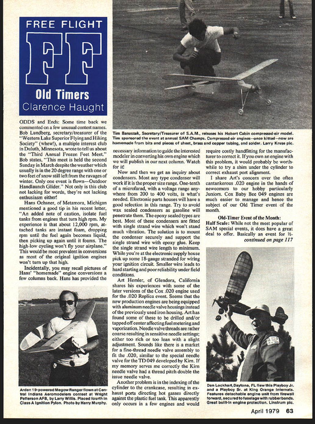 ODDS Ends Some time back commented few unusual contest names Bob Lundberg secretary/treasurer Western Lake Superior Flying Hiking Society whew multiple interest club Duluth Minnesota wrote tell us about Third Annual Frozen Feet Meet Bob states meet held second Sunday March despite weather usually 20 degree range two feet snow still left ravages winter Only event flownOutdoor Handlaunch Glider club lacking words theyre lacking enthusiasm either Hans Ochsner Metamora Michigan mentioned good tip recent letter An added note caution isolate fuel tanks engines turn high rpm experience about 12000 rpm tached tanks instant foam dropping rpm until fuel again becomes liquid picking up again until foams high-low cycling wont fly airplane would prevalent conversions original ignition engines wont turn up high Incidentally may recall pictures Hans homemade engine conversions few columns back Hans has provided necessary information guide interested modeler converting own engine will publish next column Watch Now get inquiry about condensers Most type condenser will work proper size range One-tenth microfarad voltage range 200 400 volts whats needed Electronic parts houses will have good selection range Try avoid wax sealed condensers gasoline will penetrate epoxy sealed types best Most condensers fitted single strand wire wont stand much vibration solution mount condenser securely support single strand wire epoxy glue Keep single strand wire length minimum youre electronic supply house pick up some 18-gauge stranded wiring ignition circuit Smaller wire leads hard starting poor reliability under field conditions Art Hemler Glendora California shares experiences some later versions Cox 020 engine used 020 Replica event Seems new production engines being equipped aluminum needle valve housings instead previously used iron housing Art has found some drilled and/or tapped off center affecting fuel metering vaporization Needle valve threads rather coarse resulting sensitive needle settings either too rich too lean slight adjustment Sounds like market fine-thread needle valve assembly fit 020 similar special needle valve TD 049 developed Kirn memory serves correctly Kirn needle valve thread pitch double issue needle valve Another problem indexing cylinder crankcase resulting ex haust ports directing hot gasses directly against plastic fuel tank apparently occurs few engines would require costly handfitting manufac turer correct own engine problem would probably worth try shim under cylinder correct exhaust port alignment share Arts concern over often cantankerous 020 engine hands newcomers hobby particularly Juniors Cox Baby Bee 049 engines much easier manage hence subject Old Timer event month Old-Timer Event Month Half Scale popular SAM special events does have great deal offer Basically event continued page 117 April 1979 63 Tim Banaszak Secretary/Treasurer SAM releases Hobart Cabin compressedair model Tim sponsored event annual SAM Champs Compressed4ir enginesonce kittednow homemade bits pieces sheet brass copper tubing solder Larry Kruse pic Arden 1 9-POWOOd Megow Hangertiownatcen tral Indiana Aeromodelers contest Wright Patterson AFB Larry Willis Placed fourth Class Ignition Pylon Photo Harry Murphy Dan LockhartDaytona FL flew Playboy Jr Playboy Sr King Orange Internata Features detachable engine unit firewall forward secured fuselage rubber bands Great built-In engine protection Linstrum plc its principal hard work application acrobatic training Jagdflieger schulen fighter pilot schools Luft waffe schools socalled hack aircraft fighter other squadrons Luftwaffe Jungmeisters lived died FF Old Timers/Haught continued page 63 scale Old Timers powered abundantly available 049 engine its popu larity has usurped 020 Rep lica event Contrary 020 Replica has become all-out competition event Half Scale still fun class feel event has greatest possibilities beginners event will argue service already being offered 020 Replica class dominated expensive TD 020 engine its often cantankerous disposition Half Scale other hand offers home cast-off engines plastic C/L trainers Baby Bee 049 offers ease starting readily available parts stocks can souped up nearly TD 049 performance replacing stock cylinder twin-intake-port cylinder TD 290 series en gines using ID glow head can adapted squeeze-off timer operation drilling two #35 holes side tank routing fuel pick up line needle valve inlet out through hole timer back tank fuel sport flying simply rotate tank until fill overflow lines horizon tal limit fuel capacity time total engine run stopwatch After deter mining run time manner flight engine runs regulated timing before releasing model thus avoiding cost timer give extra Baby Bees kid down block just itching get model airplanes -scale size requirement provides unlimited variety subjects intent rules old-time designs already just right 049 power make ideal subjects beginners Since special event flown national competitions allow full-size designs used local CD option basis Im referring designs like Musketeer 42 Taibis Winged Yankee Miss Tiny Rocketeers fact designs 09 19 en gine range readily adaptable Baby Bees will perform quite well have Musketeer 42 flies great Cox 290 special engine have flown ship competition combined Glow class popular Northwest could flown competition ignition engines using Glow engine run penalty rule Rules require construction tech niques same full-size counter part using appropriately smaller wood sizes course substitution sheet built-up structure allowed Clarence Haught Rt 5 Box 16 Coeur dAlene ID 83814 FF Duration/Meuser continued page 65 whatever method suits plane fancy appropriate shapes foam plastic represent wing tail surfaces fuselage intended super-model Cover surfaces grade number layers Silkspan appropriate task using dilute white glue Reinforce highstress points bit plywood finish off whole shebang Pactra Formula-U perhaps some other space-age hardening fuel-proofing coat ing have mo