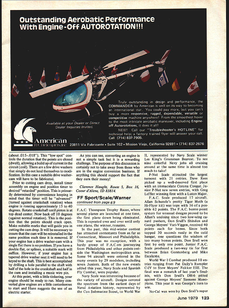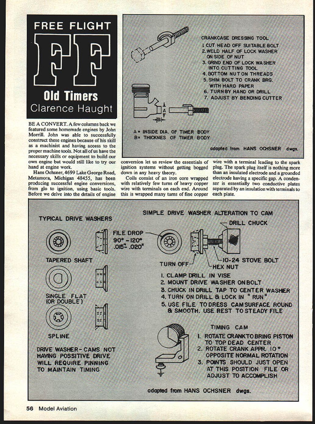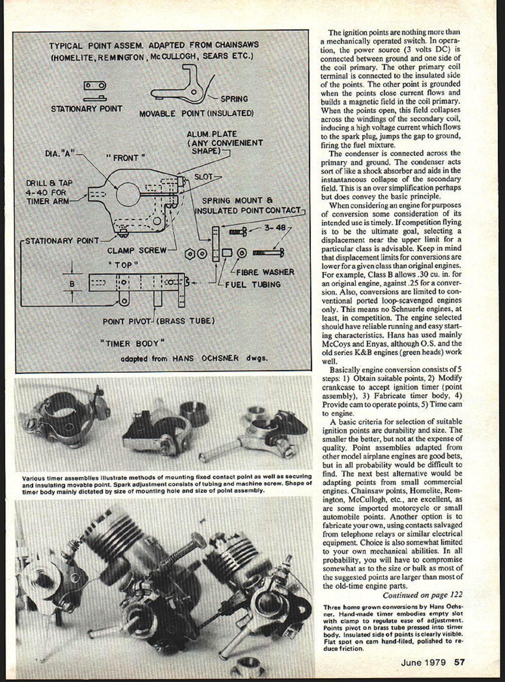 56 Model Aviation BE CONVERT few columns back featured some homemade engines John Morrill John able successfully construct engines because skill machinist having access proper machine tools us have necessary skills equipment build own engine would still like try hand engine work Hans Ochsner 4699 Lake George Road Metamora Michigan 48455 has producing successful engine conversions glo ignition using basic tools Before delve details engine conversion let us review essentials wire witn terminal leading spark ignition systems getting bogged plug spark plug itself nothing down heavy theory insulated electrode grounded Coils oonsist iron core wrapped electrode having specific gap conden relatively few turns heavy copper ser essentially two conductive plates wire terminals end Around separated insulation terminals wrapped turns fine oopper plate ignition points nothing mechanically operated switch opera tion power source 3 volts DC connected between ground side coil primary other primary coil terminal connected insulated side points other point grounded points close current flows builds magnetic field coil primary points open field collapses across windings secondary coil inducing high voltage current flows spark plug jumps gap ground firing fuel mixture condenser connected across primary ground condenser acts sort like shock absorber aids instantaneous collapse secondary field over simplification perhaps does convey basic principle considering engine purposes conversion some consideration its intended use timely competition flying ultimate goal selecting displacement near upper limit particular class advisable Keep mind displacement limits conversions lower given class original engines example Class B allows 30 cu original engine against 25 conver sion Also conversions limited con ventional ported loop-scavenged engines means no Schnuerle engines least competition engine selected should have reliable running easy start ing characteristics Hans has used mainly McCoys Enyas although OS old series K&B engines green heads work well Basically engine conversion consists 5 steps 1 Obtain suitable points 2 Modify crankcase accept ignition timer point assembly 3 Fabricate timer body 4 Provide cam operate points 5 Time cam engine basic criteria selection suitable ignition points durability size smaller better expense quality Point assemblies adapted other model airplane engines good bets probability would difficult find next best alternative would adapting points small commercial engines Chainsaw points Homelite Rem ington McCullogh etc excellent some imported motorcycle small automobile points Another option fabricate own using contacts salvaged telephone relays similar electrical equipment Choice also somewhat limited own mechanical abilities probability will have compromise somewhat size bulk suggested points larger old-time engine parts Continued page 122 Three home grown conversions Hans Oclis ner Hand-made timer embodies empty slot clamp regulate ease adjustment Points pivot brass tube pressed timer body Insulated side points isclearly visible Flat spot cam hand-filed polished re duce friction June1979 57 Various timer assemblies illustrate methods mounting fixed contact point well securing insulating movable point Spark adjustment consists tubing machine screw Shape timer body mainly dictated size mounting hole size point assembly EAA members receive SPORT VIA TION magazine ANNUAL DUES $2500 FOR FREE BROCHURE WRITE EXPERIMENTAL AIRCRAFT EA ASSOCIATION INC PO Box 229-A Hales Corners Wisconsin 53130 ial T AIRCRAFT YOU CAN BUILD pp XPERIMENI E AIR CRAFT ASSOCIATION issue Homebuilders Corner ers Editor Hot Line Headquarters Oshkosh Countdown Headquarters Comment fits EAAs Divisions tplane Builder tsmans Corner Building Line Past Members Building 25 Years Ago Out Geometry Differential Belicrank Stroke Engine Today Chapters Action cs Fury N27MS November Two Seven Mike Sally Racer on Accent a-Light Noneybee bergh Commemorative Tour ress Report No 10 Board Directors Meeting Calendar Events ington Report non-subscribers So rules 1 The balsa permitted 3 6 piece ordinary 1/32 sheetno special Indoor stock covering must done 12 X 12 piece ordinary Japanese tissueno superlight pre-war superfine similar stuff 2 Use wire plastic teflon rubber steel aluminum lead dope glue plasticene fiberglass desire 3 You may use styrofoam condenser paper helium hydrogen microfilm ad ditional balsa tissue 4 Model may size configura tion rubber powered hand launched 5 You must give model name supply simple set plans 6 No cheating allowed 7 Models cannot returned Prizes offered best duration unique unusual model best work manship Models must mailed Earl VanGorder 10 Brothers Road Wappin gem Falls NY 12590 before third Thursday January Characteristically models entered take few hours build can build two once have mind little time returning contes tants isnt really worth hassle After contest winners displayed largest local hobby shop others go beginners groups local schools teachers use demonstration students copy learn few tricks What better end Models range ridiculous quite Super-duration models can built within rules cutting wood narrow strips ribs spars tips using wider strips build hollowbox motor stick assembling scaled-down Easy B Pennyplane-type model something other end scale see photo Bill Warners Flying Man inspired 1909 French cartoon titled men become birds birds become men Let imagination wander list entrants winners will sent participants will appear column Bob Meuser 4200 Gregory St Oak land CA 94619 FF Old Timers/Haught continued page 57 Size selected point assembly will also affect mounting engine available space front crank case ahead intake port area will probably need truing up provide smooth round surface timer assembly best accomplished lathe keeping mind minimum machine tool operation other methods available Hans suggests simple tool made bolt half ofa lock washer requires welding brazing service should avai