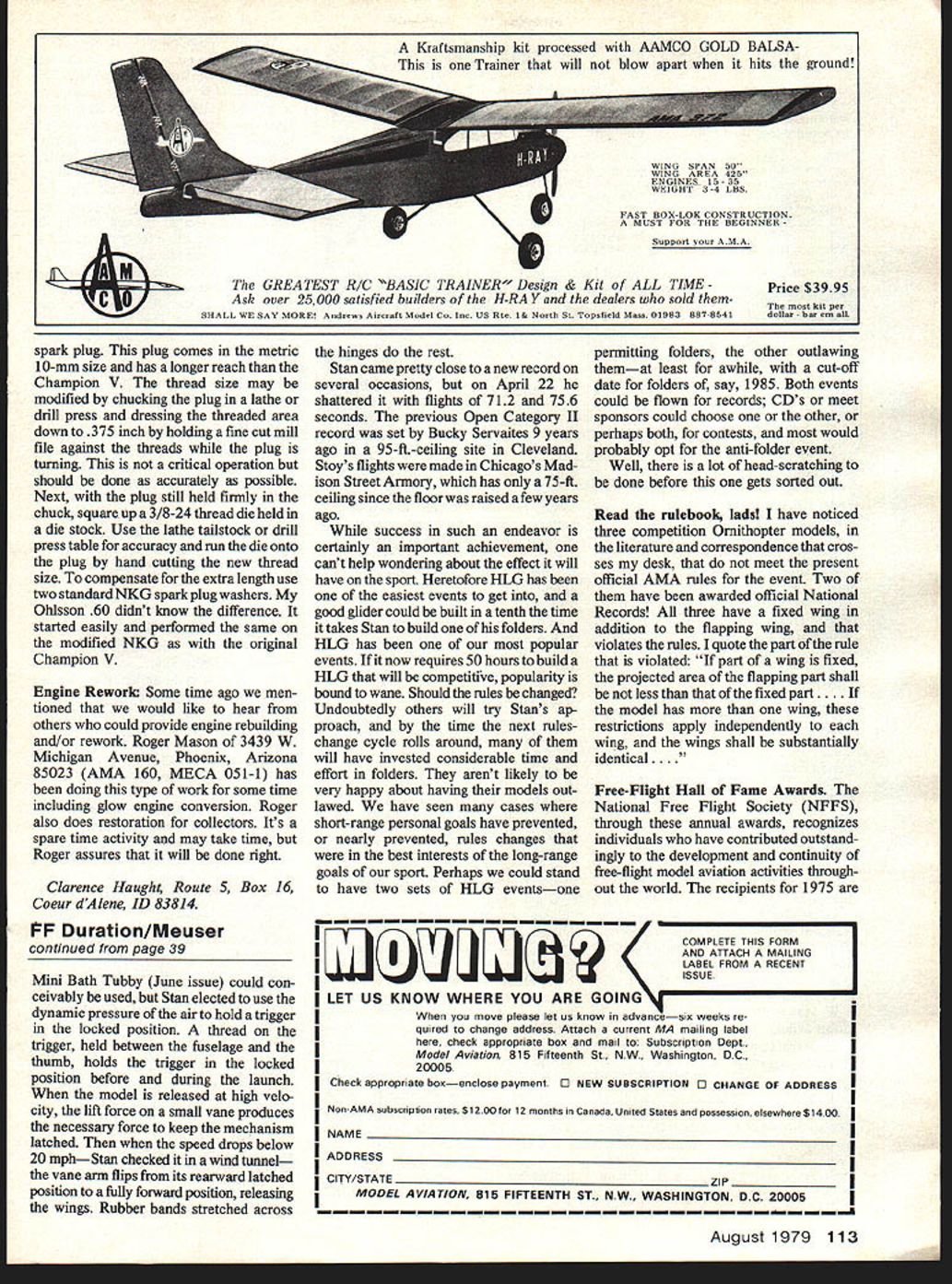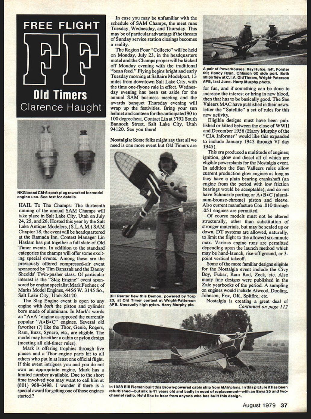 HAIL Champs thirteenth running annual SAM Champs will take place Salt Lake City Utah July 2425 26 Hosted year Salt Lake Antique Modelers SLAM SAM Chapter 18 eventwillbe headquartered Ramada Inn Contest Manager Lin Haslam has put together full slate Old Timer events addition standard categories champs will offer some excit ing special events Among previously offered compressed-air event sponsored Tim Banazak Danny Sheelds Twin-pusher class particular interest Slag Engine event spon sored engine specialist Mark Fechner Marks Model Engines 4456 W 3145 So Salt Lake City Utah 84120 Slag Engine event open engine both piston cylinder bore made aluminum Marks words AA engine opposed currently popular AeBeC engines Several old favorites Thor Genie Rogers Ram Buzz Syncro etc eligible model may either cabin pylon design meeting old-timer rules Mark offering trophies through five places Thor engine parts kit others put least official flight event intrigues you own appropriate engine Mark has limited number available Due short time involved may want call him 801 9683498 wonder special award getting engines started case may unfamiliar schedule SAM Champs meet runs Tuesday Wednesday Thursday may particular advantage threats Sunday service station closings becomes reality Region Four Collecto will held Monday July 23 headquarters motel Champs proper will kicked off Monday evening traditional bean feed Flying begins bright early Tuesday morning Saltaire Modelport 13 miles downtown Salt Lake City time one-flyone rule effect Wednes day evening has set aside annual SAM business meeting awards banquet Thursday evening will wrap up festivities Bring sun helmet canteen anticipated 90 100 degree heat ContactLin 3792 South Bannock Street Salt Lake City Utah 94120 See Nostalgia Some folks might say need event Old Timers pair Powerhouses Ray Hulce left Forster 99 Randy Ryan Ohlsson 60 side port Both ships flew CIA Old Timers WrIght-Paterson AFB last June Harry Murphy photo fun something can done increase interest bring new blood has basically good San Valeers MAC have published news letter Satellite set rules new activity Eligible designs must have pub lished kitted between close WWII December 1956 Harry Murphy CIA Informer would like expanded include January 1943 through VJ day 1945 era produced multitude engines ignition glow diesel eligible powerplants Nostalgia event addition San Valleers rules allow current production glow engines long have plain bearing crankshaft engine period low friction bearings would acceptable have Schnuerle porting ABC alumi num-bronze-chrome piston sleeve Also current manufacture Cox 010 through 051 engines permitted course models must altered structurally other substitution stronger materials may scaled up down DT systems allowed naturally limit flight allowed six-minute max Various engine runs permitted depending upon launch method may hand-launch rise-off-ground 3point vertical takeoff Some familiar designs eligible Nostalgia event include Civy Boy Fubar Ram Rod Zeek etc Also fine designs published Zaic yearbooks period sampling engines would include Atwood Dooling Johnson Fox OK Spitfire etc Nostalgia creating great deal CrnffinLedn, 12 August 1979 37 NK brand CM-S spark plug reworked model engine use See text details ulil Heuter new Demon powered bi 23 Old Timer contest Wright-Patterson AFB Unusually high pylon Harty Murphy plc 1938 BIll Plersen built Brown-powered cabin ship MAN plans ih tnis picture nas Deen refurbishedbut silk 1841 years old badly need replacementwith Enys 35 twochannel radio Hed like hear anyone has built design SCALE CLASCICS 7-4 Plans & Construction Manual CURTISS HAWK POESTINSON RELIANT SR9 Scala 54o Span $220 /o Scale 126 Span250 2Scala 83 Span 12 2Scal BA Span1810 1 Scale 4713Span jQ8O uS Scala 63 Span1280 CURTISS GOSHAWK P1100 2 Scale 83 SpatSf590 CURTISS GULFHAWK lA . 2Scal 63 Span S160O Scala 94/i Span S3OP pleas Add SISO P 00 Pstoead Ilandllog. 001500 US Add SOsMka eli PaymOOts tO Richard G Barron1213 Holly SprIng L Grand Blanc MIchIgan 46439 Sood 11cc COmplete I0t0atIc offset will help transition initiating left turn soon engine cuts will assist tilt left glide glide circle originally set right glide increase stabilizer tilt However may also necessary decrease wash-in stab tilt does make model turn right wash-in reduced readjust climb using right rudder required bank right climb pylon designs wash-out left main wing panel stabilizer tilt left glide turn wash-out becomes effec tive upwind due decreased speed stabilizer tilt trying overpower wing forces cant quite make fore increase stabilizer tilt left glide turn careful use too much tilt could cause model unstable glide turn Too much tilt would increase turn washed-out wing upset gust wind could cause dive left pylon designs no wash-in wash-out use left vertical fin rudder offset high-thrust-line designs stabilizer tilt enough keep model turning left right case may Also left rudder tab offsct may affecting turn speed increases downwind causing some wandering Increase tilt either left right turn case may Problem 7 Model grooves full engine run shallower angle like also makes about ht turn during full 12 seconds want least 1 1 turns transition good glide too fast nose down problem involves Lateral axis pylon models overall nosedown tendency caused insufficient de calage Increasing decalage de creasing positive angle incidence stabilizer will raise nose up climb glide decalage increased also increases tendency model turn right climb conversely decrease turn right left glide Therefore decreasing de calage will result increasing right turn climb desired ito 1 turns slow up sink rate glide Adjust glide turn stabilizer tilt Problem 8 Model grooves steep right climb transition perfect glide turn perfect occasional slight stall problem involves Lateral axis pylon designs high-thrust models easy problem cure however fliers fight cure Simply add little weight nose reduce stall Youd surprised alibis used keep 