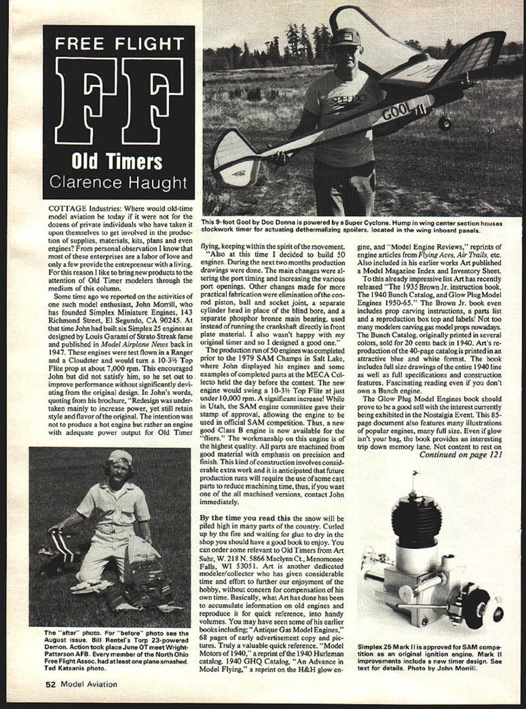 COTTAGE Industries would old-time model aviation today dozens private individuals have taken upon themselves get involved produc tion supplies materials kits pians engines personal observation know enterprises labor love few provide entrepreneur living reason like bring new products attention Old Timer modelers through medium column Some time ago reported activities such model enthusiast John Morrill has founded Simplex Miniature Engines 143 Richmond Street El Segundo CA 90245 time John built six Simplex 25 engines designed Louis Garami Strato Streak fame published Model Airplane News back 1947 engines test flown Ranger Cloudster would turn 10-3 Top Flite prop about 7000 rpm encouraged John did satisfy him set out improve performance significantly devi ating original design Johns words quoting brochure Redesign under taken mainly increase power yet still retain style flavor original intention produce hot engine rather engine adequate power output Old Timer flying keeping within spirit movement Also time decided build 50 engines During next two months production drawings done main changes al tering port timing increasing various port openings Other changes made practical fabrication elimination conrod piston ball socket joint separate cylinder head place blind bore separate phosphor bronze main bearing used instead running crankshaft directly front plate material also wasnt happy original timer designed good production run 50 engines completed prior 1979 SAM Champs Salt Lake John displayed engines some examples completed parts MECA Col lecto held day before contest new engine would swing 10-3 Top Flite just under 10000 rpm significant increase Utah SAM engine committee gave stamp approvai allowing engine used official SAM competition Thus new good Class B engine now available fliers workmanship engine highest quality parts machined good material emphasis precision finish kind construction involves consid erable extra work anticipated future production runs will require use some cast parts reduce machining time thus want machined versions contact John immediately time read snow will piled high parts country Curled up fire waiting glue dry shop should have good book enjoy can order some relevant Old Timers Art Suhr W 218 N 5866 Maclynn Ct Menomonee Falls WI 53051 Art another dedicated modeler/collector has given considerable time effort further enjoyment hobby concern compensation own time Basically what Art has done has accumulate information old engines reproduce quick reference handy volumes may have seen some earlier books including Antique Gas Model Engines 68 pages early advertisement copy pic tures Truly valuable quick reference Model Motors 1940 reprint 1940 Hurleman catalog 1940 GHQ Catalog An Advance Model Flying reprint H&H glow engine Model Engine Reviews reprints engine articles Flying Aces Air Trails etc Also included earlier works Art published Model Magazine Index Inventory Sheet already impressive list Art has recently released 1935 Brown Jr instruction book 1940 Bunch Catalog Glow Plug Model Engines 1950-65 Brown Jr book includes prop carving instructions parts list reproduction box top labels too modelers carving gas model props nowadays Bunch Catalog originally printed several colors sold 20 cents back 1940 Arts re production 40-page catalog printed attractive blue white format book includes full size drawings entire 1940 line well full specifications construction features Fascinating reading dont own Bunch engine Glow Plug Model Engines book should prove good sell interest currently being exhibited Nostalgia Event 85page document also features illustrations popular engines full size glow isnt bag book provides interesting trip down memory lane content rest Continued page 121 52 Model Aviation 9-foot Gool Doe Donna powered Super Cyclone Hump wing center section houses clockwork timer actuating dethermalizing spoilers located wing inboard panels ~after photo lor betore photo see August issue Bill Rentals Torp 23-powered Demon Action took place June OT meet WrightPatterson AFB member North Ohio Free Flight Assoc least plane smashed Ted Katsanis photo Simplex 25 Mark II approved SAM compe tition original ignition engine Mark II improvements include new timer design See text details Photo John Morrill writers two full columns Gieseke Nobler checked Bob Gieseke before publication appeared Model vi ation December 1976 January 1977 Lets remember Bob has built bakers dozen airplanes has used wingspans 48 53 74 plane used Nationals FAI tryouts supposed have 525-in span Now lets face Id bet wing spans would fly just great average stunt flier especially someone going rely kit airplane first place So just build stock kit plan Remember will probably need fourounce tank todays engines make removable tank compartment can adjust engine fuel Bob doesnt like remov able tanks whole lot other great fliers novice certainly good idea Tom Dixon has completed couple very good Noblers-Gieseke Noblers has utilized Bobs plans ideas Tom says start out may want substitute fuselage sides flaps wing planking new fuselage sides would made notches formers As far wing goes build plans Tom says make trailing edge cap i x 2 stock trim after TE planking stalled supposed make easier keep trailing edge straight Make flaps straight stock Also make hollowed block tips Tom also advises utilizing 1/32 ply doublers around trailing edge wing fuselage sides Speaking strength Tom says replace sheeted top front fuselage sheet spinner cockpit hollow will help much absorbing vibration stress says Tom also advises using 8-in Sig canopy cut fit Tom also suggests changing cowling sepa ration line substituting fuselage sides straight separation line middle spinner point approximately five inches nose ring makes tank muffler installation easier Tom states best Nobler ever built stock dimensions except foam wing squared-otT tips 505 span Bob Gieseke assures everyone uses exact tail moment arm shown plans Using new Top Flite k