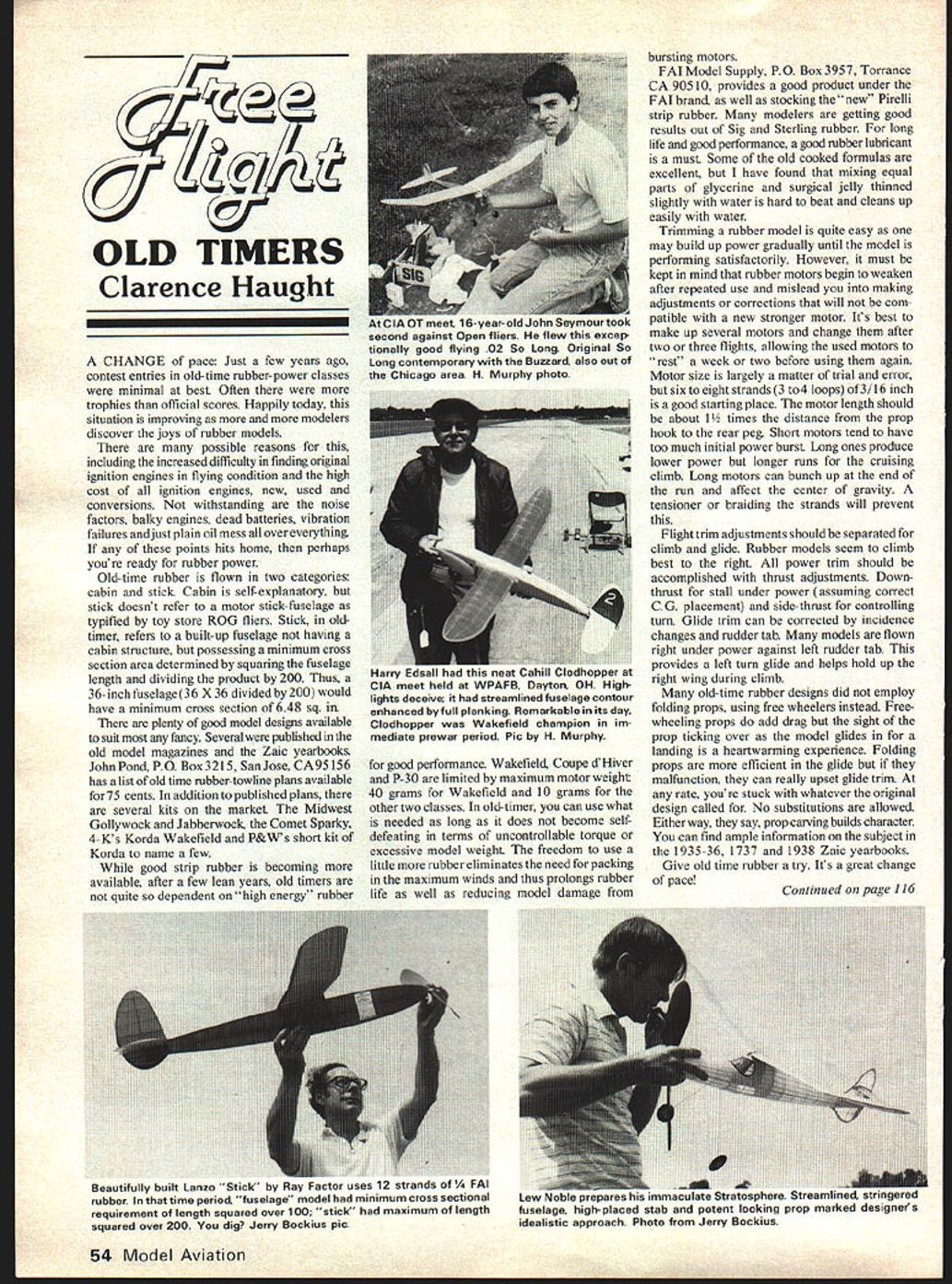 OLD TIMERS Clarence Haught CHANGE pace Just few years ago contest entries old-time rubber-power classes minimal best Often trophies official scores Happily today situation improving more modelers discover joys rubber models possible reasons including increased difficulty finding original ignition engines flying condition high cost ignition engines new used conversions withstanding noise factors balky engines dead batteries vibration failures just plain oil mess over everything points hits home perhaps youre ready rubber power Old-time rubber flown two categories cabin stick Cabin self-explanatory stick doesnt refer motor stick-fuselage typified toy store ROG fliers Stick oldtimer refers built-up fuselage having cabin structure possessing minimum cross section area determined squaring fuselage length dividing product 200 Thus 36-inch fuselage 36 X 36 divided 200 would have minimum cross section 648 sq plenty good model designs available suit fancy Several published old model magazines Zaic yearbooks JohnPond PO Box3215 SanJose CA95156 has list old time rubber-towline plans available 75 cents addition published plans several kits market Midwest Gollywock Jabberwock Comet Sparky 4-Ks Korda Wakefield P&Ws short kit Korda name few good strip rubber becoming available after few lean years old timers quite dependent high energy rubber good performance Wakefield Coupe dHiver P-30 limited maximum motor weight 40 grams Wakefield 10 grams other two classes old-timer can use what needed long does become selfdefeating terms uncontrollable torque excessive model weight freedom use little rubber eliminates need packing maximum winds thus prolongs rubber life well reducing model damage bursting motors FAI Model Supply PO Box 3957 Torrance CA 90510 provides good product under FAI brand well stocking the~ new Pirelli strip rubber modelers getting good results Out Sig Sterling rubber long life good performance good rubber lubricant must Some old cooked formulas excellent have found mixing equal parts glycerine surgical jelly thinned slightly water hard beat cleans up easily water Trimming rubber model quite easy may build up power gradually until model performing satisfactorily However must kept mind rubber motors begin weaken after repeated use mislead making adjustments corrections will com patible new stronger motor Its best make up several motors change after two three flights allowing used motors rest week two before using again Motor size largely matter trial error six eight strands3 to4 loops 3/16 inch good starting place motor length should about 1 times distance prop hook rear peg Short motors tend have too much initial power burst Long ones produce lower power longer runs cruising climb Long motors can bunch up end run affect center gravity tensioner braiding strands will prevent Flight trim adjustments should separated climb glide Rubber models seem climb best right power trim should accomplished thrust adjustments Downthrust stall under power assuming correct CG placement side-thrust controlling turn Glide trim can corrected incidence changes rudder tab models flown right under power against left rudder tab provides left turn glide helps hold up right wing during climb old-time rubber designs did employ folding props using free wheelers instead Free wheeling props add drag sight prop ticking over model glides landing heartwarming experience Folding props efficient glide malfunction can really upset glide trim rate youre stuck whatever original design called No substitutions allowed Either way say prop carvingbuilds character can find ample information subject 1935-36 1737 1938 Zaic yearbooks Give old time rubber try Its great change pace Continued page 116 Beautifully built Lanzo Stick Ray Factor uses IL ssranos oi z rubber time perio4 fuselage model minimum cross sectionalewprpar n uirement length squared over 100 stick maximum lengthfuselage high placed stab potent looking prop marked designers squared over 200 dig Jerry Bockius picidealistic approach Photo Jerry Bockius 54 Model Aviation meet 16-year-old John Seymourtook second against Open fliers flew excep tionally good flying 02 So Long Original So Long contemporary Buzzard also out Chicago area H Murphy photo ahiIl Clodhopper CIA meet held WPAFB Dayton OH High lights deceive streamlined fuselage contaur enhanced full planking Remarkable its day Clodhopper Wakefield champion im mediate prewar period Pic H Murphy EAA members receive SPORT VIA TION magazine EXPERIMENTAL AIRCRAFT ASSOCIATION INC PO Box 229 Hales Corners Wisconsin 53130 EXPERIMENTAL A SSOCIATION issue Homebuilders Corner ers Editor Line Headquarters involvement 80 osh 79 Energy Ultralights osh Awards 79 Chapters Action tplane Builder on Accent nes Oshkosh a Over Oshkosh Jim Theis Nighthawk Pegasus. Grand Champion Thoroughbred Glanville Skymaster osh 79 Custombuilts rve Grand Champion Humbug osh 79 500 Bowers Baker-Faick Competition etitor Flying L-B-F 500 Members Are Building ng Flea ndar Events Washington Report SpecialSPORT AIRCRAFT YOU CAN BUILD$495 pp CLEVELAND GIANTS ds Largest Gas Plans Assortment 86 C-D GIANTS OVER S MOST EVERY IMAGIN TO 10 NOW AVAILABLE ABLE TYPE PLANE AND 140 Others n Ga 5,IN MANY SCALES9t. 6#/ooo C6 Cob, 526 69L,dkeg NT-211 $24 .. 64 teed C17E SMg $36 91 Li,dbege N0-211 $36 W 96 Beech C17-B Soo$49 61 AEG OIV LI Bo, $24 82 Lock II Elec,$32 10$ P0 ci P019 T$49 t4 SEc,, T/W SE-7 $24 68 Joolce oJU88 to, $24 126 Sjoon T/W $87 $22 66 PIo,oo B ood W29 $20 59 EciDol Plc P2E$20 90 Woco Tope W 08 $22 78 Orcolol Plc P2-B$29 76 Bycd Po4 Tcinc $26. 64 Reococj SpoedI $24 114 Bycd P04 TcIol $48 74 TL Peco Spec $29 78 Ococc J2P Sock $48 62 Skycookel XP5P-1 $20 80 Siec0,oSoE DIV $22 6$ Roo,ko Norricoce $24 117 Golko DiV 80, $39 74 Rep SeoBee An $26 10$ SikocS2tAcopIc $39 80 Gcoo OBE Ace,g $32 80 MorOn 74 T4M-1 $36 * 106 Pipec J2 Cob $49 7$ 9-Pogo 0400 Eocc $28 98 Lock Hodoon B,, $26 18804on 4 62Gro, P6P HelIcal $28 71 L 77000ng t17GPoI$29 640 7 103 Boo 0170 P01 $49 