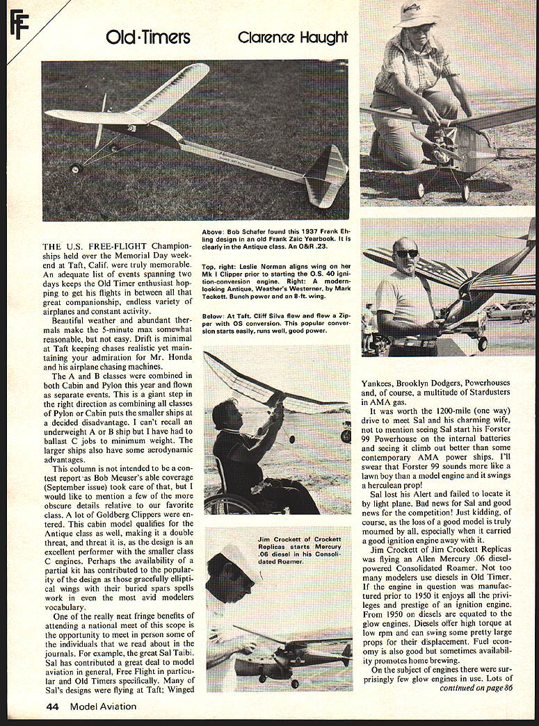 Old Timers THE US FREE-FLIGHT Champion ships held over Memorial Day week end Taft Calif truly memorable An adequate list events spanning two days keeps Old Timer enthusiast hop ping get flights between great companionship endless variety airplanes constant activity Beautiful weather abundant ther mals make 5-minute max somewhat reasonable easy Drift minimal Taft keeping chases realistic yet main taining admiration Mr Honda airplane chasing machines B classes combined both Cabin Pylon year flown separate events giant step right direction combining classes Pylon Cabin puts smaller ships decided disadvantage cant recall underweight B ship have ballast C jobs minimum weight larger ships also have some aerodynamic advantages column intended con test report Bob Meusers able coverage September issue took care would like mention few obscure details relative favorite class lot Goldberg Clippers en tered cabin model qualifies Antique class well making double threat threat design excellent performer smaller class C engines Perhaps availability partial kit has contributed popular ity design gracefully ellipti cal wings buried spars spells work avid modelers vocabulary really neat fringe benefits attending national meet scope opportunity meet person some individuals read about journals example great Sal Taibi Sal has contributed great deal model aviation general Free Flight particu lar Old Timers specifically Sals designs flying Taft Winged Clarence Haught Top right Leslie Norman aligns wing Mk Clipper prior starting OS 40 igni tion-conversion engine Right modernlooking Antique Weathers Westerner Mark Tackett Bunch power 8-ft wing Below At Taft Cliff Silva flew flew Zip per OS conversion popular conver sion starts easily runs well good power Yankees Brooklyn Dodgers Powerhouses course multitude Stardusters AMA gas worth 1200-mile way drive meet Sal charming wife mention seeing Sal start Forster 99 Powerhouse internal batteries seeing climb out better some contemporary AMA power ships Ill swear Forster 99 sounds like lawn boy model engine swings herculean prop Sal lost Alert failed locate light plane Bad news Sal good news competition Just kidding course loss good model truly mourned especially carried good ignition engine away Jim Crockett Jim Crockett Replicas flying Allen Mercury 06 dieselpowered Consolidated Roamer too modelers use diesels Old Timer engine question manufac tured prior 1950 enjoys privi leges prestige ignition engine 1950 diesels equated glow engines Diesels offer high torque low rpm can swing some pretty large props displacement Fuel econ omy also good sometimes availabil ity promotes home brewing subject engibes sur prisingly few glow engines use Lots continued page 86 44 Model Aviation Above Bob Schafer found 1937 Frank Eh ling design old Frank Zaic Yearbook clearly Antique class An O&R 23 RU DV OII4GSPAB FOR RUBBED COD DR DID ROWER BIT OF NOSTALGIA AMERICANBIDSBESS BELLANCA SSICS SkTrockpl iIIhIDIt..SIIIISN NASFAN 049 FDWER FORV P/~R CU5 ROBNS N CONTROL OF TO THREESS WINGSPAN 020 FOBEB FOR FREE - S C TROD CLASAIC AIRFLIGhT OR RADIO CONTROL EtMAL2GLO B FROGTOESOLDEN EDO ~NBBB S ANDFLYLINE MODELS ACER'V10643 ASHBY FL FAIRFAX VA 22030 FF Old-Timers/Haught continued page 44 Ohissons Cyclones Saw Delong 30 Quite few converted glow engines Chandler Black Knights several 05 Max Conversions conversions seem handle well start easy have good power As far airplane designs go en tries familiar old favorites seen nearly contest Did see couple Albatrosses Mardsen Weathers Westerner plus couple other less com mon designs Workmanship generally very high quality colorful paint schemes evidence few plastic film cover jobs seen usually well done have little trouble accepting Old Timer guess Im just old fash ioned 020 Replicas everywhere good representation designs ex ample Mark Tackett Anaheim pro duced 020 Mystery Man Very cute 020 did present major disapp0intment meet pre-contest adver tising listed events 020 Old Timer 020 Antique Upon registration son told 020 Antique misprint literature would have fly Lanzo regular 020 class Most Antiques just cant compete Strato Streaks Rangers Playboys very little effort part man aged get hit head errant Class Foote Westerner happened timing time although aware Westerner race-horseing somewhere behind attention model timed left wing hit quartering behind knocked off glasses sort stunned nice lump small scab show efforts never did like West erners guess Ive too vocal about pat now should Lots other memories fill corners mind like husband wife team Leslie Bruce Norman Fort Worth Tex flew daylight till dark testing official AMA well Old Timer Cliff Silva starting launch ing wheelchair different models Space doesnt permit much except say its fantastic experience Taft shared great bunch people Go ever can Event Month Antique Old Timer enthusiasts Antique its really group feels Antique class captures romance early gas model accurately Old-Timer categories Antique defined model designed prior December 31 1938 Antique Category further broken down Fuel Allotment Antique specified 6-ft minimum wing span engine runs lim ited consumption fuel ration /i oz per lb model weight up maximum 7 lbs 30-second An tique no size restrictions implied engine run Antique models must take off un assisted ROG must powered ignition engines modelers visualize Antique class model large squarish lumber ing parasol wing model indeed Others however can very sleek streamlined example some designs old Zaic Yearbooks attractive cabin models qualify An tiques can flown Old Timer Cabin well Antique Class mak ing attractive competition oriented modeler Typical examples seen contests include Flying Quakers Miss Americas Clippers Power houses Antiques have thing common high fun factor See two months Keep cards letters coming Route 5 Box 16 Coeur dAlene Idaho 83814 Dont Fly Control Line Models Near Power Lines Indoor WC/Cailliau continued page 35 time still could shake bad luck model hit some bad a