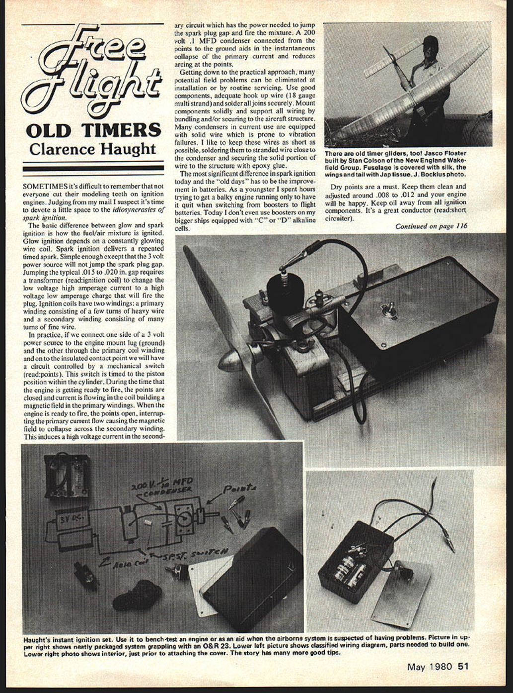 OLD TIMERS Clarence Haught SOMETIMES its difficult remember everyone cut modeling teeth ignition engines Judging mail suspect its time devote little space idiosyncrasies spark ignition basic difference between glow spark ignition fuel/air mixture ignited Glow ignition depends constantly glowing wire coil Spark ignition delivers repeated timed spark Simple enough except 3 volt power source will jump spark plug gap Jumping typical 015 020 gap requires transformer readignition coil change low voltage high amperage current high voltage low amperage charge will fire plug Ignition coils have two windings primary winding consisting few turns heavy wire secondary winding consisting turns fine wire practice connect side 3 volt power source engine mount lug ground other through primary coil winding insulated contact point will have circuit controlled mechanical switch readpoints switch timed piston position within cylinder During time engine getting ready fire points closed current flowing coil building magnetic field primary windings engine ready fire points open interrup ting primary current flow causing magnetic field collapse across secondary winding induces high voltage current secondary circuit has power needed jump spark plug gap fire mixture 200 volt 1 MFD condenser connected points ground aids instantaneous collapse primary current reduces arcing points Getting down practical approach potential field problems can eliminated installation routine servicing Use good components adequate hook up wire 18 gauge multi strand solder joins securely Mount components solidly support wiring bundling and/or securing aircraft structure condensers current use equipped solid wire prone vibration failures like keep wires short possible soldering stranded wire close condenser securing solid portion wire structure epoxy glue significant difference spark ignition today old days has improve ment batteries As youngster spent hours trying get balky engine running have quit switching boosters flight batteries Today dont use boosters bigger ships equipped C D alkaline cells Dry points must Keep clean adjusted around 008 012 engine will happy Keep oil away ignition components Its great conductor readshort circuiter Continued naze 116 augnrs Inslant ugnaimon set use ii ounch-test engine aid airborne system suspected having problems Picture up per right shows neatly packaged system grappling O&R 23 Lower left picture shows classified wiring diagram parts needed build Lower right photo shows interior just prior attaching cover story has good tips May 1980 51 old timer gliders too Jasco Floater built Stan Colson New England Wake field Group Fuselage covered silk wings tail Jap tissue J Bockius photo ING FOR BETTER FIELD BOX J CO2 lovers keeping cool desirable thing Bill CaIdwells method using bayonet-mounted CO2 system whereby flannel sleeve dipped hot water slipped over tank helps keep motor perking coldest days way beat frosting problem Ireland via Earl Van Gorder Mid-Hudson Modelmasters fame comes idea warming tanks looks promising Take lower end aluminum cigar tube slip up onto tank Warm water held between tank its jacket 0 ring fitting snugly around top tank pin used let air out 0 ring inserted between two Just breathe some warmth back device after flight Jerry Bockius Sons Desert Squad ron Flying Aces Club up Colchester CT suggests cannot overdo safety precau tions hotzapstuff adhesives feels 2-4 lb lead receptable press fit bottle might help solve problem accidental overturning have recently seen modelers coming much too familiar type instant glue cyanoacrylate point using fuel tubing bottle dispense perhaps Jerry has good point Gluing fingers together cute eye glued shut period several days less appealing Attention Waco lovers Charles Schaaf has just sent along whole page Waco 3-view listings now available Smithsonian unaware drawings available source suggest send listings irc raft Drawings National Air Space Museum 3904 Old Silver Hill Rd Suitland MD 20023 Prices very reasonable too FF Duration/Meuser Continued page 113 time Sandpapered tissue make lighter Dont know whether saved much weight sure fuzzied up lot tremendous psychological value could ever hope beat guy sandpapered tissue paper California State Fair model plane meets got regular official state medals gold silver bronzethe same winemakers beet growers cattle ranchers winemakers such money pocket advertising value us important different way Anyhow guy wins gold silver medal whatever immediately sends somewhere have assayed comes back big notch sawed out side answer Nope its plated zinc-base alloy pot-metal invoice $5 days could get Buick Century Packard 180 $1200 Bob Meuser 4200 Gregory St Oakland CA 94619 FF Sport/Scale/Warner continued page 50 flying surface outlines balsa ribs bulk heads use plastics form nylon monofilament fuselage wing rigging styrofoam pilot detract least elegance creations Maybe might like consider whether plastic wheels props detract enhance scale mystique next model Wakefield Scale Modeling what its promoters call new yearly contest forjumbo scale rubber models huge silver cup winner has proposed implemented competition will included US FF Championships Taft CA May trophy called Ray Berens Perpetual Trophy honor top rubber modelers Southern California size models eligible fly event will gradually increase over next ten years present 36 monoplane 30 biplane rule 50 36 spans respectively 1990 Bob Scheidly New Haven IN passes interesting way make own balsa printwood First find Xerox machine does enlarge reduce plans make copy dark can blotching transfer part outlines right onto balsa sheet iron set wool Tricky no Has rubber job buzzing about like drunken hummingbird Ed Carson writes Denmark hardest flight problems solve erratic flying comes loose nose block tends hop out giving ever-changing thrust directions beginning modelers experience situation can easily cured cementing hard balsa strips inside fuselage opening until nose