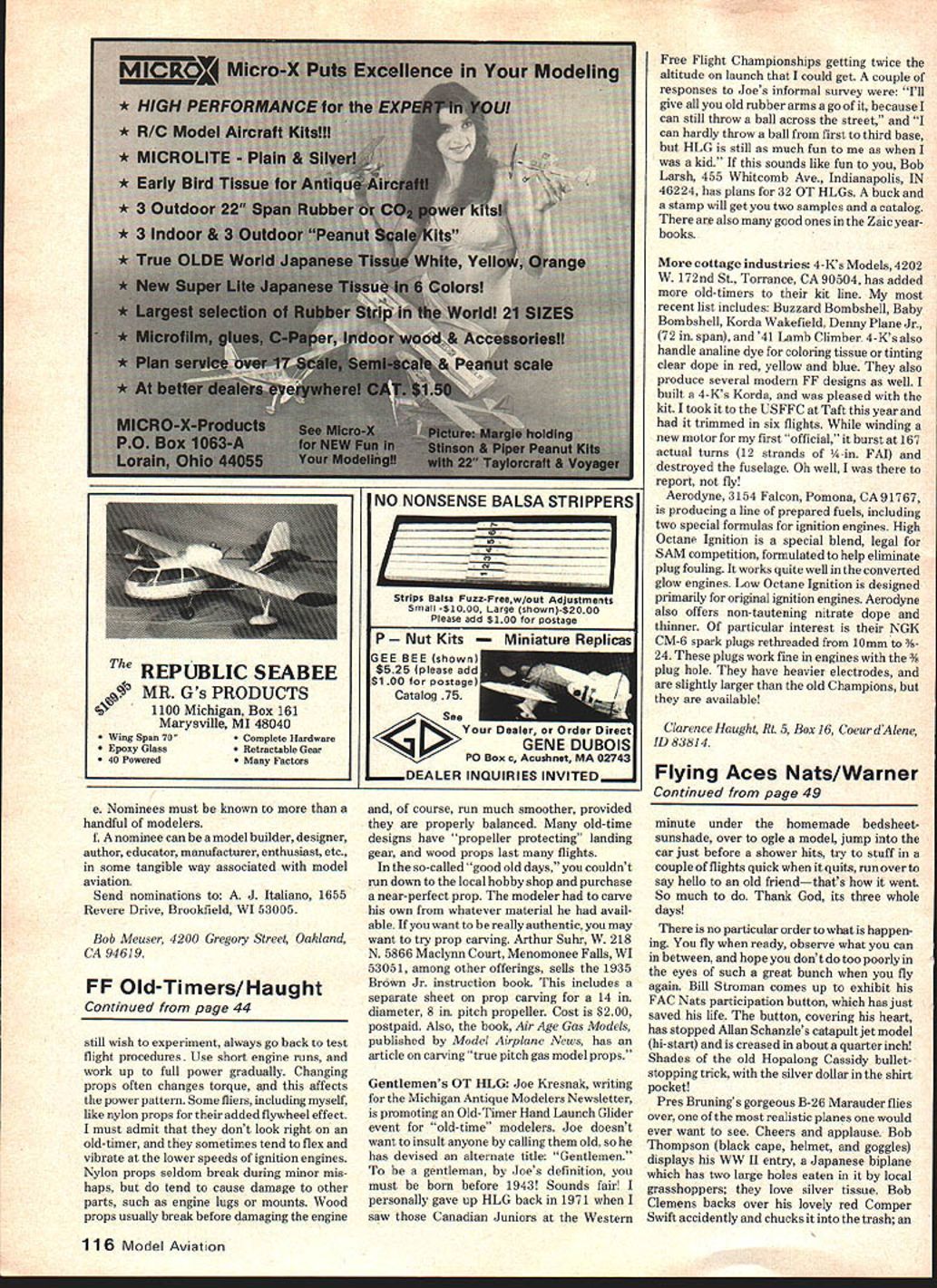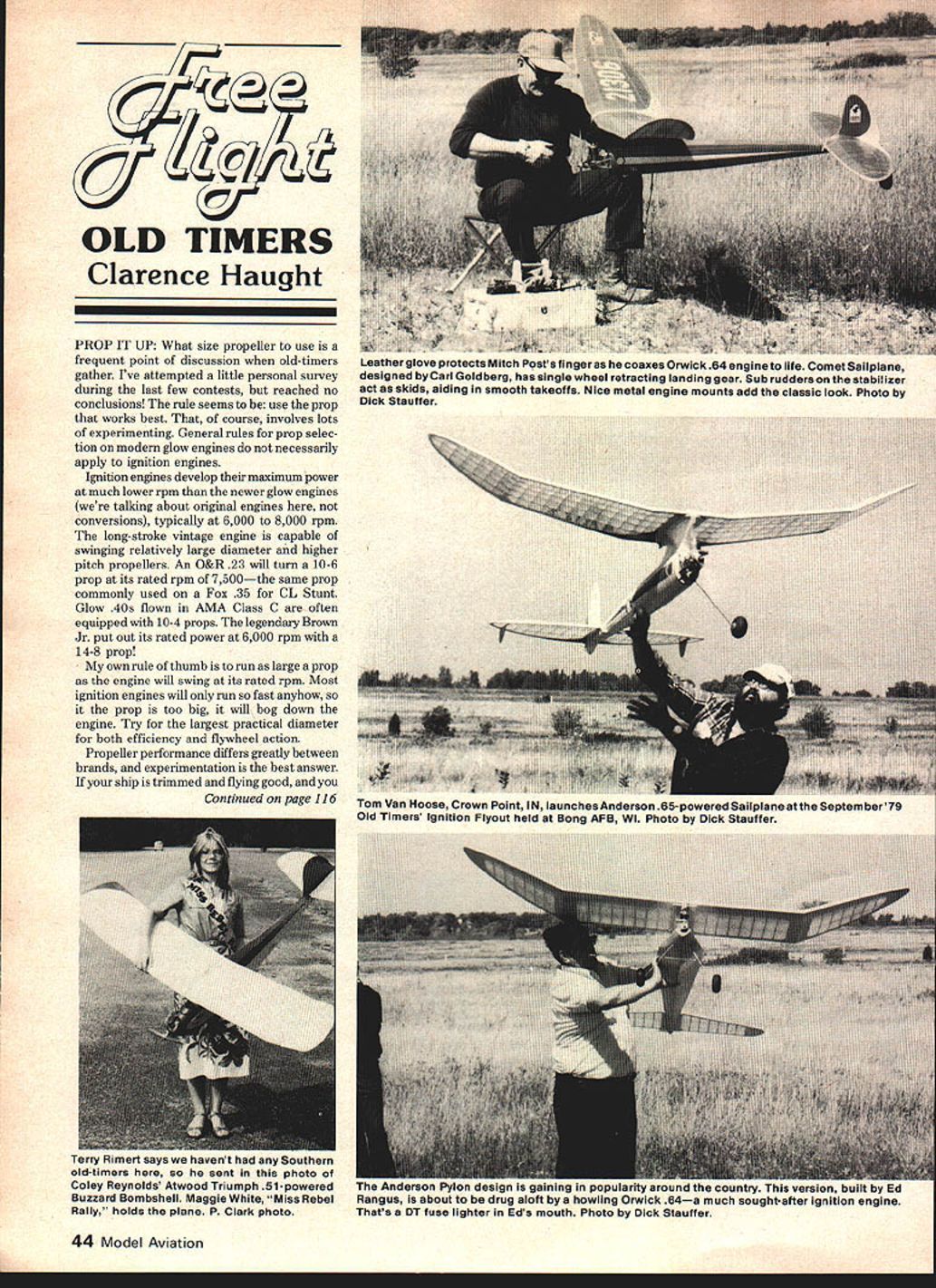 OLD TIMERS Clarence Haught PROP IT UP What size propeller use frequent point discussion old-timers gather Ive attempted little personal survey during last few contests reached no conclusions rule seems use prop works best course involves lots experimenting General rules prop selec tion modern glow engines necessarily apply ignition engines Ignition engines develop maximum power much lower rpm newer glow engines talking about original engines conversions typically 6000 8000 rpm long-stroke vintage engine capable swinging relatively large diameter higher pitch propellers An O&R 23 will turn 10-6 prop its rated rpm 7500the same prop commonly used Fox 35 CL Stunt Glow 40s flown AMA Class C often equipped 10-4 props legendary Brown Jr put out its rated power 6000 rpm 14-8 prop own rule thumb run large prop engine will swing its rated rpm Most ignition engines will run fast anyhow prop too big will bog down engine Try largest practical diameter both efficiency flywheel action Propeller performance differs greatly between brands experimentation best answer ship trimmed flying good Continued page 116 44 Model Aviation Leather glove protects Mitch Posts finger coaxes Orwick 64 engineto life Comet Sailplane designed Carl Goldberg has single wheel retracting landing gear Sub rudders stabilizer act skids aiding smooth takeoffs Nice metal engine mounts add classic look Photo Dick Stauffer Tom Van Hoose Crown Point IN launches Anderson 65powered Sailplane atthe Septemberl9 Old Timers Ignition Flyout held Bong AFB WI Photo Dick Stauffer Terry Kimert says havent Southern old-timers sent photo Coley Reynolds Atwood Triumph 51-powered Buzzard Bombshell Maggie White Miss Rebel Rally holds plane P Clark photo Anderson Pylon design gaining popularity around country version built Ed Rangus about drug aloft howling Orwick 64a much sought-after ignition engine Thats DT fuse lighter Eds mouth Photo Dick Stauffer e Nominees must known handful modelers f A nominee can model builder designer author educator manufacturer enthusiast etc some tangible way associated model aviation Send nominations J Italiano 1655 Revere Drive Brookfield WI 53005 Bob Meuser 4200 Gregory Street Oakland CA 94619 FF Old-Timers/Haught Continued page 44 still wish experiment always go back test flight procedures Use short engine runs work up full power gradually Changing props often changes torque affects power pattern Some fliers including myself like nylon props added flywheel effect must admit dont look right old-timer sometimes tend flex vibrate lower speeds ignition engines Nylon props seldom break during minor mis haps tend cause damage other parts such engine logs mounts Wood props usually break before damaging engine 1mM Strips Balsa Fuzz-Freew/out Adjustments Small -$1000 Large lshownl-$2000 Please add $100 postage P Kits ature RenIiu GEE BEE shown $525 please ad $100 Catalog /n See Y D.., DUBOIS 0 Box c Acushnet MA 027431 .....DEALER INQUIRIES INVITED course run much smoother provided properly balanced old-time designs have propeller protecting landing gear wood props last flights so-called good old days couldnt run down local hobby shop purchase near-perfect prop modeler carve own whatever material avail able want really authentic may want try prop carving Arthur Suhr W 218 N 5866 Maclynn Court Menomonee Falls WI 53051 among other offerings sells 1935 Brown Jr instruction book includes separate sheet prop carving 14 diameter 8 pitch propeller Cost $200 postpaid Also book Air Age Gas Models published Model Airplane News has article carving true pitch gas model props Gentlemens OT IILG Joe Kresnak writing Michigan Antique Modelers Newsletter promoting Old-Timer Hand Launch Glider event old-time modelers Joe doesnt want insult anyone calling old sohe has devised alternate title Gentlemen gentleman Joes definition must born before 1943 Sounds fair personally gave up HLG back 1971 saw Canadian Juniors Western Free Flight Championships getting twice altitude launch could get couple responses Joes informal survey Ill give old rubber arms go because can still throw ball across street can hardly throw ball first third base HLG still much fun kid sounds like fun Bob Larsh 455 Whitcomb Ave Indianapolis IN 46224 has plans 32 OT HLGs buck stamp will get two samples catalog also good ones Zaic yearbooks cottage industries 4-Ks Models 4202 W 172nd St Torrance CA 90504 has added old-timers kit line recent list includes Buzzard Bombshell Baby Bombshell Korda Wakefield Denny Plane Jr 72 span 41 Lamb Climber 4-Ks also handle analine dye coloring tissue tinting clear dope red yellow blue also produce several modern FF designs well built 4-Ks Korda pleased kit took USFFC Taft year trimmed six flights winding new motor first official burst 167 actual turns 12 strands A-in FAI destroyed fuselage Oh well report fly Aerodyne 3154 Falcon Pomona CA 91767 producing line prepared fuels including two special formulas ignition engines High Octane Ignition special blend legal SAM competition formulated help eliminate plug fouling works quite well converted glow engines Low Octane Ignition designed primarily original ignition engines Aerodyne also offers non-tautening nitrate dope thinner particular interest NGK CM-6 spark plugs rethreaded 10mm %24 plugs work fine engines Fe plug hole have heavier electrodes slightly larger old Champions available Clarence Haught Rt 5 Box 16 Cocur dAlene ID 83814 Flying Aces Nats/Warner Continued page 49 minute under homemade bedsheet sunshade over ogle model jump car just before shower hits try stuff couple flights quick quits run over say hello old friendthats went So much Thank God its three whole days no particular order what happen ing fly ready observe what can between hope dont too poorly eyes such great bunch fly again Bill Stroman comes up exhibit FAC Nats participation button has just saved life button covering heart has stopped Allan Schanzles catapult jet model hi-start creased about quarter inch Shades old Hopalong 
