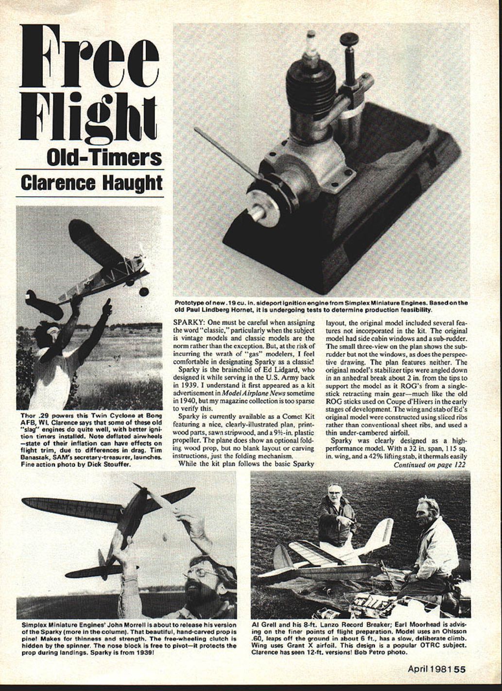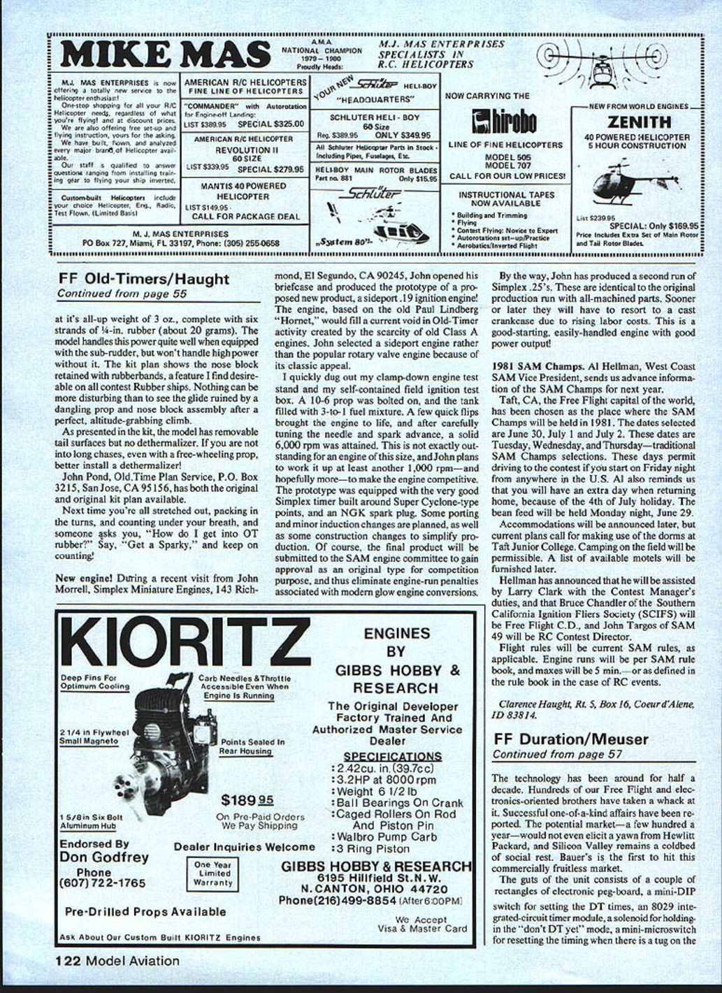 SPARKY One must careful assigning word classic particularly subject vintage models classic models norm rather exception risk incurring wrath gas modelers feel comfortable designating Sparky classic Sparky brainchild Ed Lidgard designed serving US Army back 1939 understand first appeared kit advertisement ModelAirplane News sometime 1940 magazine collection too sparse verify Sparky currently available Comet Kit featuring nice clearly-illustrated plan printwood parts sawn stripwood 9-in plastic propeller plane does show optional fold ing wood prop no blank layout carving instructions just folding mechanism kit plan follows basic Sparky layout original model included several fea tures incorporated kit original model side cabin windows sub-rudder small three-view plan shows subrudder windows does perspec tive drawing plan features neither original models stabilizer tips angled down anhedral break about 2 tips support model ROGs singlestick retracting main gearmuch like old ROG sticks used Coupe dHivers early stages development wing stab Eds original model constructed using sliced ribs rather conventional sheet ribs used thin under-cambered airfoil Sparky clearly designed highperformance model 32 span 115 sq wing 42% lifting stab thermals easily Continued vale 122 Al Grell 8-ft Lanzo Record Breaker Earl Moorhead advis ing finer points flight preparation Model uses Ohisson 60 leaps off ground about 6 ft has slow deliberate climb Wing uses Grant X airfoil design popular OTRC subject Clarence has seen 12-ft versions Bob Petro photo April 1981 55 FCC Flight Old-Timers Clarence Naught Prototype new 19 Cu lfl sideport ignition enginefrom Simplex Miniature Engines Based old Paul Lindberg Hornet undergoing tests determine production feasibility Thor 29 powers Twin Cyclone AFB WL Clarence says some old slag engines quite well better igni tion timers installdd Note deflated airwheels state inflation can have effects flight trim due differences drag Tim Banaszak SAMs secretary-treasurer launches Fine action photo Dick Stouffer umpuex invumniature Engines John Morrell about release version Sparky column beautiful hand-carved prop pine Makes thinness strength free-wheeling clutch hidden spinner nose block free pivotit protects prop during landings Sparky 1939 us.. MJ MAS ENTERPRISES/N NATIONAL CHAMPIONSPECIALISTS IN MA ProudlyHeads C HELICOPTERS AMERICAN R/C HELICOPTERS FINE LINE OF HELICOPTERS MJ MAS ENTERPRISES now offering totally new semite helicopter enthusiast One-stop shopping yoar R/C Helicopter needt regardless what youre flying discoant prices also offnrieg free see-up flying inscraction yours asking have bails flown analyzed entry major hrar Helicopter anail ahl~ staff qualified answer questiona ranging front installing train ing gear flying ship inserted Custom-built Helicopters include choice Helicopter Eng Radio Test Flown Limited gasisl COMMANDER wish Engine-off Landing LIST $38995 SPECIAL $32500 AMERICAN R/C HELICOPTER REVOLUTION II 60 SIZE LIST IAL $27995 MANTIS 40 POWERED HELICOPTER LIST 5qggg CALL FOR PACKAGE DEAL M J MAS ENTERPRISES P0 Box 727 Miami FL 33197 Phone 305 255-0658 SCHLUTER HELl BOY 68 Size Reg $38995ONLY $34995 Schluter Heiicsgsnr Parts StockIncluding Pipes Fuselages Etc HELl-BOY MAIN ROTOR BLADES Punt no BS1Only $1595 S7F ,Sstm 80NOW CARRYING THE ihirshe LINE OF FINE HELICOPTERS MODEL 505 MODEL 707 CALL FOR OUR LOW PRICES INSTRUCTIONAL TAPES NOW AVAILABLE Building end Trimming Flying Contest Flying Nocice Expert Autorotutions setup/Practice Aerobatics/leeerted Flight NEW FROM WORLD ENGINES ZENITH 40 POWERED HELICOPTER 5 HOUR CONSTRUCTION 7- List $23995 SPECIAL Only $16995 Price Includes Estru Set Main Rotor Tail Rotor Blades FF Old-Timers/Haught Continued page 55 its all-up weight 3 oz complete six strands -in rubber about 20 grams model handles power quite weU equipped sub-rudder wont handle high power kit plan shows nose block retained rubberbands feature find desireable contest Rubber ships Nothing can disturbing see glide ruined dangling prop nose block assembly after perfect altitude-grabbing climb As presented kit model has removable tail surfaces no dethermalizer long chases free-wheeling prop better install dethermalizer John Pond OldTime Plan Service PO Box 3215 SanJose CA95156hasboththeoriginal original kit plan available Next time youre stretched out packing turns counting under breath someone sks get OT rubber Say Get Sparky keep counting New engine During recent visit John Morrell Simplex Miniature Engines 143 RichKIORITZ Deep Finn For7 Carb Needles &Throgtle Optimum CoolingAccessible Engine Running 21/4 Flywheel Small Magneto 15/BinSisBolt Aluminum Hub Endorsed Don Godfrey Phone 607 722-1765 Pre-Drilled Props Available Ask About Custom Built KIORITZ Engines 9 Points Sealed Rear Housing $189 Pre-Paid Orders Pay Shipping Dealer Inquiries Welcome Limited mond El Segundo CA 90245John opened briefcase produced prototype pro posed new product sideport 19 ignition engine engine based old Paul Lindberg Hornet would fill current void Old-Timer activity created scarcity old Class engines John selected sideport engine rather popular rotary valve engine because its classic appeal quickly dug out clamp-down engine test stand self-contained field ignition test box 10-6 prop bolted tank filled 3-to 1 fuel mixture few quick flips brought engine life after carefully tuning needle spark advance solid 6000 rpm attained exactly out standing engine size John plans work up least another 1000 rpmand hopefully moreto make engine competitive prototype equipped very good Simplex timer built around Super Cyclone-type points NGK spark plug Some porting minor induction changes planned well some construction changes simplify pro duction course final product will submitted SAM engine committee gain approval original type competition purpose thus eliminate engine-run penalties associated modem glow engine conversions ENGINES BY GIBBS HOBBY & RESEARCH Original Developer Factory Trained Auth