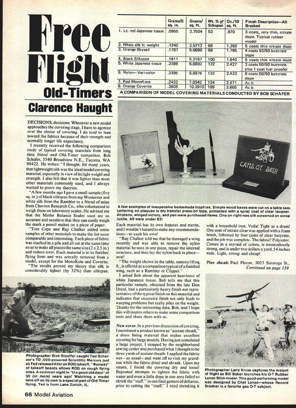 rcc Flight Old-Timers Clarence Naught DECISIONS decisions Whenever new model approaches covering stage have agonize over choice covering tend lean toward fabrics because strength normally longer life expectancy recently received following comparison study typical covering materials long time friend Old-Timer competitor Bob Schafer 5540 Broadview NE Tacoma WA 98422 writes thought years lightweight silk ideal model covering material especially view its light weight strength also felt lighter other materials commonly used always wanted prove theories few months ago gave small sample five sq black silkspan Westerner white silk Rambler friend Chevron Research Co volunteered weigh laboratory scales advised MetIer Balance Scales used accurate sensitive can easily weigh mark pencil makes piece paper Tom Cope Ray Chalker added some samples other materials make list comparable interesting piece fabric stacked pile cut same time make pieces same size 2 x 25 reduce error material its finishec flying form actually removed model except MonoKote Coverite results proved theory silk considerably lighter 32% silkspan Grams/5GramslWt % ofOzI1OFinish DescriptionAll sq insq ftSiIkspasq ftBrushed 1 Lt red Japanese tissue 0955 27504 53 970 3 coats very thin nitrate dope Typical rubber model 2 White silk weight124035712 6812605 coats thin nitrate dope 3 Orange Skysail 1767 50890 98 1795 4 coats 50/50 butyrate dope 4 Black Silkspan 1811 52157 100 1840 5 coats thin nitrate dope 5 White Japanese tissue 2389 3 132 2427 3 coats 50/50 butyrate plus 1 coat fuel proofer 6 Nylon Van-color 2395 68976 132 2433 6 coats 50/50 butyrate dope 7 Red MonoKote 2432 70042 134 2471 As 8 Orange Coverite 3608 103910 199 3665 As COMPARISON OF MODEL COVERING MATERIALS CONDUCTED BY BOB SCHAFER material has its own features merits wouldnt hazard make recommenda tionsto own Ray Chalker told damaged wing recently able remove nylon material uses piece repair internal structure lay nylon back place neat weight shown table ounces/lO sq ft offered comparison typical finished wing such Rambler Clipper asked Bob about apparent heaviness white Japanese tissue Bob tells particular sample obtained late Don Dood particularly heavy finish repre sentative typical finish material indicates excessive finish leads warping problems really piles weight Thanks interesting data Bob hope will inspire others make some comparison tests share us New cover previous discussion covering mentioned product known ate sheath dress lining material makes excellent covering large models Havingjust completed large project stopped neighborhood sewing center purchased what thought three yards acetate sheath applied fabric wetas usualand went off visit grand son fabric dried shrank Upon return found covering dry loose Repeated attempts tighten fabric water little dope area failed shrink ~stuff final gesture ofdefiance prior cutting stuff tried shrinking household iron Voila Tight drum coat nitrate clear applied foam brush followed four coats clear butyrate job complete fabric Polyester Comes myraid colors tremendously strong under two dollars yard 54 inches wide Light strong cheap Plan ahead Paul Plecan 3023 Saratoga St Continued page 139 66 Model Aviation few examples inexpensive homemade trophies Simple wood bases cut table saw Lettering plaques dry transfer press-on type protected spray coat clear lacquer Airplane winged victory pen purchased items right silk screened scrap lucite under $3 I-nomograpner UIcK toutter caught Ted Scher zers TO 020-powered Scientific Mercury just Ted released itfor ROG takeoff Runway takeoff boards allows ROG rough flying sites common sight good old days 30 br years ago Watching model take off its own isa special part Old-Timer flying Ted Lake Zurich IL rnuiograpner tarry Iruse captures instant flight Bill Baker launches O-T Rubber Lanzo Stick model good-performing model designed Chet Lanzowhose Record Breaker favorite gas 0-T subject Sebroedeer George see Champion Model Products Schultz Charles F. 910 Broadfields Dr. Louisville KY 40207 Flyin Scale plans JN4-D factory dmgs 1911 Curtiss Pusher details ssae Seely Vie see Castle Graphics Seventy-Seven ProductsBernhardt Otto 17119 So Har vard Blvd. Gardena CA 90247 213 329-0247 dy ev Engines Old-Timer parts reworking $1 Shipton Dave see Hobby Hideaway Simpletr Miniature Engines Morrill John 143 Richmond St. El Segundo CA 90245 213 322-7858 dy ev Hand-made sparkignitioe engines several sizes ssae Simpson Gene see Kitco Skyjane Gerald see Micro-X Products Sliff Bob see Hobby Horn Small Parts Inc. 6901 N E Third Ave. Miami FL 33138 Everything imaginable small hardware Tubing screws md metric gears mashers SuperiorAircraftTaibi Mike l2O2OCentraliaG Hawaiian Gardens CA 90716 213 885-3220 Balsa spruce plywood SwenAir Swenson Richard 7373 N Teutonia Apt 9 Milwaukee WI 53209 414 354-0500 dy 414 352-0147 Alloy engine poe-mount FAI Power models Swenson Richard see SwenAir PNA Engines see Performance Model Parts Inc Tee Aero Engineering Crouss Ted 100 Smyrna St West Springfield MA 01089 413 732-3859 ec Kits supplies accessories OT modern $25 Taibi Mike see Superior Aircraft Thomas Gene see Classic Models Thomas Studio see Classic Models Thompson Marty Karen see NFFS Supplies Tobia Frank see Franks Hobbies Tom Thumb Sky Tracings Houle Tom 11333 N Lake Shore Dr Mequon WI 53092 414 241-5785 Flying scale sport plans gas CO-2 ssae Toner Edward J Jr see Buzzer Model Airplane Co Turner Ed 3544 Granada Dr Fort Worth TX 76118 Czech-madn Russian-type towlive girder launching device Currently out stock VL Products Vista Labs 7871 Alabama Ave #16 Canoga Park CA 91304 213 348-8039 dy 213 346-0524 en Electric propulsion flight ground support systems sup pliny kits Hytork 49 motor vicads $50 WahI Herb see Herbs Model Motors Waldner Arnold see K W Enterprises Walloek Gene see Hobby Horn Walters Jim 240 SW 184 Seattle WA 98166 206 2443936 en Frherglass tailbooms tar A-t towlrne gliders $25 Werlewind Mfg Co Werle Charles 362