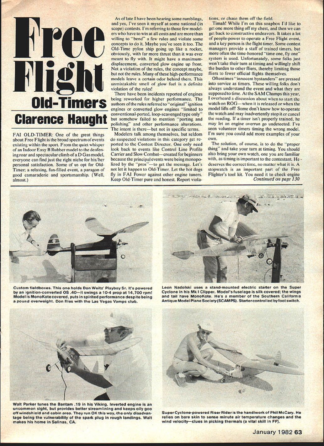 Fee FlighE Old-Timers Clarence Naught FAI OLD-TIMER great things about Free Flight broad spectrum events existing within sport quiet whisper Indoor Easy B Rubber model deafen ing roar spectacular climb D Gas model everyone can find just right niche his/her personal satisfaction Some us opt OldTimer relaxing fun-filled event paragon good camaraderie sportsmanship Well almost As late have hearing some rumblings yes Ive seen myself some national scope contests Im referring few model ers have win costs willing bend few rules violate some concepts Maybe youve seen too Old-Time pylon ship going up like rocket obviously far thrust ever meant fly might have maximumdisplacement converted glow engine up front violation rules concept maybe rules high-performance models leave certain odor behind unmistakable smell glow fuel definite violation rules have incidents reported engines being reworked higher performance authors rules referred original ignition engines converted glow engines limited conventional-ported loop-scavenged type somehow failed mention porting polishing other performance alterations intent therebut specific terms Modelers talk among themselves seldom suspected violations category get re ported Contest Director need look back events like Control Line Profile Carrier Slow Combatcreated beginners because principal events being monopo lized prosto get message Lets let happen Old-Timer Let hot dogs fly FAI Power against other engine tuners Keep Old-Timer pure honest Report violadons chase off field Timah Im soapbox Id like get thing off chest can get back constructive endeavors takes lot people-power operate Free Flight event key person flight timer Some contest managers provide staff trained timers hut often time-honored time fly system used Unfortunately some folks just wont take turn timing willingly shift burden other fliers thereby limiting fliers fewer official flights themselves Oftentimes innocent bystanders pressed service timers willing folks dont always understand event what supposed time SAM Champs year overheard discussion about start watch ROGwhen released model lifts off Some dont know operate watch may inadvertently stop cancel reading timer isnt properly trained may let engine overrun go undetected Ive seen volunteer timers timing wrong model Im sure could add examples own solution course proper thing take turn timing should also bring own watch familiar timing important contestant deserves correct time no matter what stopwatch important part Free Flighters tool kit need check engine Continued page 130 January 198263 Custom fieldboxes holds Don Weitz Playboy Sr Its powered ignition-converted 0540it swings 10-4 prop 14700 rpm Model MonoKote covered puts spirited performance despite being pound overweight Don flies Las Vegas Vamps club Leon Nadolski uses stand-mounted electric starter Super Cyclone Mk Clipper Models fuselage silk covered wings tail have MonoKote Hes member Southern California Antique Model Plane SocietySCAM PS Startercontrolled byfootswitch Walt Parker tunes Bantam 19 Viking Inverted engine uncommon sight provides better streamlining keeps oily goo off windshield cabin area run OK way4he disadvan tage being vulnerability spark plug rough landings Walt makes home Salinas CA Super Cyclone-powered Riser Rider handiwork Phil McCary relies bare skin sense minute air temperature changes wind velocityclues picking thermals vital skill FF FEATURES INCLUDE Space battery & meter panel Transmitter compartment Room gallon fuel MASTER AIRSCRIW FLIGHTBOX KIT Master Airscrew Flight Box has features larger boxes compact handy arrangement parts cut imported mahogany plywood will take stain varnish paint finishes overall size 19W x 9W x 12 high $3at dealer 495 postpaid California add 6% Sales Tax Propeller storage Gravity closed small parts storage 7/8 aluminum handle Complete instructions & fasteners WINDSOR PROPELLER CO PO Box 112 Windsor CA 95492 * 1/3 Stand Off Scale * 92 Wingspan 1510 sq * Weight 19 21 lbs * Fiberglass Cowl Balsa Fuselage * Foam Wing Tail Section * Superior Landing Gear * For Kioritz Quadra etc * Cut Parts Sanded Shape * Full Size Rolled Plans PRICE $20995 Fine Quality Flying Models 98 RUBBER POWER KITS plus Gliders C/L RIC Accessories Books Catalog $150 4 * AJESTIC MODELS 3273 West 129th Street Cleveland Ohio 44111 Sorry bout dat Look close-up basic fixture Note winding wire hanging torque meter tail boom tail assembly inserted its holder After mounting tail group second holder swung place fuselage/wing assembly slipped over winding wire winding wire slipped splatter shield Although may show after printing motor has hooked winding wire actually being wound picture snapped Note would very unlikely motor broken during winding damage model since model rigidly fastened holder wont flinch splatter shield should catch broken motor Once winding has completed motor accessible Ron smooth out knots etc next photo Ron has just removed splatter shield moved fuselage forward onto motor next-to-last picture Ron has taken final torque reading unhooked motor winding wire swung tail group place transferred motor models rear hook point model fully wound almost untouched human hands range game Ron has free rest anything else needed giving helper nervous attack cramp holding motor Finally Ron attaches prop After seating thrust bearing properly front fuselage has loosen clothespin-type clamp holding rear model lift out go fly watched Ron use thing several times seemed always command much ease possible usual twoman winding dance fliers use gadget may make Cabin popular sure makes less scary wind Bud Tenny PO Box 545 Richardson TX 75080 FF Old-Timers/Haught Continued page 63 runs own models performance Dont leave home ROG CIA agent Don Jenkins made some relevant interesting observations during 1980 SAM Champs held Wright Patterson AFB Central Indiana Aeromodelers Annual might make suggestion column sometime about importance flier checking wind direction before turning loos