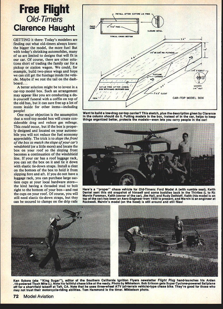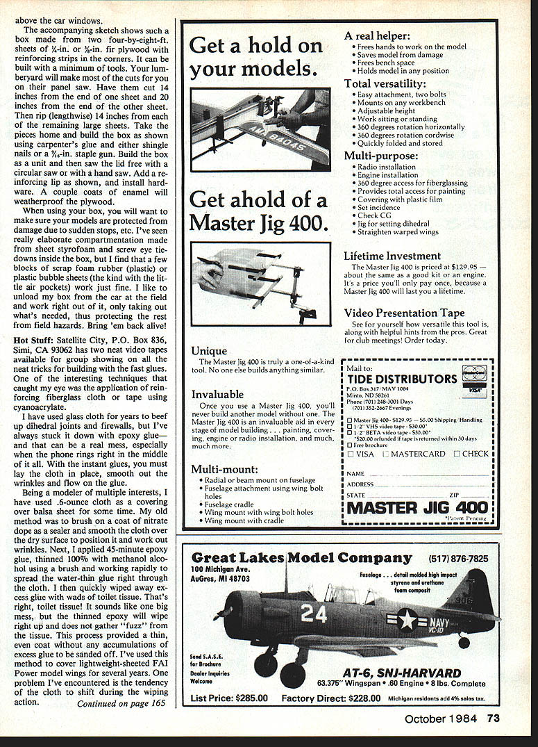 Free Flight Old- Timers Clarence Haught GETTING Todays modelers finding out what old-timers always knew bigger model fun todays shrinking automobiles us limited designs will fit car course other solu tions short trading family car pickup station wagon could example build two-piece wings hope can still get fuselage inside vehi cle Maybe rest tail dash board. better solution might invest car-top model box Such arrangement may appear like conducting doit-yourself funeral coffin top old bus can sure free up lot room inside other itemsincluding people major objection assumption roof-top model box will create con siderable drag reduce gas mileage could occur box proper ly designed located automo bile will reduce fuel economy appreciably trick slope front box match slope cars windshield little locate box roof sloping front becomes continuation windshield line car has roof luggage rack can set box tie down elastic tie-down straps Install cleat bottom box hold slipping fore aft have luggage rack can purchase large suc tion cups local hardware store kind having threaded stud bolt right bottom boxand rest cups roof course will still need elastic tie-down straps can secured clamps drip rails Want build low-drag car-top carrier sketch pius description given Ciarence column shouid Putting modeis box instead car heips keep things organized better protects modeiseven iota carry people Carl Ken Sykora eke King Sugar editor Southern California ignition Flyers newsletter Flight Plug hand-launches Arden 19-powered Tiush Mite L Note faithful chase bike ready Photo Mikkeison Bob Erikeon gets Super Cycione-powered Sailplane off short-field takeoff Taft CA Note uses three-wheel ATV all-terrain vehicie-type chase bike Theyre good may trust motorcycle-riding abilities Tom Hammond timer Mikkeison photo 72 Model Aviation ~~WTERcUTTS /IIPINEj CLLE DETAIL TYPICAL CROSS MOTION WASHER CUTI FREE AFTER ASSEM/4 NUT CAR-TOP MODEL BOX Heres proper chase vehicle Old-Timers Ford Model rumble seat Keith Dentel sent old snapshot himself some buddies back Thirties L R Marvin Foreman Keith owner car Jim Hail Rudy Dethioff Keith model top car has Aero Engineer 1939 present Marvin engineer Rockwell Marvins model hood still around still files above car windows accompanying sketch shows such box made two four-by-eight-ft sheets /4-in %-in fir plywood reinforcing strips corners can built minimum tools lum beryard will make cuts panel saw Have cut 14 inches end sheet 20 inches end other sheet rip lengthwise 14 inches remaining large sheets Take pieces home build box shown using carpenters glue either shingle nails A-in staple gun Build box unit saw lid free circular saw hand saw Add re inforcing lip shown install hard ware couple coats enamel will weatherproof plywood using box will want make sure models protected damage due sudden stops etc Ive seen really elaborate compartmentation made sheet styrofoam screw eye tiedowns inside box find few blocks scrap foam rubber plastic plastic bubble sheets kind lit tle air pockets work just fine like unload box car field work right out taking out whats needed thus protecting rest field hazards Bring em back alive Hot Stuff Satellite City PO Box 836 Simi CA 93062 has two neat video tapes available group showing neat tricks building fast glues interesting techniques caught eye application rein forcing fiberglass cloth tape using cyanoacrylate have used glass cloth years beef up dihedral joints firewalls Ive always stuck down epoxy glue can real mess especially phone rings right middle instant glues must lay cloth place smooth Out wrinkles flow glue Being modeler multiple interests have used 6-ounce cloth covering over balsa sheet some time old method brush coat nitrate dope sealer smooth cloth over dry surface position work out wrinkles Next applied 45-minute epoxy glue thinned 100% methanol alco hol using brush working rapidly spread water-thin glue right through cloth quickly wiped away ex cess glue wads toilet tissue Thats right toilet tissue sounds like big mess thinned epoxy will wipe right up does gather fuzz tissue process provided thin coat accumulations excess glue sanded off Ive used method cover lightweight-sheeted FAI Power model wings several years problem Ive encountered tendency cloth shift during wiping action Continued page 165 Get hold models Unique Master Jig 400 truly one-of-a-kind tool No else builds anything similar Invaluable Once use Master Jig 400 youll never build another model Master Jig 400 invaluable aid stage model building nting cover ing engine radio installation much much Multi-mount Radial beam mount fuselage Fuselage attachment using wing bolt holes Fuselage cradle Wing mount wing bolt holes Wing mount cradle Send SASE Drochure Dealer Inquiries Welcome real helper Frees hands work model Saves model damage Frees bench space Holds model position Total versatility Easy attachment two bolts Mounts workbench Adjustable height Work sitting standing 360 degrees rotation horizontally 360 degrees rotation cordwise Quickly folded stored Multi-purpose Radio installation Engine installation 360 degree access fibergiassing Provides total access painting Covering plastic film Set incidence Check CG Jig setting dihedral Straighten warped wings Lifetime Investment Master Jig 400 priced $12995 about same good kit engine Its price youll pay once because Master Jig 400 will last lifetime Video Presentation Tape See yourself versatile tool along helpful hints pros Great club meetings Order today s Mail TIDE DISTRIBUTORS PO Box 317 MAV 1084 Minto ND 38261________ Phone 7011 248-3001 Days 701 352-2667 Evenings LI Masterlig400-S12995 SSOoShipping Handling O 1 2 VHS video tape $3000 o i 2 BETA video tape $3000 52000 refunded ii tape returned arithin 30 days o Free brochure D VISA 3 MASTERCARD D CHECK NAME ADDRESS STATEZIP ____ MASTER JIG 400 October 1984 73 Get ahold Master Jig 400 Great Lakes Model Company 517876-7825 100 Michigan Ave AuGres MI 48703 j AT-6 SNI-HARVARD 63375 Wingspan 6
