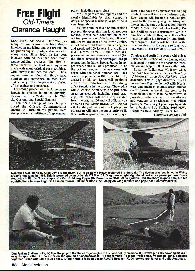 Free Flight Old- Timers Clarence Haught MASTER CRAFTSMAN Herb Wahi know has deeply involved modeling production ignition engines parts services years Since 1965 has involved no less four major engine-building projects first involved Hurleman engines made original parts combined newly-manufactured ones engines identified Herbs serial numbers markings fact Herb makes effort prevent confusion engines originals second project Anniversary Brown Jr engines limited quantity followed Wahi-Brown Jr Clas sic Custom Special Engines change pace pro duced Ohlsson Commemorative engines through period Herb also produced multitude replacement partsincluding spark plugs Herbs engines replicas clearly identifiable composite design special markings point very fussy about Hes just announced new exciting project However time will replica will continuation original production Lykens Brown Bill Brown designer Brown Junior visualized trend toward smaller engines produced 100 Lykens Browns mid Thirties 12 cubic inch dis placement engines advanced time reverse-loop-scavenged design resembling larger Brown Junior ap pearance Since Bill produced 100 original engines new ones will begin serial number 101 concept possible Bill Brown himself assisted son Dave will doing production Herb doing few functions process engine will course made original con struction methods including sand cast ings etc will distinguishable original 100 will officially known Lykens Brown Ltd Engines will shipped spark plugs purchasers will have opportunity fit original Champion V-2 plugs Herb does have Japanese / x 32 plug available well coils condensers etc engine will include booklet pre pared Bill Brown giving history interesting facts about its creation Herbs Model Motors Box 61 Forksville PA 18618 will sole distributor Write him detalls well other items including Brown Jr Hurle man engines Orders will filled order received serious may want call him 717 924-3892 Catalogs stuff Its since included section column devoted fulfilling needs infor mation help Old-Timer enthusiasts First Willamette Modelers Club Inc has few copies new Directory Northwest Area Free Flighters1985 available 21-page directory lists known Free Flighters Pacific North west includes interest areas and/or events flown may seem valuable folks Northwest provides useful contacts vacationers vendors specialized Free Flight products can get copy send ing buck Bob Stalick 5066 NW Picadilly Circle Albany OR 97321 Continued page 146 Nostalgia Gas plane Greg Davis Vancouver BC Edwin Howe-designed Big Stars 1 design published Flying Models magazine 1955 Ship powered old-style OS Max 29 Greg uses atight righthand corkscrew power pattern Bruce Augustus built line example Carl Goldberg Zipper R Power O& R 29 ignition Carl Goldberg gene now contributions Free Flight will live forever innovations include pylon wing mounts pop-up-tail dethermalizers Don Jenkins indiana p oils IN flips p rap Bunch Tiger engine Foo-to-U Pylon model 1 Crafts pink silk covering makes easy spot either air groundlbrush/treelweeds flight box made empty vegetable cans soldered together Bruce Augustus Sun Valley ID built 8-ft.span Lanzo Record Breaker R Onlookers Janet Julia Augustus 58 Model Aviation CLEVELAND GIANTSI NEW FOR GIAMTSALE BUFFS WarMs Largest Gas Plans Assaitme RNATIONALLY FAMOUS CD OUAILTE MASTER MODELS PLANS 54SDDenoinelle 21 Sd 70Connol Cot PEYSA $42 72Cor 0201/4 L&S $46 104 Con Cot PEYSA $56 62 Ronnord Bone Ike $42 96 Wright-Nonytone $48r- 77 Boeing B17G Fern $35 22 WWrnnl2I Red 1 $36 03 50 8170 Fort $25 77 W-Wnrnl2l Red L $48 6$ Dons 046A 06 $32 84 Fobber D7 Ftr 039 108 Sikor S38 Aropir $49 6$ Honnond Pete Ron 032i 60 Roe 100 SpOrt $36 72 Boylen Gee-Bee $32T 90 Boe 100 $901 $49 60 Soperrnorine S6B $24 90 Stinn Lorn Wing 056 89 Soporniorine 068 $32 80 Mortin 74 7dM-I $39 62 Corn Hoonk P-6E $42 7$ ff9ge 2400 Bonrb 542 94 CorHerln P6E Fm DUd 104 89g 0400 Ron $26 62 Loolnfreed V9 $24 60 MCfnino Clipper $55 74 Doolittlen 0-B Il $450 97 MChine Clippen 075 95 Mononeop Sport $36 68 Wentl Wfnirlnniod $32 80 Ho11 Spr Bolidog $43 68 Ryon Nonion $39 107 Aerenno C3 Spi $35 68 BBononno V ToI $29 61 Dooglo 038 Ob $32 77 Lonoonnbn Sedon $25 122 Deoglon 0-3rOb $49 73 N M rnlr Sonib $49 94 Fogen Cort Boner $45 65 MMo node B 26 $49 71 Mortin $10 Bonrb $39 8109 Monqo Rb $42 7g Tornern WW Ron 055 10009 Monqo Bomb $55 R S3 Coo 0ohk 91 1C2 $42 96 Sneo PTl7Koydet $56 r Oonhk F11C2 05499 NBOo Wdooo 901 $69 O6De8enCenretRoo534 71Doog DC3ton $22 * oonMrMollignn 035 95 200$ DC 3 T en 055 94 onnMr Molligon 545 06 Hninlnn Tenoco 13 $32 63 Boeing P26A FIr $36 108 Co 0251 4 t&S 05684 Boeing P-26A 9rr 04R 60 Doing M 2 824 69 Wooo C6 Cobin $36 68 $r ntn Bolldog Ft $30 64 Seech C17B Slog 038 29 BronortoneMnt $54 enIr C17B Stog 049 127 Oroirn teeron 909 $54 nob II Ileorro $30 73 Tronel 0000 $24 85 Look 11 Olentro 040 107 Met MO Ron $44 62 Stinnon T W SR7 016 01 Lindlne Sn tAO 311 $39 81 Stinnon TW 5R7 524 lOg Fo di PT1O T $29 122 Utinnon T W 097 038 90 Wono Toper Wiog $39 ristol FIr F2B $30 75 WentI d Lynonder $32 78 Brintol Ftr 92-B $32 100 Wont1 d Lynonder 049 118 Brintol Fe 92-B $4957 Fond Tnjnntr 4-AT$28__ 74 T-L Penno Spen 045776 Fond Trintr 4AT$45 63 Skyronbet 09591 $20114 Ford Trjntr 4-AT059 * 56 Cor Werfrb 9-40 02484 Berl-Joyoe TFJ-2$06 78 Lonk Liglrtng pg 02893 Loening C-2Arnplr$69 56 Rep Sen-Bee Ann 07458 GronnJ2-F Donk$39 74 BepSee-8 Ann9b $3978 Oronn12F Donk$56 106 Piper J-3 Cob 039 59 Gone GIV Born022 98 Look Hodnon Enib 838117 Gotfro O1V Bonn039 63 Gron 969 Helloot 02868 Brine-Winkle Bird$45 90 09 02 Tine Moth 039- 54 Cort Sonift 0993402gNot Sold Thro DeolernPrinennobjeot torhonge Anne Pence iwemcoenOrineOeenrnecminSnrt-00-Oner 1200 Otlrern 6 -3 Pottn 50oUp Add lOlL nil orders nhip9ing & inn oreto USA Con & Meo Elneonhere its 15% 25% nirl Pinteriol notnIog 0200 lienloden Prioe Lintl Pnine lint B nenrion eloire $100 nir foreign odd 0100 CLEVELAND MODEL& SUPPLY Co 18387K DRIROIT AVB CLEVELAND OHIO 44182 ytioinSerootO