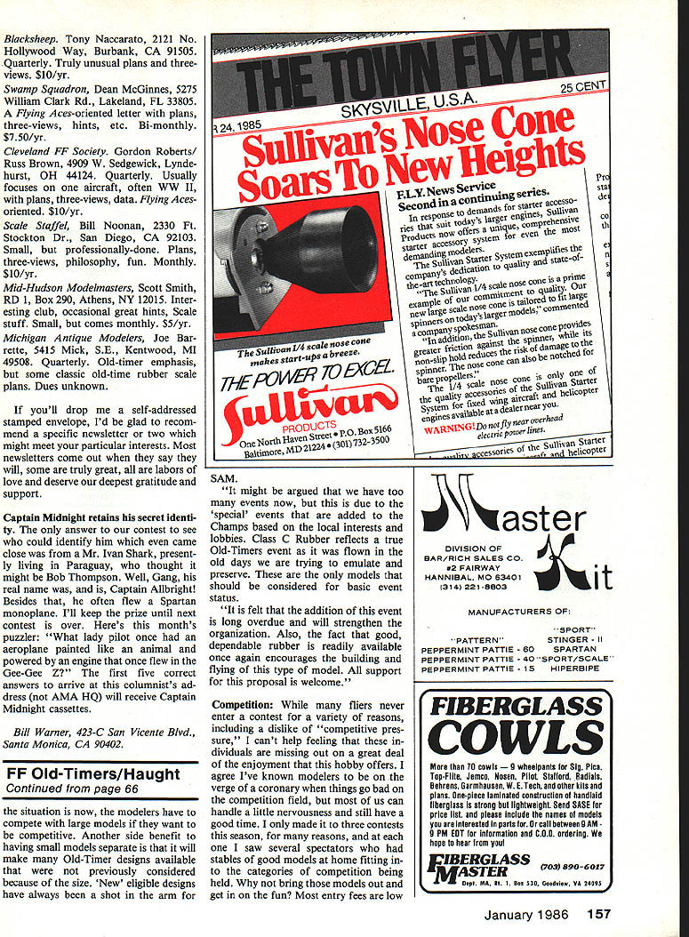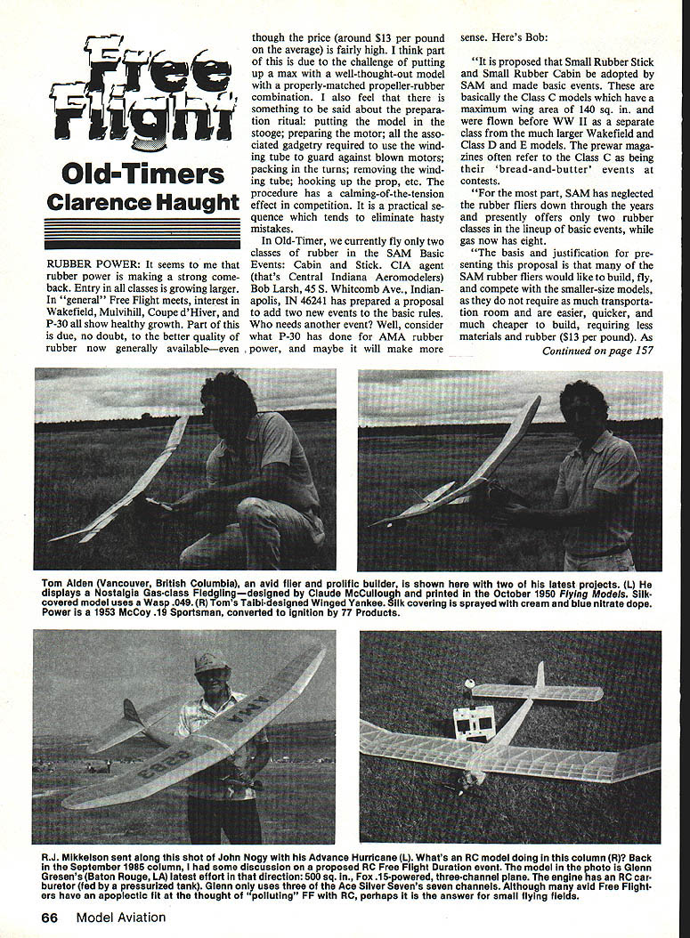 Old-Timers Clarence Naught RUBBER POWER seems rubber power making strong come back Entry classes growing larger general Free Flight meets interest Wakefield Mulvihill Coupe dHiver P-30 show healthy growth Part due no doubt better quality rubber now generally availableeven though price around $13 per pound average fairly high think part due challenge putting up max well-thought-out model properly-matched propeller-rubber combination also feel something said about prepara tion ritual putting model stooge preparing motor asso ciated gadgetry required use wind ing tube guard against blown motors packing turns removing wind ing tube hooking up prop etc procedure has calming-of-the-tension effect competition practical se quence tends eliminate hasty mistakes Old-Timer currently fly two classes rubber SAM Basic Events Cabin Stick CIA agent thats Central Indiana Aeromodelers Bob Larsh 45 5 Whitcomb Ave Indian apolis IN 46241 has prepared proposal add two new events basic rules needs another event Well consider what P-30 has done AMA rubber power maybe will make sense Heres Bob proposed Small Rubber Stick Small Rubber Cabin adopted SAM made basic events basically Class C models have maximum wing area 140 sq flown before WW II separate class much larger Wakefield Class D E models prewar maga zines often refer Class C being bread-and-butter events contests part SAM has neglected rubber fliers down through years presently offers two rubber classes lineup basic events gas now has eight basis justification pre senting proposal SAM rubber fliers would like build fly compete smaller-size models require much transporta tion room easier quicker much cheaper build requiring less materials rubber $13 per pound As Continued page 157 Tom Alden Vancouver British Columbia avid filer prolific builder shown two latest projects L displays Nostalgia Gas-class Fledglingdesigned Claude McCullough printed October 1950 FlyIng Models Silkcovered model uses Wasp 049 R Toms Taibidesigned Winged Yankee Silk covering sprayed cream blue nitrate dope Power 1953 McCoy 19 Sportsman converted ignition 77 Products RJ Mikkeison sent along shot John Nogy Advance Hurricane 1 Whats RC model doing column R Back September 1985 column some discussion proposed RC Free Flight Duration event model photo Glenn Gresens Baton Rouge LA latest effort direction 500 sq Fox 15-powered three-channel plane engine has RC car buretor fed pressurized tank Glenn uses three Ace Silver Sevens seven channels Although avid Free Flight ers have apoplectic fit thought polluting FF RC perhaps answer small flying fields 66 Model Aviation Blacksheep Tony Naccarato 2121 No Hollywood Way Burbank CA 91505 Quarterly Truly unusual plans threeviews $10/yr Swamp Squadron Dean McGinnes 5275 William Clark Rd Lakeland FL 33805 Flying Aces-oriented letter plans three-views hints etc Bi-monthly $750/yr Cleveland FF Society Gordon Roberts/ Russ Brown 4909 W Sedgewick Lynde hurst OH 44124 Quarterly Usually focuses aircraft often WW II plans three-views data Flying Acesoriented $10/yr Scale Staffel Bill Noonan 2330 Ft Stockton Dr San Diego CA 92103 Small professionally-done Plans three-views philosophy fun Monthly $10/yr Mid-Hudson Modelmasters Scott Smith RD 1 Box 290 Athens NY 12015 Inter esting club occasional great hints Scale stuff Small comes monthly $5/yr Michigan Antique Modelers Joe Bar rette 5415 Mick SE Kentwood MI 49508 Quarterly Old-timer emphasis some classic old-time rubber scale plans Dues unknown youll drop self-addressed stamped envelope Id glad recom mend specific newsletter two might meet particular interests Most newsletters come out say will some truly great labors love deserve deepest gratitude support Captain Midnight retains secret identi ty answer contest see could identify him came close Mr Ivan Shark present ly living Paraguay thought might Bob Thompson Well Gang real name Captain Allbright Besides often flew Spartan monoplane Ill keep prize until next contest over Heres months puzzler What lady pilot once aeroplane painted like animal powered engine once flew Gee-Gee Z first five correct answers arrive columnists ad dress AMA HQ will receive Captain Midnight cassettes Bill Warner 423-C San Vicente Blvd Santa Monica CA 90402 FF Old-Timers/Haught Continued page 66 situation now modelers have compete large models want competitive Another side benefit having small models separate will make Old-Timer designs available previously considered because size New eligible designs have always shot arm SAM might argued have too events now due special events added Champs based local interests lobbies Class C Rubber reflects true Old-Timers event flown old days trying emulate preserve models should considered basic event status felt addition event long overdue will strengthen organization Also fact good dependable rubber readily available once again encourages building flying type model support proposal welcome Competition fliers never enter contest variety reasons including dislike competitive pres sure cant help feeling dividuals missing out great deal enjoyment hobby offers agree Ive known modelers verge coronary things go bad competition field us can handle little nervousness still have good time made three contests season reasons saw several spectators stables good models home fitting categories competition being held bring models out get fun Most entry fees low FLN NeWS SerViCe Second ii 0flIflU1ng starter access0 demands fores Sullivan response ries suit todayS larger engin~fl5jve Products noW offers nqUe starter accessory system emandng inodelCrtmexemples ofThean Starter Syste dicStiO~o quality statecompanYs de theN/4 scale nose cor new large c ple ale nosetsodels commented spinners todaysm company spokesmanvan nose cone ~-ides addition Suit spinner ie its greater friction against k ainageto notched nonsliP hold reduces spinner nose cone can also bare propellersne lee o 1/4 sca nos f SulliVan tarter quality accessores af helicopter System fixed wing engine