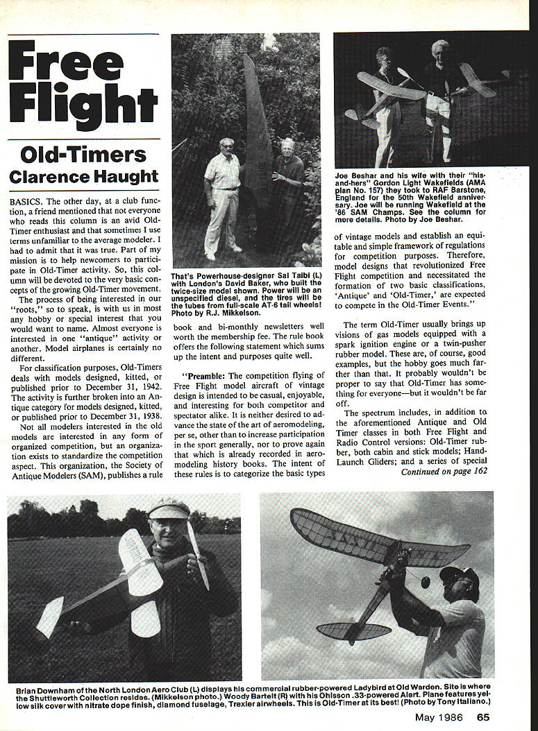 Free Flight Old-Timers Clarence Haught BASICS other day club func tion friend mentioned everyone reads column avid OldTimer enthusiast sometimes use terms unfamiliar average modeler admit true Part mission help newcomers partici pate Old-Timer activity So col umn will devoted very basic con cepts growing Old-Timer movement process being interested roots speak us hobby special interest would want name Almost everyone interested antique activity another Model airplanes certainly no different classification purposes Old-Timers deals models designed kitted published prior December 31 1942 activity further broken An tique category models designed kitted published prior December 31 1938 modelers interested old models interested form organized competition organiza tion exists standardize competition aspect organization Society Antique Modelers SAM publishes rule Thats Powerhouse-designer Sal Talbi L Londons David Baker built twicesize model shown Power will unspecified diesel tires will tubes lull-scale AT6 tail wheels Photo RJ Mikkelson book bi-monthly newsletters well worth membership fee rule book offers following statement sums up intent purposes quite well Preamble competition flying Free Flight model aircraft vintage design intended casual enjoyable interesting both competitor spectator alike neither desired ad vance state art aeromodeling per se other increase participation sport generally nor prove again already recorded aero modeling history books intent rules categorize basic types vintage models establish equi table simple framework regulations competition purposes Therefore model designs revolutionized Free Flight competition necessitated formation two basic classifications Antique Old-Timer expected compete Old-Timer Events term Old-Timer usually brings up visions gas models equipped spark ignition engine twin-pusher rubber model course good examples hobby goes much far ther probably wouldnt proper say Old-Timer has some thing everyonebut wouldnt far off spectrum includes addition aforementioned Antique Old Timer classes both Free Flight Radio Control versions Old-Timer rub ber both cabin stick models HandLaunch Gliders series special Continued page 162 Brian Downham North London Aero Club L displays corn mercial rubber-powered Ladybird Old Warden Site Shuttleworth Collection resides M ikkelson photo Woody Bartelt R Ohlsson 33-powered Alert Plane features yel low silk cover nitrate dope finish diamond fuselage Trexier airwheels Old-Timer its best Photo byTony italiano May1986 65 oe Beshar wife and-hers Gordon Light Wakefields AMA Ian No 157 took RAF Barstone nd 50th Wakefield anniver sary Joe will running Wakefield 86 SAM Champs See column details Photo Joe Beshar Step-By-Step Instructions lete Rolled Plans rate Machine Die Cut Balsa Spruce Plywood ce Spars Launch Strength THE HAND LAUNCH E HI-START H 59 Span 15 Oz 2 channel 370 Sq Area computer Modified E-193 Airfoil I DAVEY Him ONE WOOD LANE MALVERN PA 19355 215 644-6772 board built according plans adjustment apt need except some fine-tuning set center gravity CG smooth glide adjust ments keep mind warps wing tail surfaces have effect model under power CG location stab tilt important glide Rudder adjustments particularly sen sitive during launch recom mended amount stab tilt wing askew shown plans model should have good glide circle Little rudder adjustment should needed some models have found bit washin left wing helps both power glide phases little nega tive incidence stab aids recovery bad launchesbut wont let model get higb would otherwise avoid using negative stab possible hope enjoy model complex DT puts off build model friend learned fly HL Gliders Roscoe having swinging-weight DT still flying same model after year have questions comments please write Ross Jalmke W65 N727 St John Ave Cedarburg WI 53012 responding advertisers mention read about Model Aviation FF Old-Timers/Haught Continued page 65 events Power Scale Rubber Scale Tex aco Towline Glider Post 42 events Old Ruler Replica 020 Power Half-Scale Old-Timer Compressed Air Twin Rubber Power events broken down Cabin Pylon models cabin models first scene made resemble full-size lightplanes Cabin models recognized virtue having windows appropriate loca tions may sound like oversimpli fication some models have neither windows nor pylon thus brought about lengthy discussions ap propriate class competition purposes Hence rule thumb doesnt have windows must fly Pylon class Basically Pylon model has wing mounted above fuselage pylon structure confused struts utilized categorize model parasol modelbut must still fly Pylon class Pylons developed enable higher-powered engines used thus enhancing climb performance resulting hoped attain ing higher altitudes allowable engine run thus longer gliding time pylon effectively adds vertical stabilizing area forward improves directional control during climb Complicated may seem tnp Old-Timer contest will help sort out various types competitions may seem endless limit sorts Old-Timer modeling activity limited preexisting designs some may feel stifles creativity Well thats almost case founders SAM pro vided option creativity special event Old-Ruler category allows original designs conforming 1941 AMA rules ie minimum cross-sec tional area length squared divided 100 wing loading eight ounces per square foot power loading 80 ounces per cubic inch engine displace ment However years Old-Timer activity dont think Ive seen three such models Another area allowingand encouragingcreativity special event compressed-air engines Any model may used long powered Twenties-type compressed-air engine no CO-2 motors allowed utilizing max imum air pressure exceed 150 pounds per square inch motors usually homemade available plans soldered up brass tubing what have John Ponds brother Bert authority engines As can see nearly something I[ WANNA RACE JnnTLAC ACT AREAELSL BEGINNER RACES r 0-500 * FORM-i j Instructions ~CIub Programs Informatioll Contact NORTH EAST
