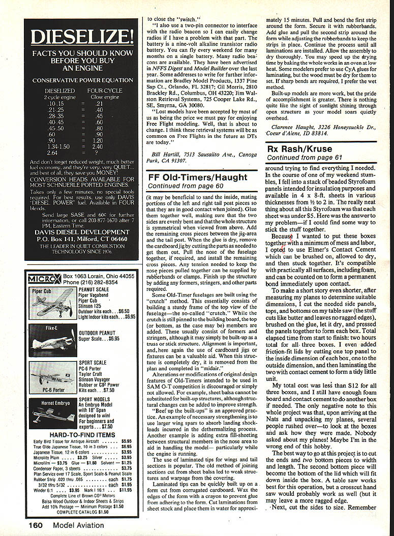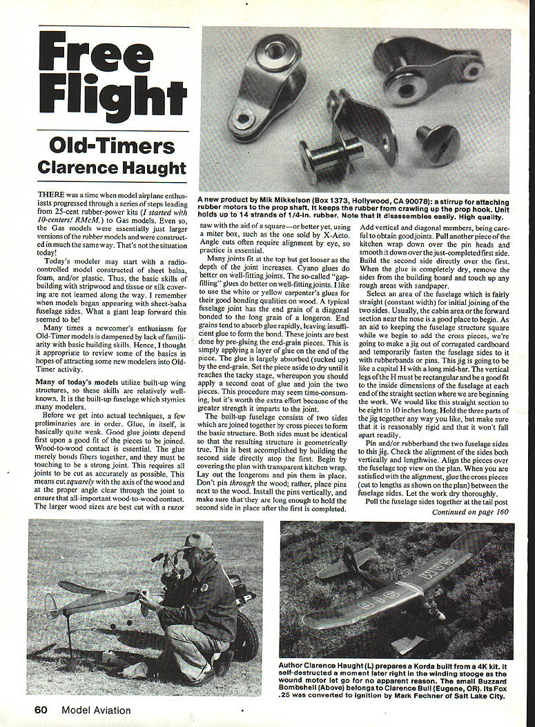 Free Flight Old-Timers Clarence Haught THERE time model airplane enthus iasts progressed through series steps leading 25-cent rubber-power kits started 10-centers RMcM Gas models Gas models essentially just larger versions rubber models construct ed much same way Thats situation today Todays modeler may start radiocontrolled model constructed sheet balsa foam and/or plastic Thus basic skills building stripwood tissue silk cover ing leamed along way remember models began appearing sheet-balsa fuselage sides What giant leap forward seemed times newcomers enthusiasm Old-Timer models dampened lack famili arity basic building skills Hence thought appropriate review some basics hopes attracting some new modelers OldTimer activity todays models utilize built-up wing structures skills relatively wellknown built-up fuselage stymies modelers Before get actual techniques few preliminaries order Glue itself basically quite weak Good glue joints depend first upon good fit pieces joined Wood-to-wood contact essential glue merely bonds fibers together mut touching strong joint requires joints cut accurately possible means cut squarely axis wood proper angle clear through joint ensure all-important wood-to-wood contact larger wood sizes best cut razor saw aid squareor better yet using miter box such sold X-Acto Angle cuts often require alignment eye practice essential joints fit top get looser depth joint increases Cyano glues better well-fitting joints so-called gap filling glues better well-fitting joints like use white yellow carpenters glues good bonding qualities wood typical fuselage joint has end graln diagonal bonded long grain longeron End grains tend absorb glue rapidly leaving insuffi cient glue form bond joints best done pre-gluing end-grain pieces simply applying layer glue end piece glue largely absorbed sucked up end-grain Set piece aside dry until reaches tacky stage whereupon should apply second coat glue join two pieces procedure may seem time-consum ing its worth extra effort because greater strength imparts joint built-up fuselage consists two sides joined together cross pieces form basic structure Both sides must identical resulting structure geometrically true best accomplished building second side directly atop first Begin covering plan transparent kitchen wrap Lay out longerons pin place Dont pin through wood rather place pins next wood Install pins vertically make sure thatthey long enough hold second side place after first completed Add vertical diagonal members being care ful obtain goodjoints Pull another piece kitchen wrap down over pin heads smooth down overthe just-completedfirst side Build second side directly over first glue completely dry remove sides building board touch up rough areas sandpaper Select area fuselage fairly straight constant width initial joining two sides Usually cabin area forward section near nose good place begin As aid keeping fuselage structure square begin add cross pieces going make jig out comigated cardboard temporarily fasten fuselage sides rubberbands pins jig going like capital H long mid-bar vertical legs H must rectangular good fit inside dimensions fuselage end stralght section beginning work would like straight section eight 10 inches long Hold three parts jig together way like make sure reasonably rigid wont fall apart readily Pin and/or rubberband two fuselage sides jig Check alignment sides both vertically lengthwise Align pieces over fuselage top view plan satisfied alignment glue cross pieces cut lengths shown plan between fuselage sides Let work dry thoroughly Pull fuselage sides together tall post Continued page 160 60 Model Aviation new product Mik Mikkeison Box 1373 Hollywood CA 90078 stirrup attaching rubber motors prop shaft keeps rubber crawling up prop hook Unit holds up 14 strands 1/4-in rubber Note disassembles easily High quality Author Ciarence Haught L prepares Korda bulit 4K kit seif-destructed moment later right winding stooge wound motor let go no apparent reason small Buzzard Bombsheii Above belongs Clarence Bull Eugene OR its Fox 25 converted ignition Mark Fechner Salt Lake City V Box 1063 Lorain Ohio 44055 282-8354 PEANUT SCALE Piper Vagabond Outdoor kits each. 3650 LightIndoorkitseach.3695 OUTDOOR PEANUT SuperScale. 3695 SPORT SCALE PC-6 Porter q Taylor Crall Stinson Voyager Rubber CO2 Power PC-S PorterKits each. 3750 fIPORT MODELS n Embryo Model lb l8 Span gned win beginners experts. 3750 HARD-TO-FIND ITEMS Early Bird Tissue Antique Aircraft 3595 True Olde Japanese Tissue 10 3 colors 95 Japanese Tissue 12 6 colors 3395 Microlite ham3325 Silver$395 Microfilm 3375 Glue Solvent Condenser Paper 3 sheets 3315 Plan Service over 17 Scale Sport Scale & Peanut Scale Rubber Strip 020 thirs 085each 3175 3132 thirs 5/32each 3105 Winder 61 395 Mark 1161 105 Complete Line Brown CO2 Motors Balsa Wood Outdoor & Indoor Sheets & Strips Add 10% Postage mum Postage 3150 COMPLETE CATALOG 3150 close switch also use two-pin connector interface radio beacon can easily change radios have problem part battery nine-volt alkaline transistor radio battery can fly weekend months single battery radio bea cons avallable have advertised NFFS Digest Model Builder over last year Some addresses write further infor mation Bradley Model Products 1337 Pine Sap Ct Orlando FL 32817 Gil Morris 2810 Brackley Rd Columbus OH 43220 Jim Wal ston Retrieval Systems 725 Cooper Lake Rd SE Smyrna GA 30080 Lost models have accepted us being price must pay enjoying Free Flight modeling Well about change think retrieval systems will common Free Flights future DTs today Bill Hartill 7513 Sausalito Ave Canoga Park CA 91307 FF Old-Timers/Haught Continued page 60 may beneficial sand inside mating portions left right tail post pieces good contact joined Glue together well making sure two sides evenly bent whole structure symmetrical viewed above Add remaining cross pieces between jig-area tail post glue dry remove cardboardjigby cutting parts needed get out Pull nose fu