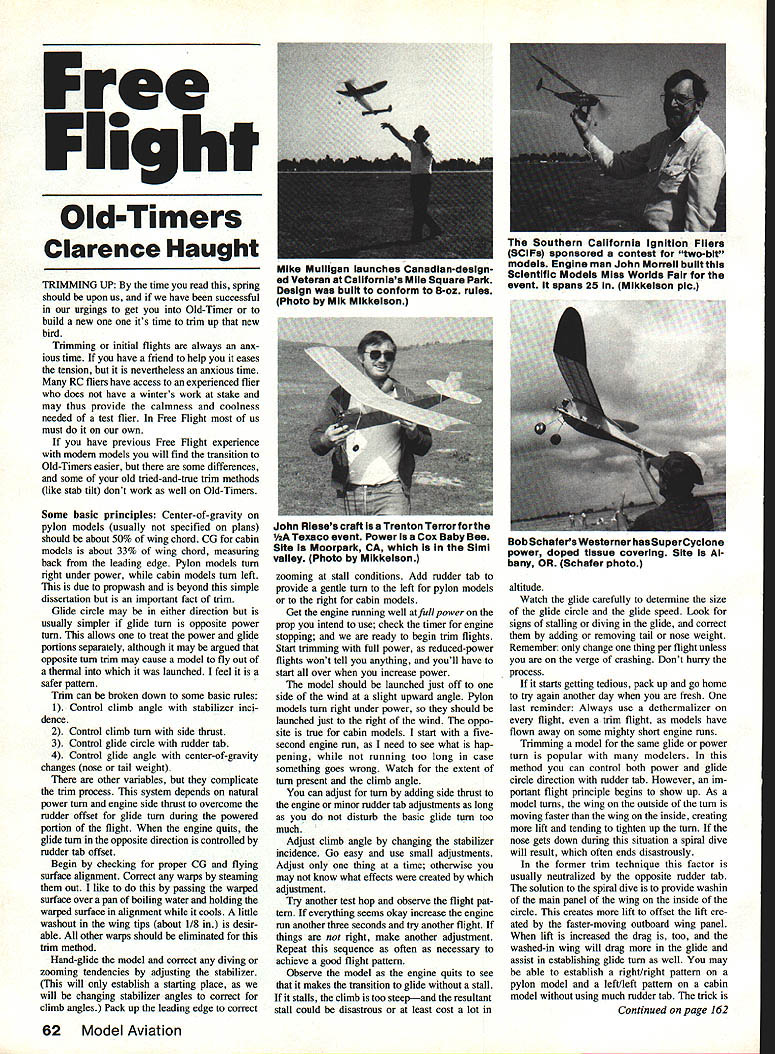 Free Flight Old-Timers Clarence Haught TRIMMING UP time read spring should upon us have successful urgings get Old-Timer build new one its time trim up new bird Trimming initial flights always anx ious time have friend help eases tension nevertheless anxious time RC fliers have access experienced flier does have winters work stake may thus provide calmness coolness needed test flier Free Right us must own have previous Free Flight experience modem models will find transition Old-Timers easier some differences some old tried-and-true trim methods like stab tilt dont work well Old-Timers Some basic principles Center-of-gravity pylon models usually specified plans should about 50% wing chord CG cabin models about 33% wing chord measuring back leading edge Pylon models turn right under power cabin models turn left due propwash beyond simple dissertation important fact trim Glide circle may either direction usually simpler glide turn opposite power turn allows treat power glide portions separately although may argued opposite turn trim may cause model fly out thermal launched feel safer pattern Trim can broken down some basic rules 1 Control climb angle stabilizer inci dence 2 Control climb turn side thrust 3 Control glide circle rudder tab 4 Control glide angle center-of-gravity changes nose tail weight other variables complicate trim process system depends natural power turn engine side thrust overcome rudder offset glide turn during powered portion flight engine quits glide turn opposite direction controlled rudder tab offset Begin checking proper CG flying surface alignment Correct warps steaming out like passing warped surface over pan boiling water holding warped surface alignment cools little washout wing tips about 1/8 desir able other warps should eliminated trim method Hand-glide model correct diving zooming tendencies adjusting stabilizer will establish starting place will changing stabilizer angles correct climb angles Pack up leading edge correct zooming stall conditions Add rudder tab provide gentle turn left pylon models right cabin models Get engine running well full power prop intend use check timer engine stopping ready begin trim flights Start trimming full power reduced-power flights wont tell anything youll have start over increase power model should launched just off side wind slight upward angle Pylon models turn right under power should launched just right wind oppo site true cabin models start fivesecond engine run need see what hap pening running too long case something goes wrong Watch extent turn present climb angle can adjust turn adding side thrust engine minor rudder tab adjustments long disturb basic glide turn too much Adjust climb angle changing stabilizer incidence Go easy use small adjustments Adjust thing time otherwise may know what effects created adjustment Tiy another test hop observe flight pat tern everything seems okay increase engine run another three seconds try another flight things right make another adjustment Repeat sequence often necessary achieve good flight pattern Observe model engine quits see makes transition glide stall stalls climb too steepand resultant stall could disastrous least cost lot altitude Watch glide carefully determine size glide circle glide speed Look signs stalling diving glide correct adding removing tail nose weight Remember change thing per flight unless verge crashing Dont hurry process starts getting tedious pack up go home try agaln another day fresh last reminder Always use dethermalizer flight trim flight models have flown away some mighty short engine runs Trimming model same glide power turn popular modelers method can control both power glide circle direction rudder tab However im portant flight principle begins show up As model turns wing outside turn moving faster wing inside creating lift tending tighten up turn nose gets down during situation spiral dive will result often ends disastrously former trim technique factor usually neutralized opposite rudder tab solution spiral dive provide washin main panel wing inside circle creates lift offset lift cre ated faster-moving outboard wing panel lift increased drag too washed-in wing will drag glide assist establishing glide turn well may able establish right/right pattern pylon model left/left pattern cabin model using much rudder tab trick Continued page 162 62 Model Aviation Mike Mulligan launches Canadiandesign ed Veteran Californias Mile Square Park Design built conform 8-az rules Photo Mik Mikkeison Southern California ignition Fliers SCiFs sponsored contest two-bit models Engine man John Morreil built Scientific Models Miss Worlds Fair event spans 25 Mikkeison plc John Rieses craft isa Trenton Terror forthe 1/aA Texaco event Power isa Cox Baby Bee Site Moorpark CA Simi valley Photo Mikkeison BobSchafers Westerner has SuperCyclone power doped tissue covering Site Al bany OR Schafer photo SMHTh ZNDUETNZRD 7555 S GbeI 5od Atmcadeo CA 93422 5I 456-1717 am InvIted join NATIONAL SOARING SOCIETY OFFICIAL AMA SOARING SPECIAL INTERESTGROUP YEARLY NSS SOAR-IN TOURNAMENTS NATION-WIDE EXCELLENCE AWARDS PROGRAM EXCELLENT 81-MONTHLY NEWSLETTER NSS FULLY SUPPORTS ThE F3B SOARING TEAM & 1SF SOARING PROGRAM NSS IS INVOLVED IN ThE ORGANIZATION AND OVERSEEING O ThE SOARING PORTION OF AMA NATS INCLUDING AWARDS BANQUET YEARLY DUES ARE $1200 SPECIAL FAMILY RATES NSS OFFICERS ARE FROM ALL 11 DISTRICTS Information Contact NSS Secretary/Treasurer R T DICK CR0 WLEY P0 Box 440342 Aurora CO 80044 towards supporting category Free Flight Club memberships $1250 per year says year-end renewal slip Should lower rates subscription newsletter am unable say can write Jim Adams SCAMPS Secretary 2538 W Spurgeon Santa Ana CA 92706 inquire accordingly Excuse now go dye some plastic See ya downwind Harry Murphy 3824 Oakwood Blvd Ander son IN 46011 FF Old-Timers/Haught Continued page 62 much wasbin trailing edge down enough Most fliers start i Other trim factors same both methods trim situation t