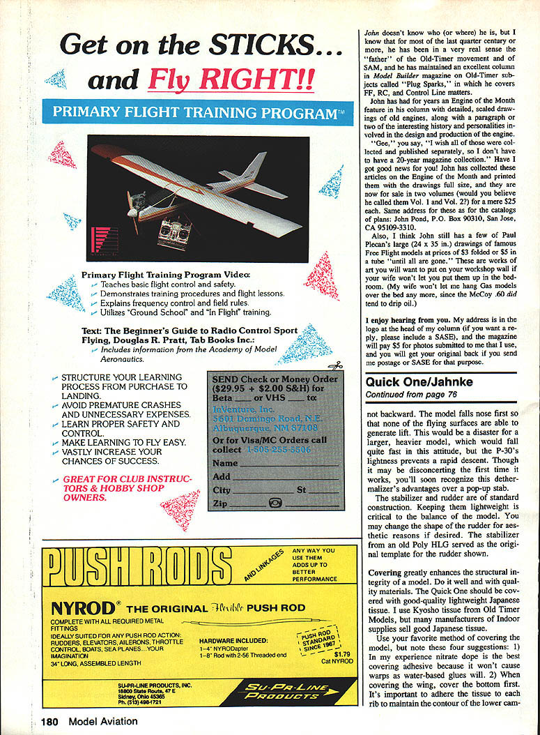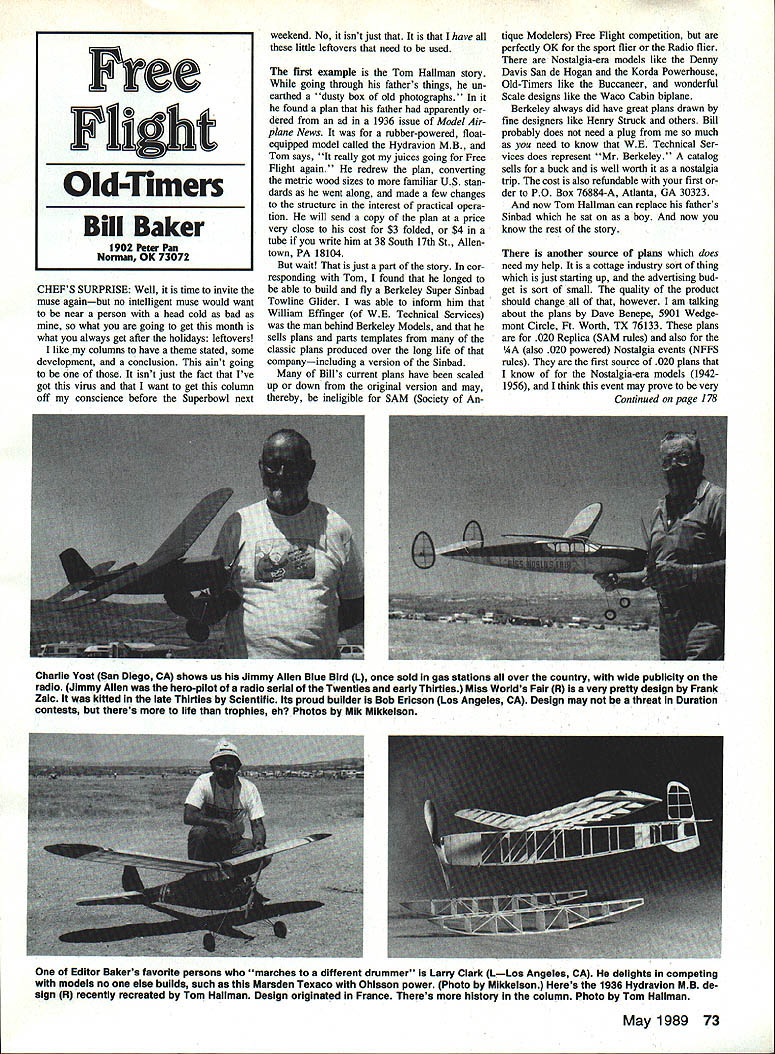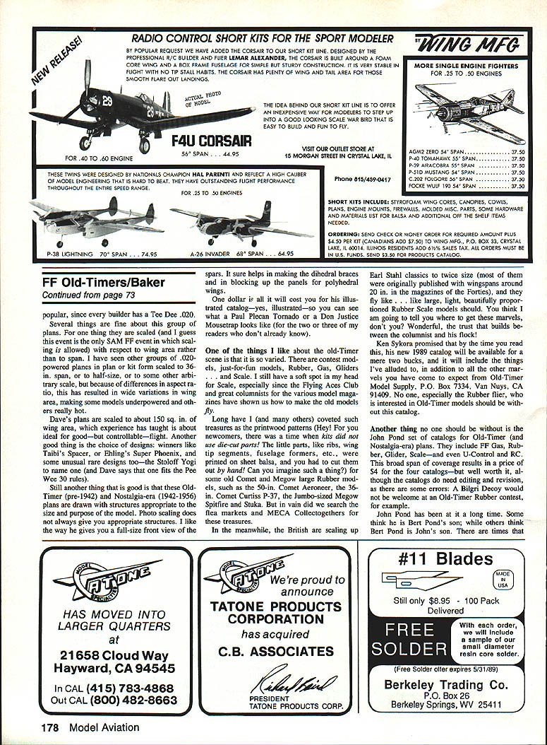CHEFS SURPRISE Well time invite muse againbut no intelligent muse would want near person head cold bad what going get month what always get after holidays leftovers like columns have theme stated some development conclusion aint going isnt just fact Ive got virus want get column off conscience before Superbowl next weekend No isnt just that have little leftovers need used rt example Tom Hallman story going through fathers things un earthed dusty box old photographs found plan father apparently dered ad 1936 issue Model Air plane News rubber-powered floatequipped model called Hydravion MB Tom says really got juices going Free Flight again redrew plan converting metric wood sizes familiar US stan dards went along made few changes structure interest practical opera tion will send copy plan price very close cost $3 folded $4 tube write him 38 South 17th St Allen town PA 18104 wait just part story cor responding Tom found longed able build fly Berkeley Super Sinbad Towline Glider able inform him William Effinger WE Technical Services man behind Berkeley Models sells plans parts templates classic plans produced over long life companyincluding version Sinbad Bills current plans have scaled up down original version may thereby ineligible SAM Society Antique Modelers Free Flight competition perfectly OK sport flier Radio flier Nostalgia-era models like Denny Davis San de Hogan Korda Powerhouse Old-Timers like Buccaneer wonderflil Scale designs like Waco Cabin biplane Berkeley always did have great plans drawn fine designers like Henry Struck others Bill probably does need plug much need know WE Technical Ser vices does represent Mr Berkeley catalog sells buck well worth nostalgia trip cost also refundable first der PO Box 76884-A Atlanta GA 30323 now Tom Hallman can replace fathers Sinbad sat boy now know rest story another source plans does need help cottage industry sort thing just starting up advertising bud get sort small quality product should change however am talking about plans Dave Benepe 5901 Wedgemont Circle Ft Worth TX 76133 plans 020 Replica SAM rules also AA also 020 powered Nostalgia events NFFS rules first source 020 plans know Nostalgia-era models 19421956 think event may prove very Continued page 178 May 1989 73 Free Flight Old-timers Bill Baker 1902 Peter Pan Nonnaa OK 73072 Charlie Yost San Diego CA shows us Jimmy Allen Blue Bird L once sold gas stations over country wide publicity radio Jimmy Allen hero-pilot radio serial Twenties early Thirties Miss Worlds Fair R isa very pretty design Frank Zaic kitted late Thirties Scientific its proud builder Bob Erlcson Los Angeles CA Design may threat Duration contests theres life trophies eh Photos Mik Mikkelson Editor Bakers favorite persons marches different drummer Larry Clark LLos Angeles CA delights competing models no else builds such Marsden Texaco Ohisson power Photo Mlkkelson Heres 1936 Hydravion MB de sign R recently recreated Tom Haliman Design originated France Theres history column Photo Tom Hailman RADIO CONTROL SHORT KITS FOR THE SPORT MODELER BY POPULAR REQUEST WE HAVE ADDED THE CORSAIR TO OUR SHORT KIT LINE DESIGNED BY THE PROFESSIONAL R/C BUILDER AND FLIER LEMAR ALEXANDER THE CORSAIR IS BUILT AROUND FOAM CORE WING AND BOX FRAME FUSELAGE FOR SIMPLE BUT STURDY CONSTRUCTION IT IS VERY STABLE IN FLIGHT WITH NO TIP STALL HABITS THE CORSAIR HAS PLENTY OF WING AND TAIL AREA FOR THOSE SMOOTH FLARE OUT LANDINGS 5110t0 OT F4U CORSAIR 56 SPAN44 95 THE IDEA BEHIND OUR SHORT KIT LINE IS TO OFFER INEXPENSIVE WAY FOR MODELERS TO STEP UP INTO GOOD LOOKING SCALE WAR BIRD THAT IS EASY TO BUILD AND PUN TO FLY VISIT OUR OUTLET STORE AT IS MORGAN STREET IN CRYSTAL LAXE IL Phone 8I5/459-a41 7 THESE TWINS WERE DESIGNED BY NATIONALS CHAMPION HAL PARENTI AND REFLECT NIGH CALIBER OF MODEL ENGINEERING THAT IS HARD TO BEAT THEY HAVE OUTSTANDING FLIGHT PERFORMANCE THROUGHOUT THE ENTIRE SPEED RANGE FOR 25 TO 50 ENGINES FF Old-Timers/Baker Continued page 73 popular since builder has B Tee Dee 020 Several things fine about group plBns thing scaled guess event SAM FF event scal ing allowed respect wing area rather span have seen other groups 020powered planes plan kit form scaled 36in span half-size some other arbi trary scale because differences aspect ra tio has resulted wide variations wing area making some models underpowered oth ers really hot Daves plans scaled about 150 sq wing area experience has taught about ideal goodbut controllableflight Another good thing choice designs winners like Taibis Spacer Ehlings Super Phoenix some unusual rare designs toothe Stoloff Yogi name Dave says fits Pee Wee 30 rules Still another thing good OldTimer pre-1942 Nostalgia-era 1942-1956 plans drawn structures appropriate size purpose model Photo scaling does always give appropriate structures like way gives full-size front view A-26INVADER 68 SPAN6495 spars sure helps making dihedral braces blocking up panels polyhedral wings dollar i will cost illus trated catalogyes illustratedso can see what Paul Plecan Tornado Don Justice Mousetrap looks like two three readers dont already know things like about old-Timer scene varied contest mod els just-for-fun models Rubber Gas Gliders . Scale still have soft spot head Scale especially since Flying Aces Club great columnists various model maga zines have shown us make old models fly Long have others coveted such treasures printwood patterns Hey newcomers time kits did use die-cut pans little parts like ribs wing tip segments fuselage formers etc printed sheet balsa cut out hand Can imagine such thing some old Comet Megow large Rubber mod els such 50-in Comet Aeroneer 36in Comet Curtiss P-37 Jumbo-sized Megow Spitfire Stuka vain did search flea markets MECA Collectogethers treasures meanwhile British scaling up MORE SINGLE ENGINE FIGHTERS POR 25 TO 50 ENGINES 1fNG MF6 AGM2 ZERO 54 SPAN3750 P40 TOMAHAWK 55 SPAN3750 p39 AIRACOBRA 55 SPAN3750 P-51D MUSTANG 54 SPAN3750 C302 FOLGORE 56 SPAN3750 POCKE WULF 190 54 SPAN3750 SHO