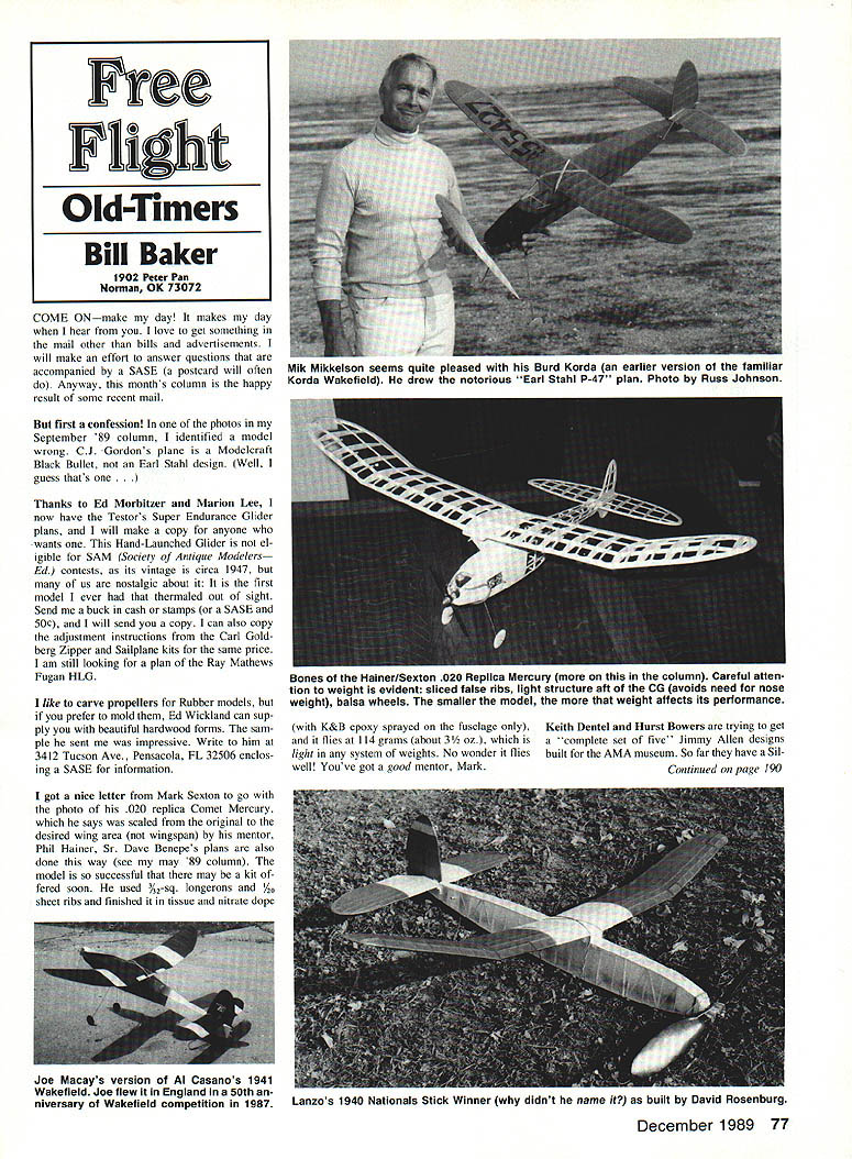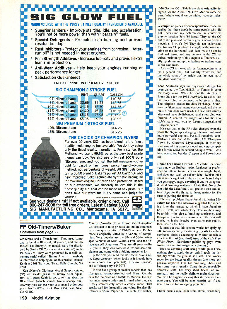COME ONmake day makes day hear love get something mail other bills advertisements will make effort answer questions accompanied SASE postcard will often Anyway months column happy result some recent mail first confession photos September 89 column identified model wrong CJ Gordons plane Modeleraft Black Bullet Earl Stahl design Well guess thats nks Ed Morbitzer Marion Lee now have Testors Super Endurance Glider plans will make copy anyone wants Hand-Launched Glider el igible SAM Society Antique Modelers Ed contests its vintage circa 1947 us nostalgic about first model ever thermaled out sight Send buck cash stamps SASE 50C will send copy can also copy adjustment instructions Carl Gold berg Zipper Sailplane kits same price am still looking plan Ray Mathews Fugan HLG like carve propellers Rubber models prefer mold Ed Wickland can sup ply beautiful hardwood forms sam ple sent impressive Write him 3412 Tucson Ave Pensacola FL 32506 enclos ing SASE information got nice letter Mark Sexton go photo 020 replica Comet Mercury says scaled original desired wing area wingspan mentor Phil Hainer Sr Dave Benepes plans also done way see may 89 column model successful may kit fered soon used %2-sq longerons / sheet ribs finished tissue nitrate dope K&B epoxy sprayed fuselage Keith Dentel Hurst Bowers trying get flies 114 grams about 3 oz compIete set five Jimmy Allen designs light system weights No wonder flies built AMA museum So far have Sil well Youve got good mentor Mark Continued page 190 December 1989 77 Free Flight Old-Timers Bill Baker 1902 Peter Pan Norman OK 73072 Mik MIKKelson seems quite pleased Burd Korda earlier version familiar Korda Wakefield drew notorious Earl Stahl P47 plan Photo Russ Johnson Bones Hainer/Sexton 020 Replica Mercury column Careful atten tion weight evident sliced false ribs light structure aft CG avoids need nose weight balsa wheels smaller model weight affects its performance Joe Macays version Al Casanos 1941 Wakefield Joe flew England 50th niversary Wakefield competition 1987 Lanzos 1940 Nationals Stick Winner didnt name built David Rosenburg U EEEEEEEEEEmEEEE U EEEEUEEEUEUN GLOW FUEL MANUFACTURED WITH THE PUREST FINEST QUALITY INGREDIENTS AVAILABLE * Superior Igniters Improve starting idle acceleration Youll notice power bargain fuels * Special Detergents Promote clean burning prevent U residue buildup * Rust Inhibitors Protect engines corrosion After run oil needed engines * Film Strength Additives Increase lubricity provide extra lean run protection * Anti-Wear Additives Help keep engines running peak performance longer * U U U N U U U U N I THE CHOICE OF CHAMPION FLYERS over 20 years SIG has blending finest quality model engine fuel available using finest quality ingredients instance Methanol use 995% pure very best grade money can buy also use real 100% pure UNitromethane get full measure youve paid based honest percentage-of-volume Imethod percentage weight SIG fuels contam 50-50 blend Bakers purest AA castor Oil new improved Klotz Techniplate Synthetic Racing Oil maximum engine lubrication protection Based experience sincerely believe finest quality fuel can made price dont take word try some judge UyourselfPrcessbIed eh gwthoot flOtiOO See dealer first available order direct Call 800-247-5008 toll free orders Latest Catalog $300 SIG MANUFACTURING CO Montezuma IA 50171 EEEEEEEEEm u mm mm mm FF Old-Timers/Baker Continued page 77 ver Streak Thunderbolt need some build Bluebird Skyraider Yellow Jacket Jimmy Allen models kits distrib uted Skelly Oil Co service stations 1932-37 era promoted radio ad venture serial called Jimmy Allen anybody interested helping out project contact Keith 3361 Tallwood Terr Falls Church VA 22041 Ken Sykoras Oldtimer Model Supply catalog $2 lists six designs Jimmy Allen Squad ron guess Keith forgot tell about Blue Flash sounds like speedy Anyway can get catalog order plans OTMS PO Box 7334 Van Nuys CA 91409 E U U U U I I U U U I U I U U U U Martin Crowder Fresno Model Airplane Co has raise prices tad continues make quality kits Old-Timer era Rubber models originally kitted variety compa nies Very popular 30- 50-in wing span versions Miss Worlds Fair 45in-span American sorta realis tic look somewhat like full-scale air planes come folding propeller kit time read should have 40in Super Snooper looks could have some competition potential 30-in Swoose vintage-style P-30 also has group smaller models look like great vacant-lot/schoolyard fliers Get data price SASE Marion says people order kit after see immediately order couple speaks well quality value also dis tributes 32-in Zipper Jr suitable rubber Satisfaction Guaranteed FREE SHIPPING ON ORDERS OVER $1500 SIG CHAMPION 2-STROKE FUEL GALLON $1075 $1275 $1475 $1675 $2195 $2695 FUEL $1425 $1625 PflJT ifrot1I 5% Nitromthane $6$ $525 10% Nitroe~ $ 15j I15% NitromthanJ %43Qi 25% Nltrortt -t * 15 9$ 35% Nitromefhane $5 95$9 25 SIG PREMIUM 4-STROKE 10% Nitromethane 15% Nitromethane 020 Gas CO2 plane originally de signed Atom 09 Give Marion some ders would cottage indus tries couple pieces correspondence made realize could some people did understand column center-ofgravity location July 89 issue cut CG out plan carefully glue onand models still wont fly understand CG position angle wing rel ative horizontal stabilizer must set trial error change CG re quires retrimming angular difference usu ally shimming up leading trailing edge stabilizer As CG moved aft performance increases general rule stability decreases whole point article locating ideal compromise Leon Shulman says Skyscraper design has called TAMBE Tambe error years sent sketches Frank Zaic 1938 Yearbook asked model club belonged given plug Airplane Model Builders Exchange Some Skyscraper name deleted itials club used says shortly afterward club disbanded new club formed contest suggestions new clubs name won Leons suggestion Skyscrapers says FF rules changed over years Skyscraper design got heavier used powerful engines still remained c