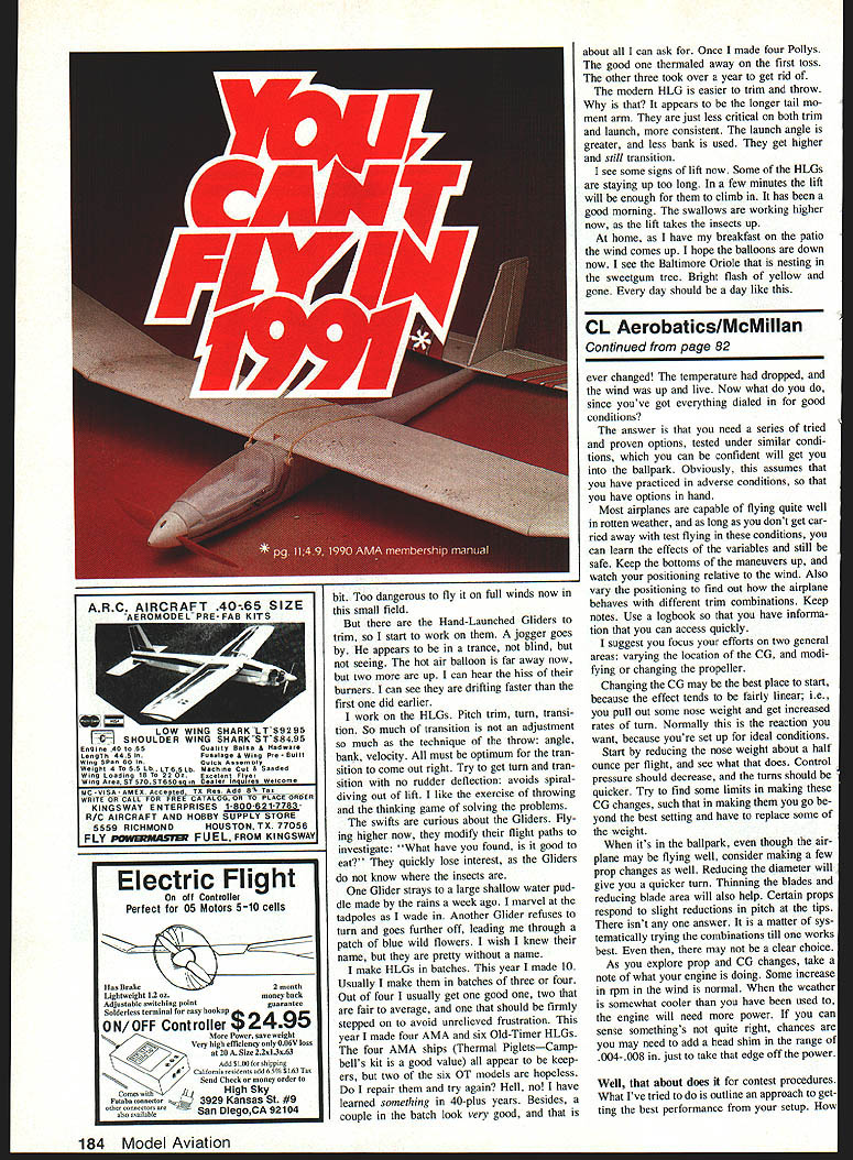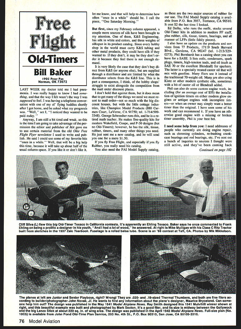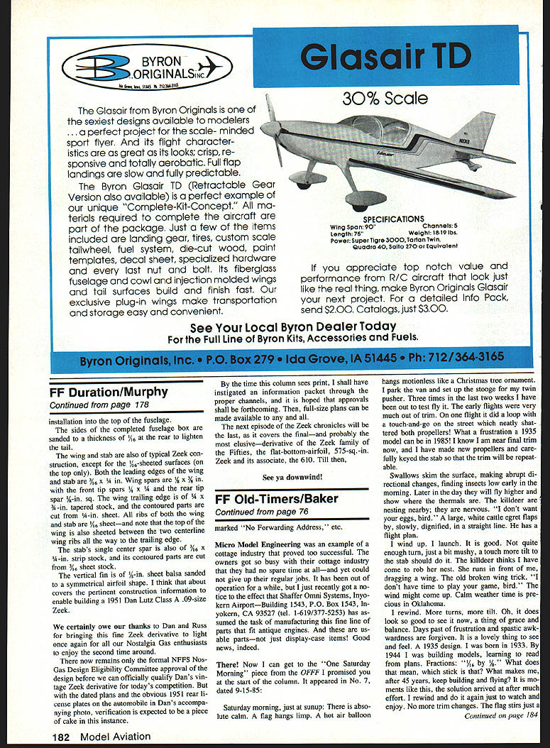 LAST WEEK doctor told pneu monia really happy know some thing way felt wasnt way supposed feel having telephone conver sation ol flying buddies shortly after got home asked what prognosis Well sez I noticed wanted paid today Anyway am still bit tired weak time am going take advantage per mission editor publisher MA gave use certain material old Okie Free Flight Flyer newsletter used write pub lish said could use some favorite bits once Well will big help time because will take up about half usual column space like dont like let know will help determine often once should call piece Saturday Morning first since February column appeared couple sources silk have brought attention K&S Engineering has silk white colors three weights silkspan its product catalog Since hobby shop world must carry K&S tubing other metal products could have silk wanted dont may dont der because feel enough de mand very likely case dont buy di rect K&S anyone else supplied through distributor limited what distributor selects K&S line part consequence think hobby shops struggle exist alongside competition mail order discount places dont hold against does mean get things need must re sort mail ordernot much big dis count houses little cottage indus tries like Champion Model Products 880 Car men Court LaVerne CA 91750 tel 1-714/5993348 George Schroedter runs re tired math teacher makes fine-quality kits modern Wakefield Coupe P-30 designs no Old-Timers however has silk tissue rubber timers other things need just sent new catalog will send mere $150 fly Free Flight especially fly Rubber really need catalog also need FAI Model Supply catalog two major sources rubber use FM Model Supply catalog avail able PO Box 3957 Torrance CA 90510 cost $2 last time looked Ed Dolby runs outfit stocks several Old-Timer kits addition modem FF stuff plus rubber silk tissue timers bearings manner LFPs little fiddly pieces also have update products ser vices 77 Products 17119 South Harvard Blvd Gardena CA 90247 tel 1-213/3290273 Phil Bernhardt has catalog sheet can have SASE lists coils condensers spark plugs timers high-tension leads oil such SAE 70 excellent Blendzall sparkers latter specially treated castor oil will mix gasoline fliers use instead traditional 70-weight oil also using Klotz other modem synthetic oils sometimes bit castor oil Blendzall added Phil can also some custom engine work cluding average cost $55 installa tion ignition timers either modem glow en gines antique engines incomplete tim ersor owner may simply want better timer original have seen some work can recommend have oth erwise good engine missing broken timer assembly Phil best bet need some help need addresses people currently doing engine repair such chroming cylinders re-bushing crank case bearings rod bearings etc Ive sent out bunch inquiries sources thought still active theyve coming back Continued page 182 Cliff Silva L flew big Old-Timer Texaco California contests its apparently Ehling Texaco Baker says once commented Frank Ehling being prolific designer youth lot wood answered right Mike Mulligan Class C Ritz Tractor built sketches 1937 Zaic Yearbook Fuselage rolled balsa tube Scene 88 contest Taft CA Photos Mik Mikkelson planes left Junior Senior Playboys right Wrong 020- 19-sized Thermal Thumbers both fine fliers ac cording builder/photographer John Novak Jr wants find information about planes designer Maurice Bryceland Can some help him out design published May 1941 Model Airplane News Ray Smith designed 1941 Muivihill winner shown right beautiful example built photographed Mark Sexton Its good flier its size midway between Gollywock big Lanzo Stick about 220 sq wing area design published April 1942 Model Airplane News Full-size plan No lOCS available John Pond Old-Time Plan Service 253 No 4th St PO Box 90310 San Jose CA 95109-3310 76 Model Aviation Free Flight Old-Timers Bill Baker i902 Peter Pan Norman OK 73072 RIGINALSN# b5U1PlUll Glasair Byron Originals 1 sexiest designs available modelers . perfect project scale- minded sport flyer its flight character istics great its looks crisp re sponsive totally aerobatic Full flap landings slow fully predictable Byron Glasair TD Retractable Gear Version also available perfect example unique Complete-Kit-Concept ma terials required complete aircraft part package Just few items included landing gear tires custom scale tailwheel fuel system die-cut wood paint templates decal sheet specialized hardware last nut bolt Its fiberglass fuselage cowl injection molded wings tail surfaces build finish fast exclusive plug-in wings make transportation storage easy convenient appreciate top notch value performance RIO aircraft look just like real thing make Byron Originals Glasair next project detailed Info Pack send $200 Catalogs just $300 installation top fuselage sides completed fuselage box sanded thickness 1/16 rear lighten tail wing stab also typical Zeek con struction except /16-sheeted surfaces top Both leading edges wing stab /l6 x Wing spars / x % front tip spars x rear tip spar %-in sq wing trailing edge x -in tapered stock contoured parts cut A-in sheet ribs both wing stab /16 sheetand note top wing also sheeted between two centerline wing ribs way trailing edge stabs single center spar also /I6 X A-in strip stock its contoured parts cut /l6 sheet stock vertical fin /8-in sheet balsa sanded symmetrical airfoil shape think about covers pertinent construction information enable building 1951 Dan Lutz Class 09-size Zeek certainly owe thanks Dan Russ bringing fine Zeek derivative light once again Nostalgia Gas enthusiasts enjoy second time around now remains formal NFFS Nos Gas Design Eligibility Committee approval design before can officially qualify Dans vin tage Zeek derivative todays competition dated plans obvious 1951 rear li cense plates automobile Dans accompa nying photo verification expected piece cake instance See Local Byron Dealer Today Full Line Byron Kits Accessories Fuels time column sees print sh