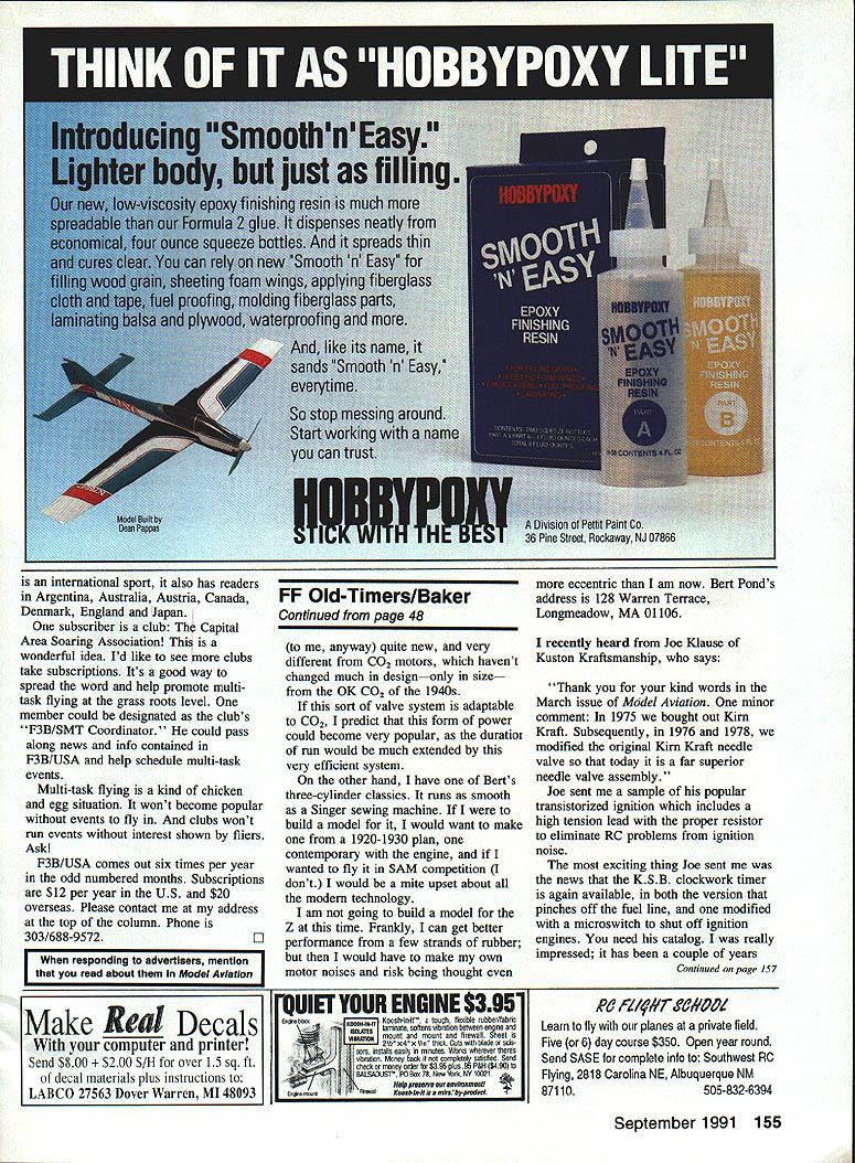 MY ITALIAN correspondent Ferdi Gale sent Z-model compressed air motors sold country Bert Pond described few issues back John Worth am going detailed review will just say motor runs easy operate could answer looking quiet power flying lightweight models handful people fly SAM compressed air event have taken motor Bert says compressed air flights 1990 Nationals Lawrenceville made Z motor says Hungarian expert Benedek flies light built-up 55-in-span RC model Z Ferdi Gale says factory may market twin cylinder version thinks motor produced will allow lightweight RC free flight RC models factory literature indicates operating pressure range motor 12 times atmospheric pressure tank listed seven atmospheres Bert Pond says use one-liter soda bottle place Z models 76 liter tank volume greater safety margin liter bottles dont burst until well over 200 psi SAM rules limit pressure 150 psi fact about oaly rule present time compressed air models goes say fliers adapt motors larger propellers such yellow P-30 type plastic propellers use electric pumps driven car cigarette lighter socket instead hand pump furnished motor Berts instructions supplied motor include details reinforcements youll want use cylinder head going use pressure get hand pump clever design motor may influence future CO2 engine design should made clear CO2 engine will tolerate such pressures motor does have much power ancient brass Hoosier Whirlwind three-cylinder job Bert also makes sells much lighter seven grams 30gram weight supplied tank possible fly smaller models handle some wind traditional compressed air model huge 60- 70-in span very lightly built order get wing loading low enough fly early morning calm fragile flew low speedsalmost like Indoor models English magazine Aeromodeler April 1990 has article about Z motor scale expert Doug McHard features photos Piper Super Cruiser 40-in span built 1940 Comet plan article has much technical data about power plant including drawings valving Continued page 155 48 Model Aviation Old-Timers Bill Baker 1902 Peter Pan Norman OK 73072 Are having fun yet Art Watkins Mountain View California sure hes flying Mal corn Abzug 5-4 Shrimpo designed Mighty Atom 097 IgnItion engine Arts has diesel about 049 dIsplacement Background Lost Hills Photo Mik Mikkelson Now have ViA Texaco Gas Scale Free Flight Flown FF Texaco rules must pre 1942 design winner Dick Lyons Farman 400 Cox 049 Reed valve engine runs long time special fuel nine-inch diameter prop Winning time SCIF 1991 kickoff contest over 18 minutes Mlkkelson photo Heaven Bound rubber stick model built Bill Cushenbery Bakersfield California Fine flying design along similar Arch Angel same designer Garafalo provIdes good al ternative Korda-Lanzo designs John Pond P0 Box 90310 San Jose CA 95109-3310 has plans Mikkelson photo international sport also has readers Argentina Australia Austria Canada Denmark England Japan subscriber club Capital Area Soaring Association wonderful idea Id like see clubs take subscriptions Its good way spread word help promote multitask flying grass roots level member could designated clubs F3B/SMT Coordinator could pass along news info contained F3B/USA help schedule multi-task events Multi-task flying kind chicken egg situation wont become popular events fly clubs wont run events interest shown fliers Ask F3B/USA comes out six times per year odd numbered months Subscriptions $12 per year US $20 overseas Please contact address top column Phone 303/688-9572II responding advertisers mention read about Model Aviation anyway quite new very different CO2 motors havent changed much designoaly size OK CO2 1940s sort valve system adaptable C02 predict form power could become very popular duratior run would much extended very efficient system other hand have Berts three-cylinder classics runs smooth Singer sewing machine build model would want make 1920-1930 plan contemporary engine wanted fly SAM competition dont would mite upset about modern technology am going build model Z time Franldy can get better performance few strands rubber would have make own motor noises risk being thought recently heard Joe Klause Kuston Kraftsmanship says Thank kind words March issue Model Aviation minor comment 1975 bought out Kim Kraft Subsequently 1976 1978 modified original Kim Kraft needle valve today far superior needle valve assembly Joe sent sample popular transistorized ignition includes high tension lead proper resistor eliminate RC problems ignition notise exciting thing Joe sent news KSB clockwork timer again available both version pinches off fuel line modified microswitch shut off ignition engines need catalog really impressed has couple years Continued page 157 F DIET YOUR ENGINE $39511 IEwes ewKoosh h fleolbie rabber/faboc II Ilaminate softens sibnst inn between engine II money order 5395 plan 56 P&H $490 t sod mount firewall Sheet II I2bx4uhn thick CoSs blade scis ors stallo easily minutesrho ewoer thems IBALSeSUSt P0 Boo 75 New rk NY tSO2t bastion Money back 05t complet aly natrohted Send eli Heepeerenerve eeareerdreemeetI Keeaheerfteaawfrnby-pwdece Ae P14kX//OO1 Learn fly planes private field Five 6 day course $350 Open year round Send SASE complete info Southwest RC Flying 2818 Carolina NE Albuquerque NM 87110505-832-6394 September 1991 155 eccentric am now Bert Ponds FF Old-Timers/Bakeraddress 128 Warren Terrace Continued page 48Longmeadow MA 01106 Make Real Decals computer printer Send $800 S/H over 15 sq ft decal materials plus instructions LABCO 27563 Dover Warren MI 48093 Hobby Horn hobby specialties MIUWAT MODEL CO Old timer Kits RIO AND FF Hobby Horn discount prices MMC FULL KITS listed Full Kits include cut parts plan strip sheet wood wire window material Kits marked wire tandinear pre-bent6799 1938 P~house 5O3596 1939 rSportster LonoCabin 784952 503596 1937 Quaker Flash 67 4784 1940 Buzzard Bombshell 50 span klt*35 96 1937 Air Chief 613776 1940 New Ruler 74I 1939 Thermic 100 Glider 100 Span Old Timer 7472 Sailplane--m