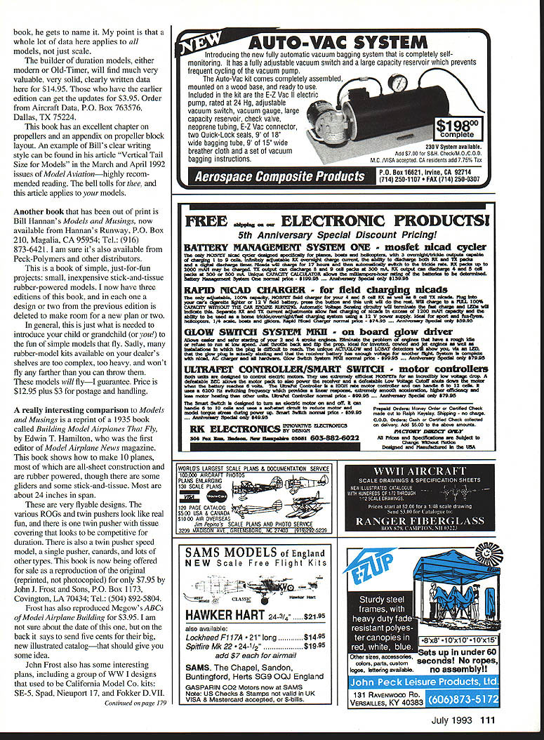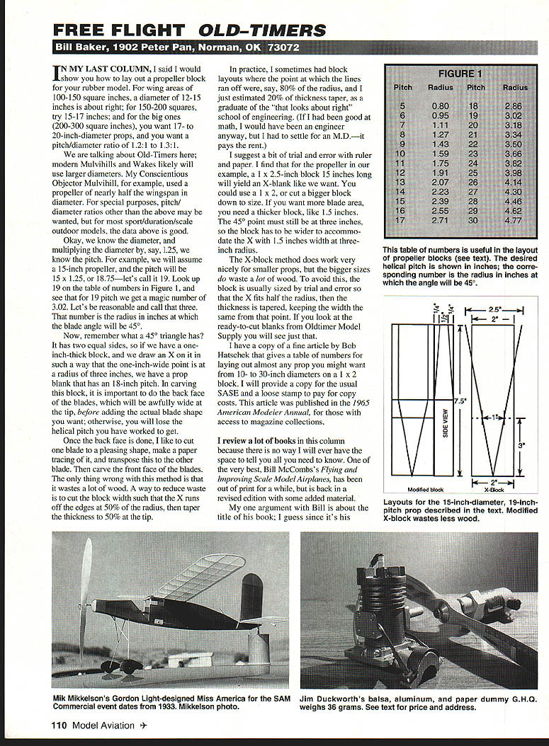 FREE FLIGHT OLD-TIMERS 11111 N MY LAST COLUMN said would show lay out propeller block rubber model wing areas 100-150 square inches diameter 12-15 inches about right 150-200 squares try 15-17 inches big ones 200-300 square inches want 17- 20-inch-diameter props want pitch/diameter ratio 121 131 talking about Old-Timers modem Mulvihills Wakes likely will use larger diameters Conscientious Objector Mulvihill example used propeller nearly half wingspan diameter special purposes pitch diameter ratios other above may wanted sport/duration/scale outdoor models data above good Okay know diameter multiplying diameter say 125 know pitch example will assume 15-inch propeller pitch will 15 x 125 1875lets call 19 Look up 19 table numbers Figure 1 see 19 pitch get magic number 302 Lets reasonable call three number radius inches blade angle will 450 Now remember what 450 triangle has has two equal sides have oneinch-thick block draw X such way one-inch-wide point radius three inches have prop blank has 18-inch pitch carving block important back face blades will awfully wide tip before adding actual blade shape want otherwise will lose helical pitch have worked get Once back face done like cut blade pleasing shape make paper tracing transpose other blade carve front face blades thing wrong method wastes lot wood way reduce waste cut block width such Xruns off edges 50% radius taper thickness 50% tip practice sometimes block layouts point lines ran off say 80% radius just estimated 20% thickness taper graduate looks about right school engineering good math would have engineer anyway settle MDit pays rent suggest bit trial error ruler paper find propeller example 1 x 25-inch block 15 inches long will yield X-blank like want could use 1 x 2 cut bigger block down size want blade area need thicker block like 15 inches 450 point must still three inches block has wider accommo date X 15 inches width threeinch radius X-block method does work very nicely smaller props bigger sizes waste lot wood avoid block usually sized trial error X fits half radius thickness tapered keeping width same point look ready-to-cut blanks Oldtimer Model Supply will see just have copy fine article Bob Hatschek gives table numbers laying out almost prop might want 10- 30-inch diameters 1 x 2 block will provide copy usual SASE loose stamp pay copy costs article published 1965 American Modeler Annual access magazine collections review lot books column because no way will ever have space tell you need know very best Bill McCombss Flying aM imp roving Scale Model Airplanes has out print back revised edition some added material argument Bill about title book guess since its 25 VI LIk1 Modfied b4ock X-Block 110 Model Aviation e numbers useful layout propeller blocks see text desired helical pitch shown inches corre sponding number radius inches angle will 450 Layouts 15-inch-diameter 19-inchpitch prop described text Modified X-block wastes less wood Mik Mikkelsons Gordon Light-designed Miss America SAM Jim Duckworths balsa aluminum paper dummy GHQ Commercial event dates 1933 Mikkelson photo weighs 36 grams See text price address book gets name point whole lot data applies models just scale builder duration models either modem Old-Timer will find much very valuable very solid clearly written data $1495 have earlier edition can get updates $395 Order Aircraft Data PO Box 763576 Dallas TX 75224 book has excellent chapter propellers appendix propeller block layout An example Bills clear writing style can found article Vertical Tail Size Models March April 1992 issues Model Aviationhighly recom mended reading bell tolls thee article applies models Another book has out print Bill Hannans Models Musings now available Hannans Runway PO Box 210 Magalia CA 95954 Tel 916 873-6421 I am sure its also available Peck-Polymers other distributors book simple just-for-fun projects small inexpensive stick-and-tissue rubber-powered models now have three editions book design two previous edition deleted make room new plan two general just what needed introduce child grandchild fun simple models fly Sadly rubber-model kits available dealers shelves too complex too heavy wont fly farther can throw models will flyI guarantee Price $1295 plus $3 postage handling really interesting comparison Models Musings reprint 1935 book called Building Model Airplanes Fly Edwin T Hamilton first editor Model Airplane News magazine book shows make 10 planes all-sheet construction rubber powered though some gliders some stick-and-tissue Most about 24 inches span very flyable designs various ROGs twin pushers look like real fun twin pusher tissue covering looks competitive duration also twin pusher speed model single pusher canards lots other types book now being offered sale reproduction original reprinted photocopied $795 John J Frost Sons PO Box 1173 Covington LA 70434 Tel 504 892-5804 Frost has also reproduced Megows ABCs Model Airplane Building $395 am sure about date back says send five cents big new illustrated catalogthat should give some idea John Frost also has some interesting plans including group WW designs used Califomia Model Co kits SE-5 Spad Nieuport 17 Fokker DVII Continued page 179 PO Box16621 Irvine CA 92714 714 250-1107 714 250-0307 FREE FRONIC PRODUCTSI 5th AnnIversary Special Discount Pricing BARY MAI4AGEMENr SYSTEM ONE mosfet nicad cycler NOiliT nl qde~domlgoed apedilodly pisom bode mid heilcoplec. wW B ovmd0iiblode oibb1e dw0ng 1 9 caMe ieljmtable RI ovan10t dumue auTent foe ability dhechaUS bad RI md mid dlt dladiarge Mow Mod will charg 17 holes mod diem matomedwily awild die todd ide RI p op 2000 mAlt may charged ik dhidarge S md 9 Ccl pildie et 500 mA RI ouutwi dediecile 4 md 5 cal 00 500 mA Iklq.e CAMflY CALCUlATOR eflosm m191m.perhour ruIng bdetin detecuiloed Maoe9me.t 5don necuimi lce $19995 .. Amilvaumy Spedel $15999 RAPID NICAD ChARGER field charging nicads mIjodabie 100% Cqe MO5CT Held 4mdilMilodXdbdo luff ma dd1e 10tor 12 CAWaTY Vdm1OUr ThE CAR 1