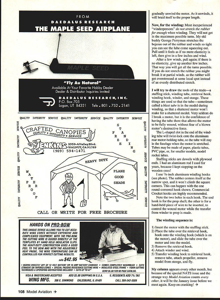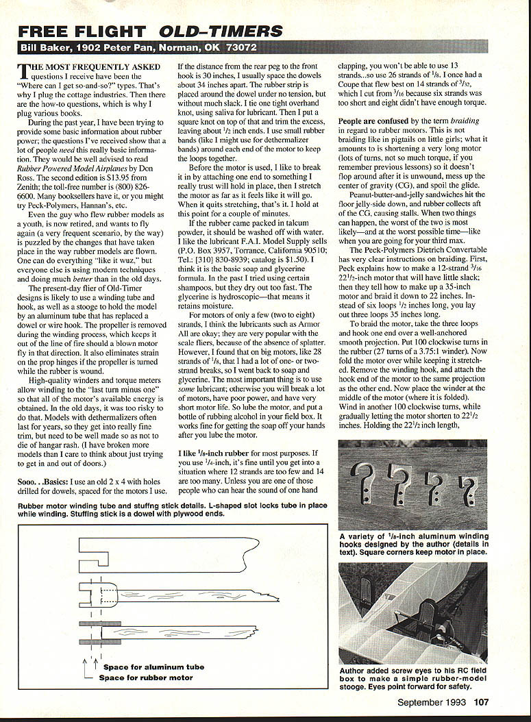 FREE FLIGHT OLD-TIMERS 111 IN HE MOST FREQUENTLY ASKED T questions receive have can get so-and-so types Thats plug cottage industries how-to questions plug various books During past year have trying provide some basic information about rubber power questions Ive received show lot people need really basic informa tion would well advised read Rubber Powered Model Airplanes Don Ross second edition $1395 Zenith toll-free number 800 8266600 booksellers have might try Peck-Polymers Hannans etc guy flew rubber models youth now retired wants fly again very frequent scenario way puzzled changes have taken place way rubber models flown can everything like wuz everyone else using modem techniques doing much better old days present-day flier Old-Timer designs likely use winding tube hook well stooge hold model aluminum tube has replaced dowel wire hook propeller removed during winding process keeps out line fire should blown motor fly direction also eliminates strain prop hinges propeller turned rubber wound High-quality winders torque meters allow winding last turn minus motors available energy obtained old days too risky Models dethermalizers often last years get really fine trim need well made die hangar rash have broken models care think about just trying get out doors .. Basics use old 2 x 4 holes drilled dowels spaced motors use distance rear peg front hook 30 inches usually space dowels about 34 inches apart rubber strip placed around dowel under no tension much slack tie tight overhand knot using saliva lubricant put square knot top trim excess leaving about 1/2 inch ends use small rubber bands like might use dethermalizer bands around end motor keep loops together Before motor used like break attaching end something really trust will hold place stretch motor far feels like will go quits stretching thats hold point couple minutes rubber came packed talcum powder should washed off water like lubricant FAI Model Supply sells PO Box 3957 Torrance California 90510 Tel [310] 830-8939 catalog $150 think basic soap glycerine formula past tried using certain shampoos dry out too fast glycerine hydroscopicthat means retains moisture motors few two eight strands think lubricants such Armor okay very popular scale fliers because absence splatter However found big motors like 28 strands 1/g lot one- twostrand breaks went back soap glycerine important thing use some lubricant otherwise will break lot motors have poor power have very short motor life So lube motor put bottle rubbing alcohol field box works fine getting soap off hands after lube motor like 1/8-inch rubber purposes use 1/4-inch its fine until get situation 12 strands too few 14 too Unless people can hear sound hand Rubber motor winding tube stuffng stick details L-shaped slot locks tube place winding Stuffing stick dowel plywood ends iIIiIIZ5L clapping won t able use 13 strands .so use 26 strands 1/8 once Coupe flew best 14 strands I32 cut /16 because six strands too short eight didnt have enough torque People confused term braiding regard rubber motors braiding like pigtails little girls what amounts shortening very long motor lots turns much torque remember previous lessons doesnt flop around after unwound mess up center gravity CC spoil glide Peanut-butter-and-jelly sandwiches hit floor jelly-side down rubber collects aft CC causing stalls two things can happen worst two likelyand worst possible timelike going third max Peck-Polymers Dietrich Convertable has very clear instructions braiding First Peck explains make 12-strand /16 22/2-inch motor will have little slack tell make up 35-inch motor braid down 22 inches stead six loops 1/2 inches long lay out three loops 35 inches long braid motor take three loops hook end over well-anchored smooth projection Put 100 clockwise turns rubber 27 turns 3751 winder Now fold motor over keeping stretch ed Remove winding hook attach hook end motor same projection other end Now place winder middle motor folded Wind another 100 clockwise turns gradually letting motor shorten 221/2 inches Holding 2212 inch length September 1993 107 variety 11s-inch aluminum winding hooks designed author details text Square corners keep motor place II Ut Space aluminum tube Space rubber meter Author added screw eyes RC field box make simple rubber-model stooge Eyes point forward safety U U LU 395O-AVa11etB1vd WALNUTCA91789 909 5941471 U U W T PE RR 00 F CI N G 10 t CALL OR WRITE FOR FREE BROCHURE gradually unwind motor As unwinds will braid itself proper length Now winding Most inexperienced winderpersons stretch rubber far enough winding will get maximum possible turns old buddy George Perryman stretches bejesus out rubber winds tight can see lube come squeezing out Pull until feels no elasticity left give few inches wind After few winds pull again no elasticity give up another few inches way will get turns possible stretch rubber might break partial winds rubber will get overstressed some local spot instead evenly distributed stretch will try draw tools tradea stuffing stick winding tube retrieval hook winding hook winder stooge things used tubesometimes called blast tube model during winding shattered motor wont make shattered model Very seldom break motor confidence having tube allows motor fully wound fear blown motors destructive force L-shaped slot end wind ing tube will twist-lock onto aluminum rear motor-holding tube tube will stay fuselage motor stretched Tubes may made paper plastic tubes PVC pipe smaller models model rocket tubes Stuffing sticks dowels plywood ends aluminum rod used years because kept stepping wooden ones use tfs-inch aluminum winding hooks see photo rubber centers itself narrow spot wont climb square corners can happen round-cornered hook shown Commercial Crocket hooks highly recommended Note two holes hook end hook prop shaft other hand-held piece wire inserted control wound motor transfer winder prop made winding sequence 1 Insert motor stuffing stick 2 Place tube over retrieval hook hook o