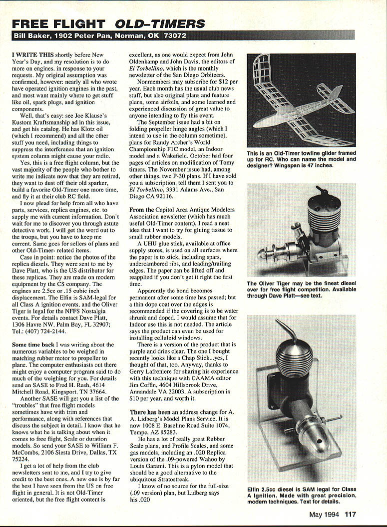 FREE FLIGHT OLD-TIMERS UflIE WRITE THIS shortly before New Years Day resolution engines response requests original assumption confirmed however nearly wrote have operated ignition engines past want mainly get stuff like oil spark plugs ignition components Well thats easy see Joe Klauses Kustom Kraftsmanship ad issue get catalog has Klotz oil recommend other stuff need including things suppress interference ignition system column might cause radio Yes free flight column vast majority people bother write indicate now retired want dust off old sparker build favorite Old-Timer time fly club RC field now plead help have parts services replica engines etc supply current information Dont wait discover through astute detective work will get word out troops have keep current Same goes sellers plans other Old-Timer- related items Case point notice photos replica diesels sent Dave Platt US distributor replicas made modern equipment CS company engines 25cc 15 cubic inch displacement Elfin SAM-legal Class ignition events Oliver Tiger legal NFFS Nostalgia events details contact Dave Platt 1306 Havre NW Palm Bay FL 32907 Tel 407 724-2144 Some time back writing about numerous variables weighed matching rubber motor propeller plane computer enthusiasts out might enjoy computer program said much weighing details send SASE Fred H Rash 4614 Mitchell Road Kingsport TN 37664 Another SASE will get list troubles free flight models sometimes have trim performance along references discuss subject detail know knows what talking about comes free flight Scale duration models So send SASE William F McCombs 2106 Siesta Drive Dallas TX 75224 get lot help club newsletters sent try give credit best ones new far best have seen US free flight general Old-Timer oriented free flight content excellent would expect John Oldenkamp John Davis editors El Torbellino monthly newsletter San Diego Orbiteers Nonmembers may subscribe $12 per year month has usual club news stuff also original plans feature plans some airfoils some learned experienced discussion great value anyone intending fly event September issue bit folding propeller hinge angles intend use column sometime plans Randy Archers World Championship FiC model Indoor model Wakefield October four pages articles modification Tomy timers November issue among other things two P-30 plans have sold subscription tell sent El Torbellino 3331 Adams Ave San Diego CA 92116 Capitol Area Antique Modelers Association newsletter has much useful Old-Timer content read neat idea want try gluing tissue small rubber models UHU glue stick available office supply stores used surfaces paper stick including spars undercambered ribs leading/trailing edges paper can lifted off reapplied dont get right first time Apparently bond becomes permanent after some time has passed thin dope coat over edges recommended covering water shrunk doped would assume Indoor use needed article says product can used installing celluloid windows version product purple dries clear bought recently looks like Chap Stick.yes thought too Anyway thanks Gerry Lafreniere sharing experience technique CAAMA editor Jim Coffin 4604 Hillsbrook Drive Annandale VA 22003 subscription $10 per year worth has address change A Lidbergs Model Plans Service now 1008 E Baseline Road Suite 1074 Tempe AZ 85283 has lot really great Rubber Scale plans Profile Scales some gas models including 020 Replica version 09-powered Wahoo Louis Garami pylon model should good alternative ubiquitous Stratostreak know no source full-size 09 version plan Lidberg says 020 May1994 117 Old-Timer towline glider framed up RC can name model designer Wingspan 47 inches Oliver Tiger may finest diesel ever free flight competition Available through Dave Plattsee text Elfin 25cc diesel SAM legal Class Ignition Made great precision modern techniques Text details