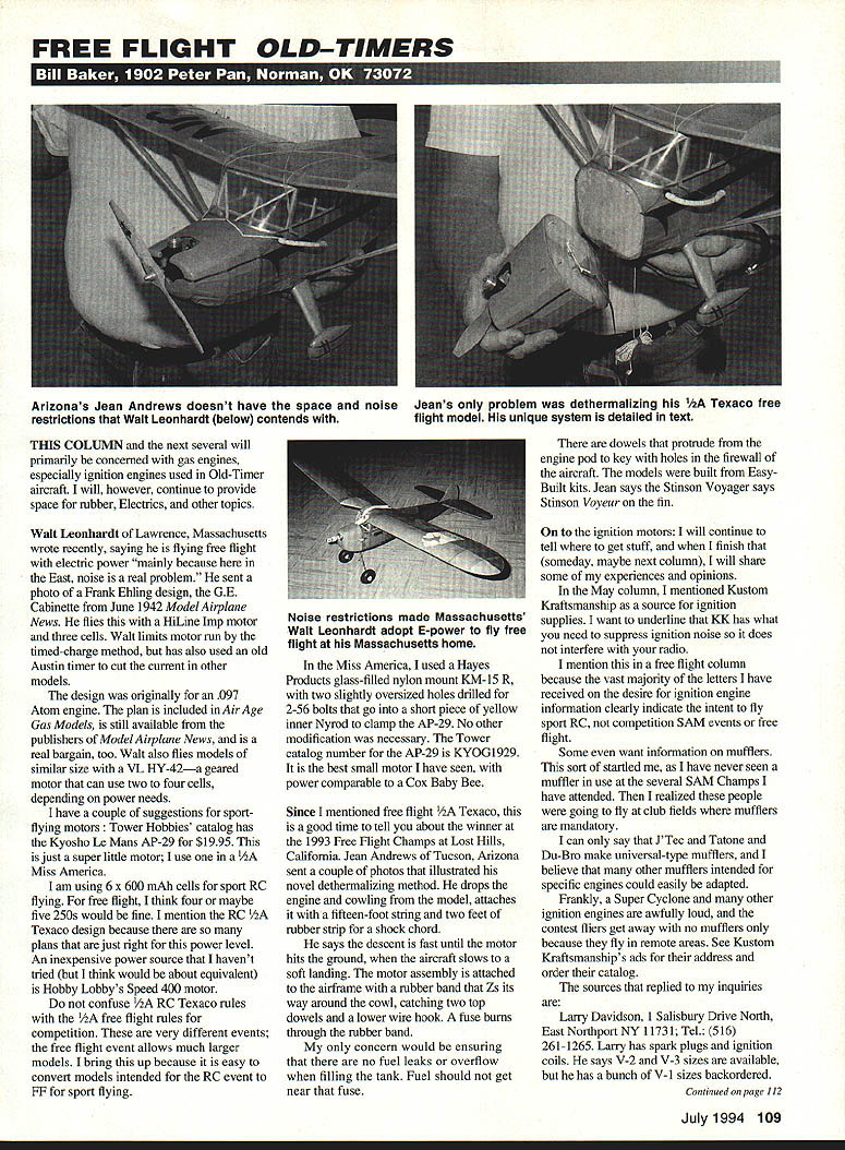 FREE FLIGHT OLD-TIMERS U 41. THIS COLUMN next several will primarily concerned gas engines especially ignition engines used Old-Timer aircraft will however continue provide space rubber Electrics other topics Walt Leonhardt Lawrence Massachusetts wrote recently saying flying free flight electric power mainly because East noise real problem sent photo Frank Ehling design GE Cabinette June 1942 Model Airplane News flies HiLine Imp motor three cells Walt limits motor run timed-charge method has also used old Austin timer cut current other models design originally 097 Atom engine plan included Air Age Gas Models still available publishers Model Airplane News real bargain too Walt also flies models similar size VL HY-42a geared motor can use two four cells depending power needs have couple suggestions sportflying motors Tower Hobbies catalog has Kyosho Le Mans AP-29 $1995 just super little motor use Miss Amenca am using 6 x 600 mAh cells sport RC flying free flight think four maybe five 250s would fine mention RC 1/2A Texaco design because plans just right power level An inexpensive power source havent tried think would about equivalent Hobby Lobbys Speed 400 motor confuse /2A RC Texaco rules 1/2A free flight rules competition very different events free flight event allows much larger models bring up because easy convert models intended RC event FF sport flying Miss America used Hayes Products glass-filled nylon mount KM-15 R two slightly oversized holes drilled 2-56 bolts go short piece yellow inner Nyrod clamp AP-29 No other modification necessary Tower catalog number AP-29 KYOG 1929 best small motor have seen power comparable Cox Baby Bee Since mentioned free flight Texaco good time tell about winner 1993 Free Flight Champs Lost Hills California Jean Andrews Tucson Arizona sent couple photos illustrated novel dethermalizing method drops engine cowling model attaches fifteen-foot string two feet rubber strip shock chord says descent fast until motor hits ground aircraft slows soft landing motor assembly attached airframe rubber band Zs its way around cowl catching two top dowels lower wire hook fuse burns through rubber band concern would ensuring no fuel leaks overflow filling tank Fuel should get near fuse dowels protrude engine pod key holes firewall aircraft models built EasyBuilt kits Jean says Stinson Voyager says Stinson Voyeur fin ignition motors will continue tell get stuff finish someday maybe next column will share some experiences opinions May column mentioned Kustom Kraftsmanship source ignition supplies want underline KK has what need suppress ignition noise does interfere radio mention free flight column because vast majority letters have received desire ignition engine information clearly indicate intent fly sport RC competition SAM events free flight Some want information mufflers sort startled have never seen muffler use several SAM Champs have attended realized people going fly club fields mufflers mandatory can say JTec Tatone Du-Bro make universal-type mufflers believe other mufflers intended specific engines could easily adapted Frankly Super Cyclone other ignition engines awfully loud contest fliers get away no mufflers because fly remote areas See Kustom Kraftsmanship s ads address order catalog sources replied inquiries Larry Davidson 1 Salisbury Drive North East Northport NY 11731 Tel 516 261-1265 Larry has spark plugs ignition coils says V-2 V-3 sizes available has bunch V-i sizes backordered Continued page 112 July1994 109 Arizonas Jean Andrews doesnt have space noise Jeans problem dethermalizing 1/2A Texaco free restrictions Walt Leonhardt below contends flight model unique system detailed text Noise restrictions made Massachusetts Walt Leonhardt adopt E-power fly free flight Massachusetts home PRODUCTS FOR ThE DISCERNING MODELER Complete Line Exhaust Systems * Tuned Pipes led Tuned Pipes Headers uri Mufflers Expansion Mufflers Helicopter Ball Mufflers ialized Exhaust Systems Iinsurpass4 W,L.,.A, ance Pita single w planes body widths up 51/4andwingwdt uptorandall landing gear congnntions Ao available bi-wing st4e body widths up S 1J4 Single Wing51995Add 5500 BiWing52495shipping handling SED NECK OR MONEY ORDER AND SHIIPENO INFORMATION TO Mes CADDYS PO DOX 185 RAEPORD NC 25376 RC Flight Training Beginner advanced tailored individuai long-time modeler full size airplane flight insfruc tor will make progress fun easy during week stay beautiful far western North Carolina Write call information RC flight Training mE 704 3894968 P-30 CLASS FREE FLIGHT MODEL KIT $ 3395 POSTPAID Sparrow Hawk P 30 BY JOHN ODWYER WINNING SINCE 1982 REDI-CUT RIBS PREFORMED TUBE MFG BY MODEL AIRCRAFT LABS 108 S LEE STREET IRVING TEXAS 75060 FF Old-TimerslBaker Continued page 109 V-2 V-3 Sizes $10 minimum order three plugs Iwo plugs coila Modelectric 37 gram coilat $15 Postage handling orders $3 Champion plugs V-2 size long reach V-3 short reach Floyd Carter Aero Ply Research Co 2029 Crist Dr Los Altos CA 94024 Tel 415 968-4246 has extensive line ignition components will convert glow ignition will happily answer ignition questions problems Lets hear Yeaa Floyd Some systems however may legal SAM free flight competition using system does have points gather dont care lam impressed literature sent believe really knows what doing highly recommend send him large SASE data know two engine rebuilding repair sources will tackle ignition engine problems Aldrich Models 12822 Tarrytown San Antonio TX 78233 Blackburn Aero Engineering PO Box 15143 Amarillo TX 79105 Send SASE services price listings recommend because friends pleased services Tom Morrison manufactures Super Cyclone Engines price list send SASE PO Box 1809 Show Low AZ 85901 says parts will fit original engines believe using original dies tools etc RJL Industries PO Box5 Sierra Madre CA 91025 makes Forster 29 35 ignition engines front-rotor versions think introduced late 1940s bull believe SAM legal Although several modelers have told perform