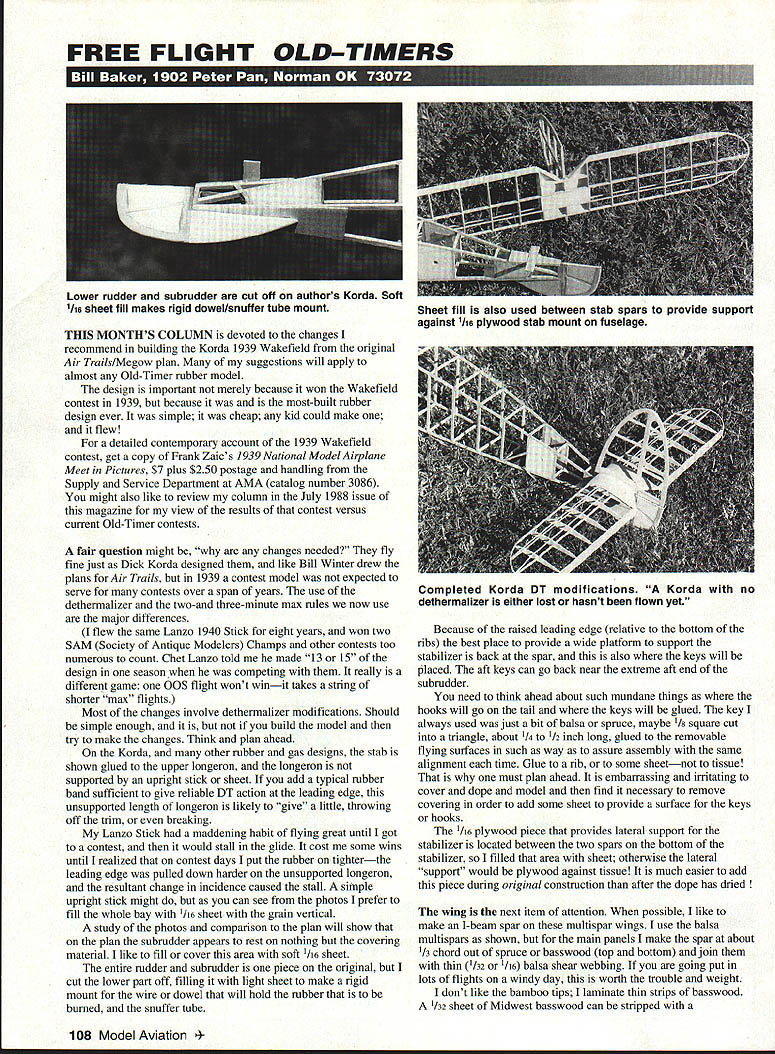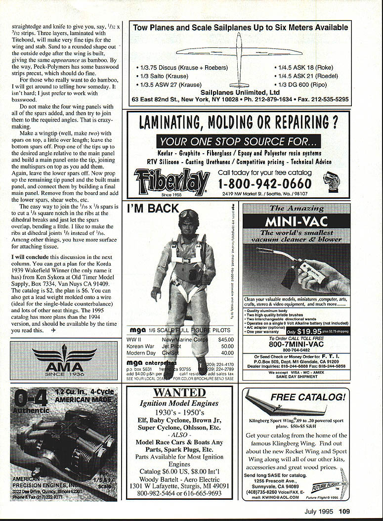 FREE FLIGHT OLD-TIMERS EI1IE THIS MONTHS COLUMN devoted changes recommend building Korda 1939 Wakefield original Air Trails/Me gow plan suggestions will apply almost Old-Timer rubber model design important merely because won Wakefield contest 1939 because most-built rubber design ever simple cheap kid could make flew detailed contemporary account 1939 Wakefield contest get copy Frank Zaics 1939 National Model Airplane Meet Pictures $7 plus $250 postage handling Supply Service Department AMA catalog number 3086 might also like review column July 1988 issue magazine view results contest versus current Old-Timer contests fair question might changes needed fly fine just Dick Korda designed like Bill Winter drew plans Air Trails 1939 contest model expected serve contests over span years use dethermalizer two-and three-minute max rules now use major differences flew same Lanzo 1940 Stick eight years won two SAM Society Antique Modelers Champs other contests too numerous count Chet Lanzo told made 13 15 design season competing really different game OOS flight wont winit takes string shorter max flights Most changes involve dethermalizer modifications Should simple enough build model try make changes Think plan ahead Korda other rubber gas designs stab shown glued upper longeron longeron supported upright stick sheet add typical rubber band sufficient give reliable DT action leading edge unsupported length longeron likely give little throwing off trim breaking Lanzo Stick maddening habit flying great until got contest would stall glide cost some wins until realized contest days put rubber tighterthe leading edge pulled down harder unsupported longeron resultant change incidence caused stall simple upright stick might can see photos prefer fill whole bay /16 sheet grain vertical study photos comparison plan will show plan subrudder appears rest nothing covering material like fill cover area soft 1/16 sheet entire rudder subrudder piece original cut lower part off filling light sheet make rigid mount wire dowel will hold rubber burned snuffer tube Because raised leading edge relative bottom ribs best place provide wide platform support stabilizer back spar also keys will placed aft keys can go back near extreme aft end subrudder need think ahead about such mundane things hooks will go tail keys will glued key always used just bit balsa spruce maybe 1/ square cut triangle about 1/4 1/2 inch long glued removable flying surfaces such way assure assembly same alignment time Glue rib some sheetnot tissue must plan ahead embarrassing irritating cover dope model find necessary remove covering order add some sheet provide surface keys hooks I16 plywood piece provides lateral support stabilizer located between two spars bottom stabilizer filled area sheet otherwise lateral support would plywood against tissue much easier add piece during original construction after dope has dried wing next item attention possible like make I-beam spar multispar wings use balsa multispars shown main panels make spar about 1/3 chord out spruce basswood top bottom join thin /32 /16 balsa shear webbing going put lots flights windy day worth trouble weight dont like bamboo tips laminate thin strips basswood 1/32 sheet Midwest basswood can stripped 108 Model Aviation r rudder subrudder cut off authors Korda Soft 1/16 sheet fill makes rigid dowel/snuffer tube mount Sheet fill also used between stab spars provide support against 1116 plywood stab mount fuselage Completed Korda DT modifications Korda no dethermalizer either lost hasnt flown yet straightedge knife give say /32 x I32 strips Three layers laminated Titebond will make very fine tips wing stab Sand rounded shape out outside edge after wing built giving same appearance bamboo way Peck-Polymers has some basswood strips precut should fine really want bamboo will get around telling someday isnt hard just prefer work basswood make four wing panels spars added try join required angles crazymaking Make wingtip well make two spars top little over length leave bottom spars off Prop tips up desired angle relative main panel build main panel onto tip joining multispars top add Again leave lower spars off Now prop up remaining tip panel built main panel connect building final main panel Remove board add lower spars shear webs etc easy way join /16 x /s spars FiI cut 1/ square notch ribs edral breaks just let spars overlap bending little like make ribs dihedral joints /s instead i/ta Among other things have surface attaching tissue will conclude discussion next column can get plan Korda 1939 Wakefield Winner name has Ken Sykora Old Timer Model Supply Box 7334 Van Nuys CA 91409 catalog $2 plan $6 can also get lead weight molded onto wire ideal single-blade counterbalance lots other neat things 1995 catalog has plans 1994 version should available time read Planes Scale Sailplanes Up Six Meters Available 1/375 Discus Krause ers 1/3 Salto Krause 1/35 ASW 27 Krause Sailpianes Unlimited Ltd 63 East 82nd St New York NY 10028 12-879-1634 212-535-5295 1/45 ASK 18 Rake 1/45 ASK 21 Roedel 1/3 DG 600 Ripo LAMINATING MOLDING OR REPAIRING reviar urapnite rinergiass i EOX ann roiyester resin systems RTV Silicone Casting Urethanes / Competitive pricing Technical Advice free catalog 2419 NW MarketSt /Seallle Wa /98107 mga 1/6 SC wwii Korean War Modern Day mga enteri pobox 5631fr add $400 p&h pel SEE YOUR LOCAL DE PILOTS $4500 5000 4000 2244170 224-2789 dd sales tax 0R BROCHURE SEND SASE We accept VISA MC AMEX SAME DAY SHIPMENT WANTED Ignition Model Engines 1930s 1950s Elf Baby Cyclone Brown Jr Super Cyclone Ohlsson Etc ALSO Model Race Cars & Boats Any Parts Spark Plugs Etc Parts Available Most Ignition Engines Catalog $600 US $800 Intl Woody Bartelt Aero Electric 1301 W Lafayette Sturgis MI 49091 800-982-5464 616-665-9693 July 1995 109 Clean valuable models miniatures computer arts crafts stereo & video equipment much Quality aluminum body Two high Quality bristle brushes Two interchangeable directio