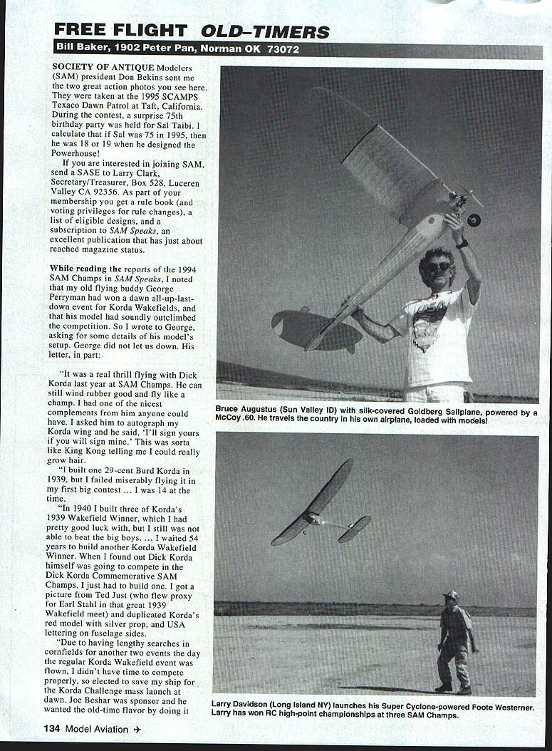 FREE FLIGHT OLD-TIMERS 11111 SOCIETY OF ANTIQUE Modelers SAM president Don Bekins sent two great action photos see taken 1995 SCAMPS Texaco Dawn Patrol Taft California During contest surprise 75th birthday party held Sal Taibi calculate Sal 75 1995 18 19 designed Powerhouse interested joining SAM send SASE Larry Clark Secretary/Treasurer Box 528 Luceren Valley CA 92356 As part membership get rule book voting privileges rule changes list eligible designs subscription SAM Speaks excellent publication has just about reached magazine status reading reports 1994 SAM Champs SAM Speaks noted old flying buddy George Perryman won dawn all-up-lastdown event Korda Wakefields model soundly outclimbed competition So wrote George asking some details models setup George did let us down letter part real thrill flying Dick Korda last year SAM Champs can still wind rubber good fly like champ nicest complements him anyone could have asked him autograph Korda wing said Ill sign yours will sign sorta like King Kong telling could really grow hair built 29-cent Burd Korda 1939 failed miserably flying first big contest . 14 time 1940 built three Kordas 1939 Wakefield Winner pretty good luck still able beat big boys . waited 54 years build another Korda Wakefield Winner found out Dick Korda himself going compete Dick Korda Commemorative SAM Champs just build got picture Ted Just flew proxy Earl Stahl great 1939 Wakefield meet duplicated Kordas red model silver prop USA lettering fuselage sides Due having lengthy searches cornfields another two events day regular Korda Wakefield event flown didnt have time compete properly elected save ship Korda Challenge mass launch dawn Joe Beshar sponsor wanted old-time flavor doing 134 Model Aviation 4Bruce Augustus Sun Valley ID silk-covered Goldberg Sailplane powered Mccoy 60 travels country own airplane loaded models Larry Davidson Long Island NY launches Super Cyclone-powered Foote Westerner Larry has won RC high-point championships three SAM Champs like used no torque meters no winding tubes flight before thermals came out managed squeak out win 303 since Korda outclimbed other 20 . cant imagine thrilling get Korda fly good after 54 years Now scientifical questions balance Korda 55% wing chord 330 inches behind wind leading edge smallish horizontal stab flies smooth since vertical stab isnt overly generous keep wing forward LE right windshield gives longest tail length possible add lead nose block balance . use 28 strands 35 inches long /8 FAI Tan II rubber wining flight wound 850 turns near max fly Korda right-right guess fliers divided R-R R-L Ive flown rubber ships both ways cant tell much difference dont add shim under wing leading edge instead jack up stab trailing edge get incidence right Its taste have model glide nose down marginal wing positive incidence stab trailing edge up will give flatappearing glide. Bill sure miss contest circuit heaps fun particularly flying Mulvihill team together winning 1980 1982 miss too George others used see SAM Champs AMA Nationals just dont like travel anymore lost interest competition 01 George likes play clown bit best ever rubber events true some rubber models fly right-right safely theory matter CG location conservative somewhat forward CU like Georges Korda Conscientious Objector Mulvihill R-R seems OK CU pushed back ultimate dead-air glide R-R dangerous Better go R-L dont want use autostab just matter opinion am going take up space telling about recent SAM rule changes interested will read SAM Speaks want announce new official RC Assist event Nostalgia-era FF designs rules roughly follow NFFS free flight Nostalgia events Although still have no interest competition will make Lucky Lindy Zeek own thermaling pleasure An unofficial SAM Electric event rubber designs being promoted Tileston 1800 Carmelo Dr Car michael CA 95608 SASE should get details UCTS Complete Line Exhaust Systems * Tuned Pipes led Tuned Pipes Headers uri Mufflers Expansion Mufflers Helicopter Ball Mufflers ialized Exhaust Systems UiSIffpd Easy use Save Money oSave Time sAs low $895 FREE Catalog Lall J Smithy 1-800-345-6342 SIGIhyDtMA P0 Box 1517 Ask operator MAn hor Ml 48106 1517 & MODEL BUILDING 7ERVICE RADf 0 CONiTiOL PPODUCTS We carry full line Byron Originals Bob Parkerson Tom Cook Bob Violet products COD Orders Accepted 718 983-9735 128 WATCHOGUE I0AD * STATEN AM 4 NY 10314 4-40x1/2 socket caps sell $43511 00 alloy steel $665/i 00 stainless $7 50150 aluminum Fcirpnceson sisiblequanli1ies tt ynxxfr1h call O FASTENERS 110 Hillcrest Road Remington NJ 08822 800-892-6917 908-8064050 fax 908-788-2607 ULTIMATESPORT RC 255 East Ashland/PO BaA 727/Soda Sprirgs Idaho 83276 ULII556TE 0-300 PIPE12065473742FAT G,Ih VIA SEIld SASE January1996 135 PRICES EFFECTIVE NOV 1095 WINTERHAWK II COUPE WON AT 94 NATE UPDATED FiG VERSION FORMED BODY TUBE MONTREAL TYPE HUB REDI CUT RIBS TOP GRADE BALSA ALL HARDWARE$ 5500 TVAT ICC 43 INCH WINGSPAN SPARROWHAWKP30 WON 87 93 AND SN NATS PORMED BODY TUBE REDI CUT RIBS YELLOW CZECH PROP ALL HARDWARE DESIGNS BY JOHN OOWYER FV,rCVAVV TSVAVAIVAIAV TEXANS ASS DOVER 0179 FROM MODEL AIRCRAFT LARS S LEE ST 214-4389233 IRVING TEXAN VOVOB I-none IVAhE I4lBIbFIpAaWeahIGIIaoFVsRCAIAI FIpITgVAIVAT5AIAIVLATAIVgDAl CIEOTCATAPPAVAiIANIE 5511415101 8255Sh,Ied Nil $365DElTA VIloelod Oil $495