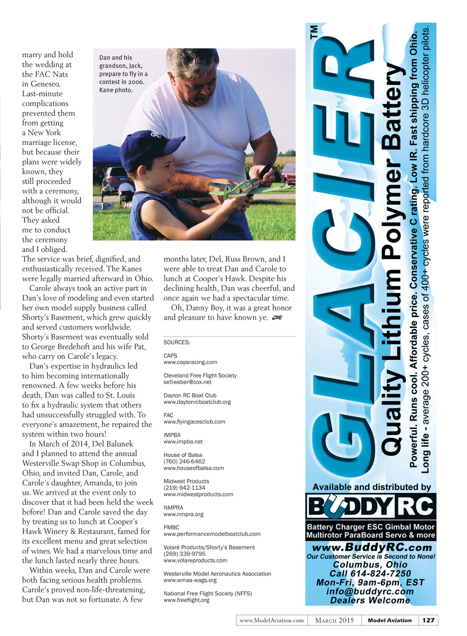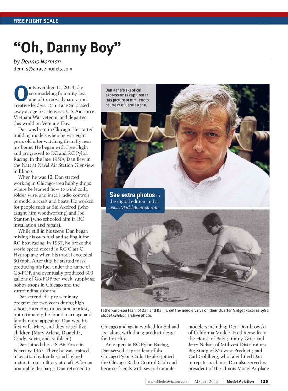 On November 11, 2014, the aeromodeling fraternity lost one of its most dynamic and creative leaders. Dan Kane passed away at age 67. He was a U.S. Air Force Vietnam War veteran, and departed this world on Veterans Day.