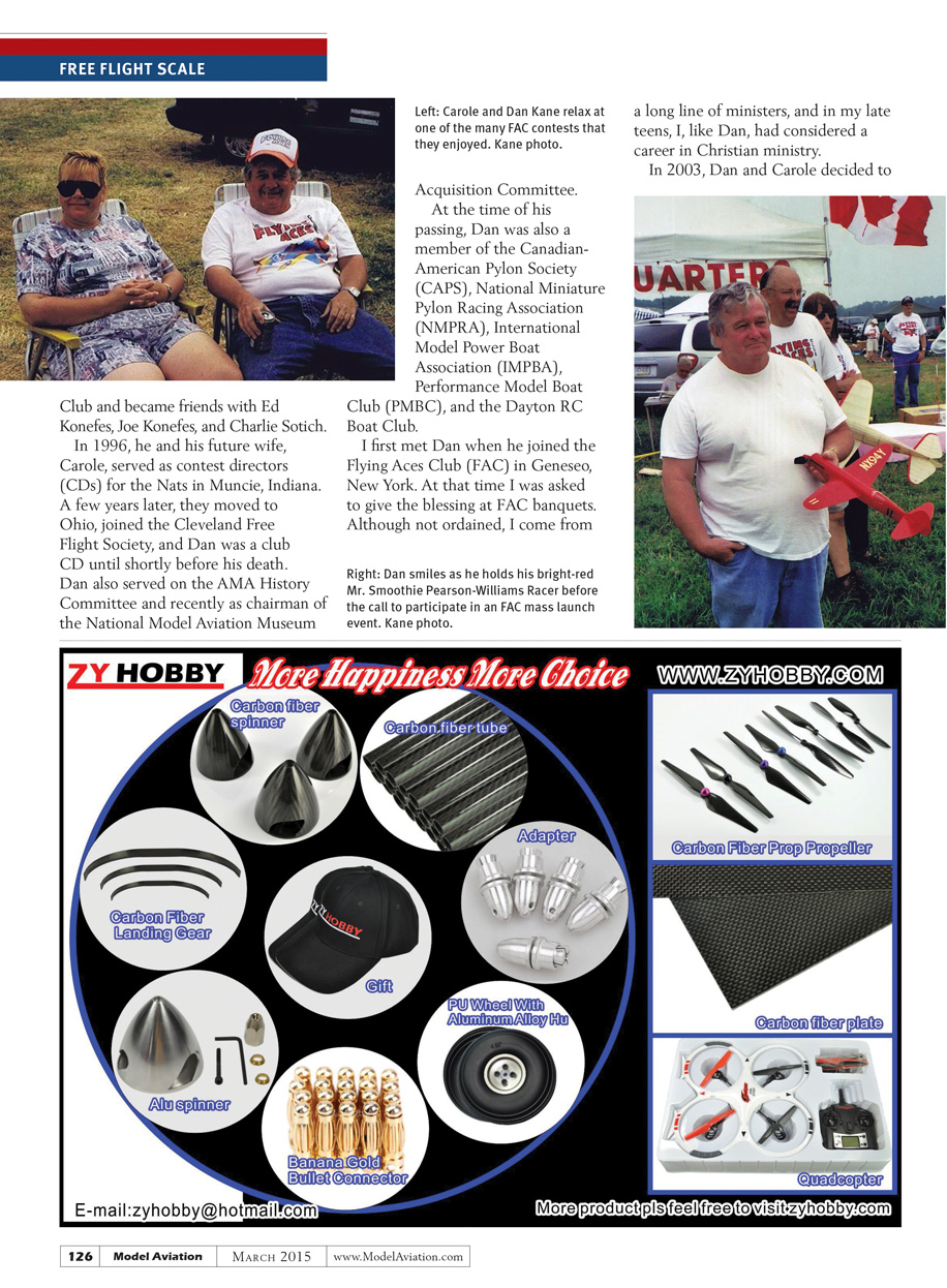 In 1996, he and his future wife, Carole, served as CDs for the Nats in Muncie, Indiana. A few years later, they moved to Ohio, joined the Cleveland Free Flight Society, and Dan was a club CD until shortly before his death. Dan also served on the AMA History Committee and recently as chairman of the National Model Aviation Museum Acquisition Committee.