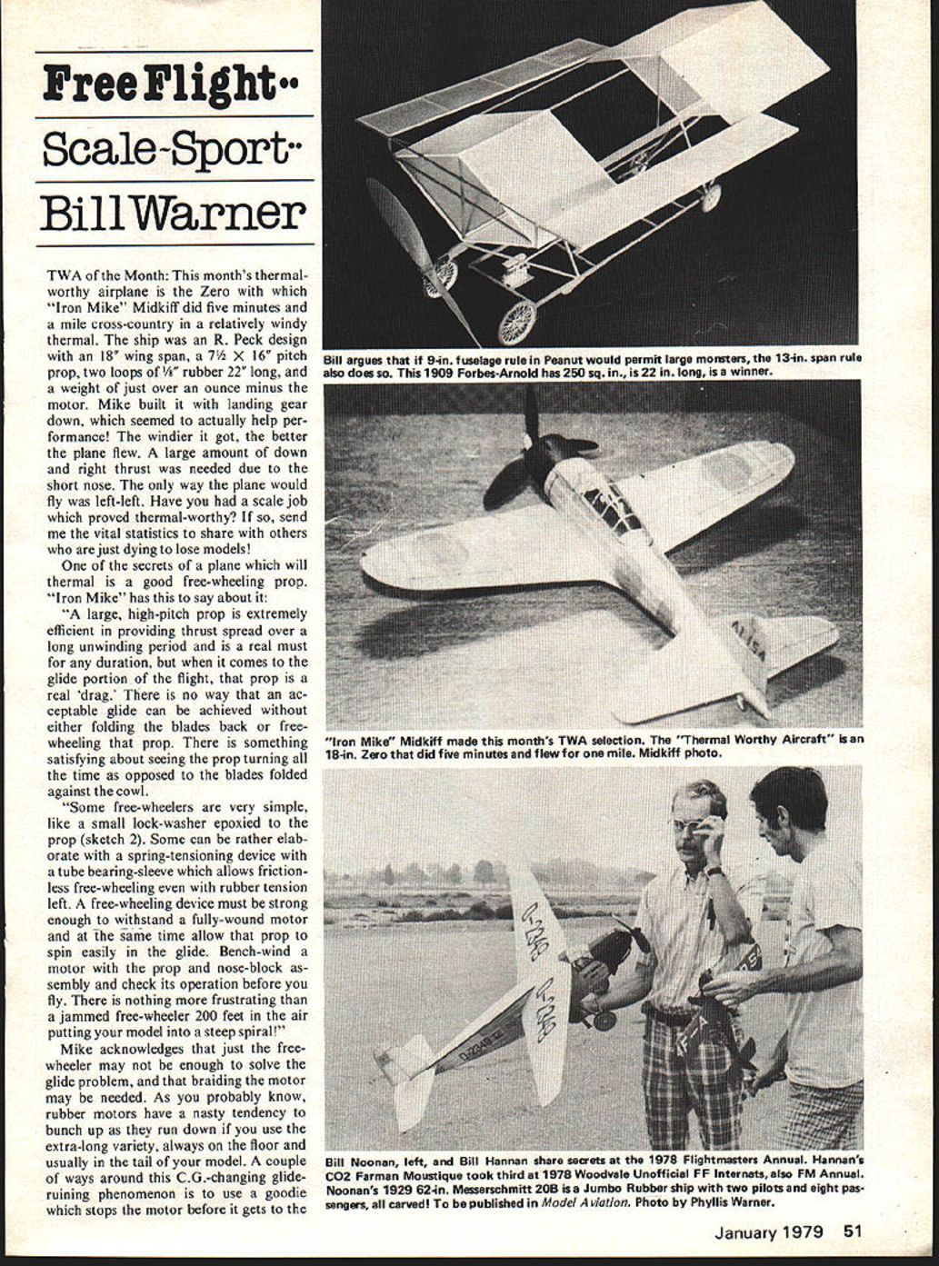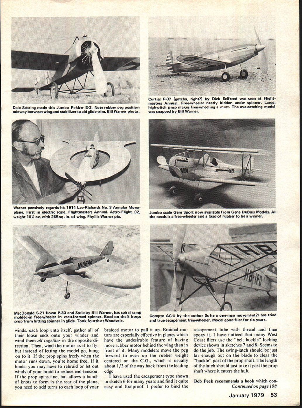 Free Flight Scale -Sport Bill Warner TWA Month months thermal worthy airplane Zero Iron Mike Midkiff did five minutes mile cross-country relatively windy thermal ship R Peck design 18 wing span 7 X 16 pitch prop two ioops /8 rubber 22 long weight just over ounce minus motor Mike built landing gear down seemed actually help per formance windier got better plane flew large amount down right thrust needed due short nose way plane would fly left-left Have scale job proved thermal-worthy send vital statistics share others just dying lose models secrets plane will thermal good free-wheeling prop Iron Mike has say about large high-pitch prop extremely efficient providing thrust spread over long unwinding period real must duration comes glide portion flight prop real drag no way ac ceptable glide can achieved either folding blades back free wheeling prop something satisfying about seeing prop turning time opposed blades folded against cowl Some free-wheelers very simple like small lock-washer epoxied prop sketch 2 Some can rather elab orate spring-tensioning device tube bearing-sleeve allows frictionless free-wheeling rubber tension left free-wheeling device must strong enough withstand fully-wound motor arne time allow prop spin easily glide Bench-wind motor prop nose-block sembly check its operation before fly nothing frustrating jammed free-wheeler 200 feet air putting model steep spiral Mike acknowledges just freewheeler may enough solve glide problem braiding motor may needed As probably know rubber motors have nasty tendency bunch up run down use extra-long variety always floor usually tail model couple ways around CG-changing glideruining phenomenon use goodie stops motor before gets January 1979 51 argues 9-in fuselage rule Peanut w - large m 13-in span rule eisa does 1909 Forbes-Arnold has 250 i g iron Mike Midkiff made months TWA selection Thermal Worthy Aircraft 18-in Zero did five minutes flew mile Midkiff photo Bill Noonan left Bill Hannan share secrets 1IJ i-iigntmasters Annual Hannah-s C02 Farman Moustique took third 1978 Woodvale Unofficial FF Internats also FM Annual Noonans 1929 62-in Messerschmitt 205 Jumbo Rubber ship two pilots eight pas sengers carved published Model viation Photo Phyllis Warner run-down state See sketch 4 ad justable screw stop back nose block provides positive lock small spring out ahead prop providing tension keep slightly-wound motor drooping doing mischief prop spins merrily away its own bear ings no binding whatever youre enough masochist build Contest Standard maybe braiding job rubber would First make up multiple-loop motor install help ever-present empty-handed spectator holds loops save winding put 100 turns Give strand friend wind another direc tion clockwise have THE SIMPL ES Ti FINE WIRE LATCH 72 -7 SCREEN DOOR HOOKS LIKE TUBING CD4MS CAN BE HOMEMADE PROM TUBING 9HEET METAL / OR EVEN SPLIT-LOCK WASHER HOOK THIS HOOK LOOKS NEATEST BUTTHIS KIND S/ER TO AND LOCK THE MOT II SWING-FREE GRAVITY- ESCAPEMENT ESEL F LOCKING SELF-LOCKING TYPES CAN BE USED / -I--- CLOSED IN SPINNER THE BELT 7-Ki -0 7LOCKED POSITION BUCKLE AND SWING LATCH FREE WHEEL 1/46 Sketches 1 6 drawn Paul Mclllrath nowdefunct Sig Aeromodeller magazine reprinted permission both Paul Glen Sigafoose Sketches 7 8 illustrate popular free-wheeler used West Coast fliers drawn author 52 Model Aviation PLASTICS USE TH/8 CAM 0 THE CONTEST S TANDARD DI USES SPRING TO EITHER 9 SPRING S WILL WORK winds ioop unto itself gather loose ends onto winder wind together opposite di rection wind motor fly instead letting model go hang prop spins freely motor runs down youre home free binds may have rebraid let out winds braid reduce end-tension prop spins fine allows bunch knots form rear plane need add turns loop braided motor pull up Braided mo tors especially effective planes have undesirable feature having rubber motor behind wing front modelers move peg forward up rubber weight centered CG usually about 1/3 way back leading escapement tube thread epoxy have noticed West Coast fliers use belt buckle locking device shown sketches 7 8 Seems job swing-latch should just far enough out blade clear buckle part prop shaft length latch should just take past prop shaft enters hub edge have used escapement type shown sketch 6 years find quite Bob Peck recommends book coneasy foolproof prefer bind Continued page 108 January1979 53 Dale Sebring made Jumbo Fokker E-3 Note rubber peg position midway between wing stabilizer aid glide trim Bill Warner photo Curtiss -right y Dick Seifreed seen Flightmasters Annud-wheeler neatly hidden under spinner Large high-pitch prop meKu free-wheeling must eye-catching model snapped Bill Warner Warner pensively regards 1914 Lee-Richards No3 Annular Mono plane First electric scale Flightmasters Annual Astro-Flight 02 weight 1O oz 265 sq wing Phyllis Warner pic Jumbo scale Gere Sport now available Gene DuBois Models needs free-wheeler load rubber winner MacDonald S-21 flown P-30 Scale Bill Warner has spiral ramp molded-4n free-wheeler vacu4ormed spinner Bead shaft keeps prop hitting spinner glide Took fourth Woodvale Compte AC-4 author one-man movement has tried true escapement free-wheeler Model good flier six years U R T S S V PLANS BY RALPH BECK NOW AVAILABLE FROM lloaoe ENT CORP P0 BOX 9641 SAN DIEGO CALIFORNIA 92109 SEND lX FOR COMPLETE CATALOG OF AIRCRAFT HARDWARE & ACCESSORIESPLUS DESCRIPTIVE jENNY BROCHURE 1931 Gee Bee Super Sportster 1SIe IGeneral Arrange ICatalog 25c w T By1 Imont Drawing Bill Given ERNISTIC MODELS PO BOX 6974 ALBUO NM 87197 placement rather firmly tixed wing sockets mounted motor stick angular difference cidence between wing horizontal stabilizer Most fliers move wing posts up down sockets set wing cidence works quite well However few disadvantages moving wing posts least being quandry set posts first test flight fliers have found models have much repeatable performance wing posts cut proper length bottom out bottom sockets work Note Fig bottom socket has