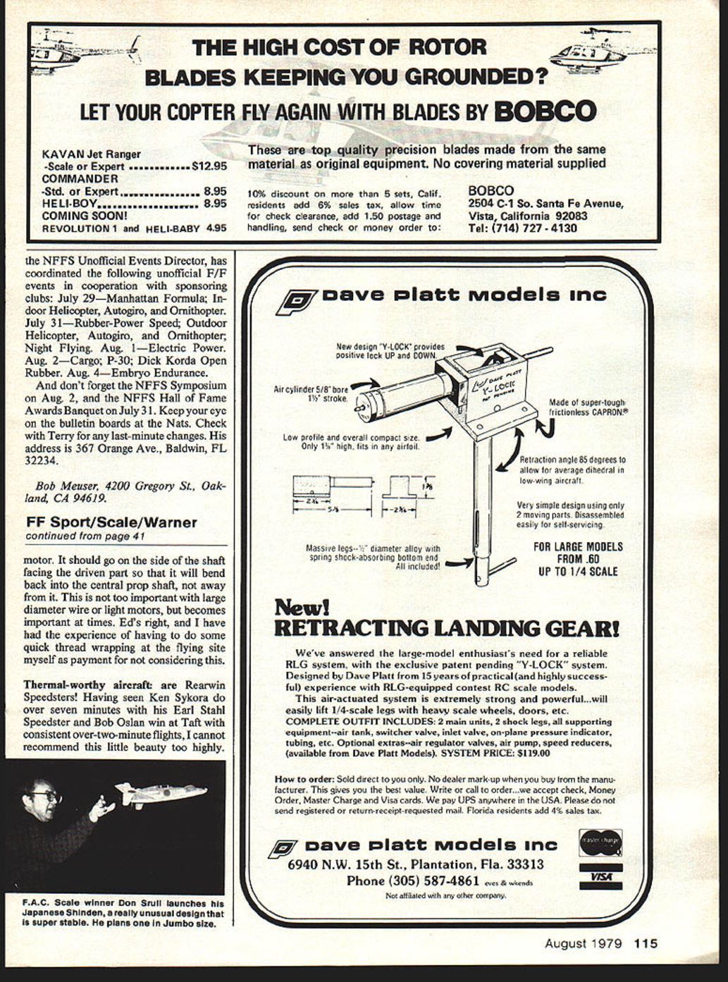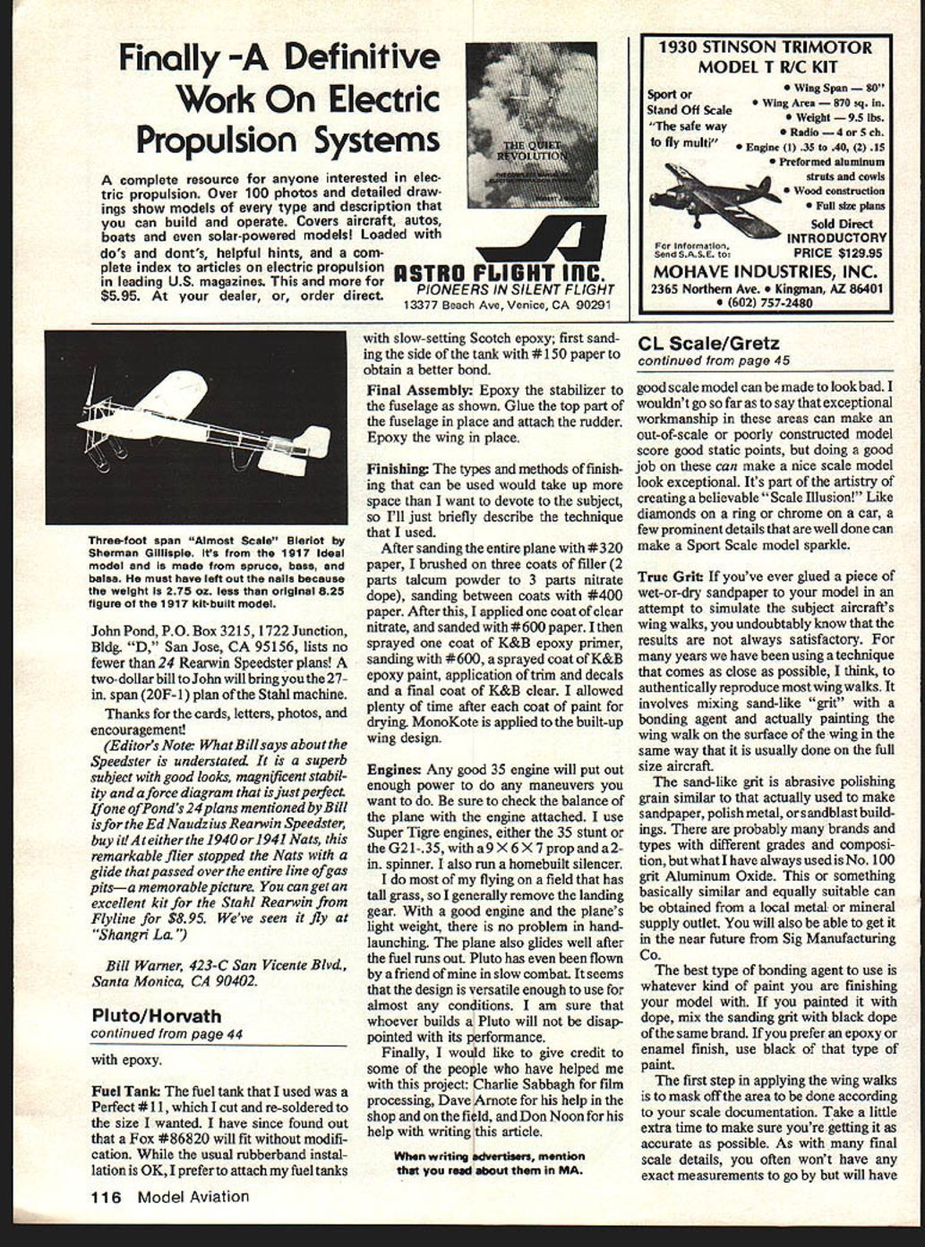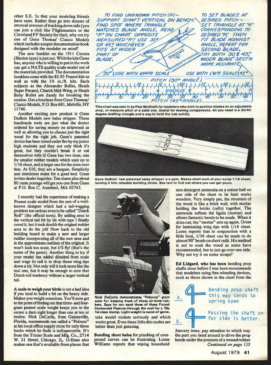 SUPERSCALE always draws crowd judging table flying ground Finely-done structure loads detail magnificent see modelers love models type joy seeing model air doing what originally designed well has outstanding artistic experiences good friend asked opinion enlarging stand-oft scale judging circle replied dont guys just build better models scale model will always matter personal taste reflects builders abilities mental image what plane should finished Someone like Bill Caldwell flying thou sands flights himself out middle Texas going make same model will someone wants glory being NATS trophy winner model will done lot differently As really no upper limit superscale ship could theory con structed aluminum have working instruments retracts etc real question facing scale builders non-scale shall go still out category Perhaps its order re-evaluate now whether important equal surpass last scale job time build new Some guys feel diminished make semi-scale plane after superscale trophy winner got compliments Thats shame cause work-to-fun ratio can very high simple ship make ships designed win contests impress people amount detail can hang may miss lot great time air can have creative burst leads find things good worth scale job its stretched ways Sherman Gillespies Ideal Bleriot what would call Easy Bee Perhaps should make something stretches lower limits great area called scale now just explore possibilities relax An Almost Scale job may choice Flightmasters Annual can have lot fun chasing through buttercups sunny Sunday morning modeler new serious scale finding adequate documentation can al ways pose problem Tons material exist Hawker Hurricanes P-5 Piper Cubs other done-to-death subjects wants keep building stuff else builds forever After builder SE 5 always runs risk having his/her model compared dozens Left Royall Moorethe geared GeeBee man rememberdid detract flight excitement rare Wright Flyer adding twin motor sticks suppose uses scale tower rail catapult Right Youd never notice flight theres free-floating rudder set up plastic sheet fill front side frames directional stability theres tiny bit dihedral Both photos Frank Morton 40 Model Aviation TWA month Bob Ohisons Ear Stahl Rearwin Speedster hISS consisientiy over two minutes Plane won 1971 rubber scale Taft FF Champs Plan source text Pic Bill Warner other SE 5s modeling friends have seen Rather go dozens unusual avenues tracking down info can join club like Flightmasters Cleveland FF Society try Gene Thomas Classic Models includes super documentation book designed modeler mind new booklet 1911 Cessna Bleriot-type just out kits Gene has anyone willing put work can get NATS quality scale model out materials provided documentation booklets come $595 Peanut kits well 1 i in/ft kits Such subjects Alexander Bullet Heath Super Parasol Church Mid-Wing Heath Baby Bullet dandy breaking routine Get brochure Gene Thomas Classic Models PO Box 681 Melville NY 11746 Another exciting new product Gene DuBois Models new balsa stripper handmade tools just what doctor ordered saving money stripwood well allowing choose just right wood right job Genes patented device has tested under fire junior high students think its great couldnt break cut themselves Gene has two sizes smaller rubber models uses up 1/16 sheet larger sizes over $10 bargain Simplicity sturdiness make good tool Gene invites dealer inquiries Ten clams plus about 80 cents postage will get Gene PO Box C Acushnet MA 02743 recently experience making Peanut scale model pen wellknown designer tail-wagging problem too serious called Dutch Roll official term adding area vertical tail bit bit tape finally cured ittookdouble original rudder area job Now back old building board make new larger rudder incorporating new area approximate outlines original wont look too scale itll flyi thats name game Another thing try model has added dihedral scale wags its tail toop wing tips down bit will look like real may enough cure Dutch roll tendency larger vertical tail scale weigh birds bad idea tend build bit heavy side Makes weight conscious Youll soon get tothe point finding out three- fourgram peanut scale weight keeps ozone darn sight longer ten twelve Nick DeCarlis Gainesville Florida recommends called Pelouze local office supply store three bucks finds indispensable Its Tinier Scale Mfg Co 2714 W 21 Street Chicago IL 0-Haus also makes thats available places TO F/AID UNKNOWN PITCH P -TO SET BLADES AT su~or SHAFT VERTICAL ON BENC/-I DES/RED P/TH - F/ND SPOT WHERE TR/A/VGL ESET TRIANGLE AT R MATCHES BLADE ANGLE READCORRESPONDING TO P ON Cl-/APT OPPOSITEDEIRED EN AIEA SLIRED R 300-FIT BLADE AGA/NST OR 450 WI-I/Cl-/EVER- -qNGLE REPEAT FOR FITS AT WIDER~ SECOND LADE PART OF Y BOTH 3O45f BLADEWIDER BLADE SECTN MORE ACCURATL / 300 USE WITH UPP9 SCALEUSE WIT/-I L W9 SCALE 4 I PITCH 300 AA/6L4f liii iiiIf ii i/5i i12f2 iihfiii riilljiilii 0/ ADIU56789IV IIIIIAI L AIII AIIIIII IIII 9 PITCH 4S0AMGLE chart sent Paul Mclllrath modelers wish position blades adjustable prop measure pitch solid Useful making comparisons need 30/45degree drafting triangle way hold hub solidly Nick DeCarlis demoutrates Pelouze gram scale keeping tfack air-time rob begs Says can send three Found Centennial Peanuts through mail 15c Istclass stamp Lightweight name game take model rockets seriously works great little diet scales B better just gnessing Bending sheet balsa planking com pound curves can frustrating Loren Williams reports wiping household non-detergent ammonia cotton ball side sheet bent works wonders Very simply put structure wood like brick wall mortar holding bricks cells together ammonia softens lignin mortar allows fantastic bends made dries out mortar sets up again Great laminating wing tips 1/16 sheet Loren reports conjunction little heat 1/16 sheet can made almost 900 bends short radii method soak wood some have recommended just go over side try some scraps Ed Lidgard has bending prop shafts since before born recommends mode