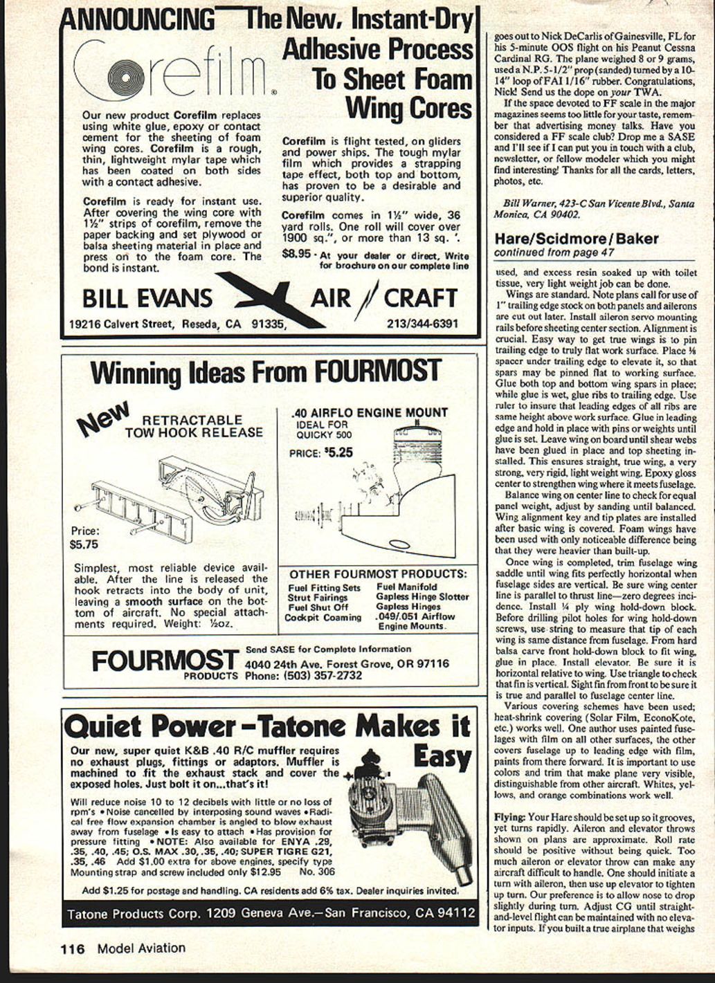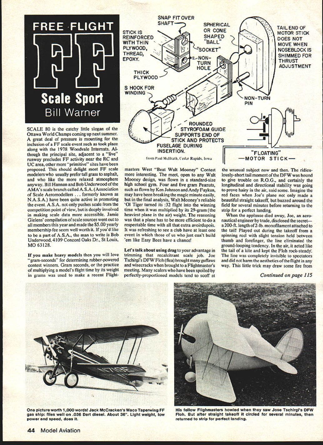 SCALE 80 catchy little slogan Ottawa World Champs coming up next summer great deal pressure mounting inclusion FF scale event such took place along 1978 Woodvale Intemats Al though principal site adjacent live runway precludes FF activity near RC UC area other primitive sites have proposed should delight FF scale modelers usually prefer tall grass asphalt like relaxed atmosphere anyway Bill Hannan Bob Underwood AMAs scale branch called SA Association Scale Aeromodellers . formerly known NASA have quite active promoting event SA pushes scale competition point view deeply involved making scale data accessible Jamie Gielens compilation scale sources went out members year made $500 yearly membership fee seem well worth youd like part ASA man write Bob Underwood 4109 Concord Oaks Dr St Louis MO 63128 make heavy models will love gram-seconds determining rubber-powered contest winners Gram seconds practice multiplying models flight time its weight grams used make recent FlightSPHERICAL OR CONE SHAPED BALLm SNAP FITOVER STICK IS SHAFT REINFORCED N WITH THIN PLYWOODSOCKET THREAD EPOXYNONTURNHOLE THICK PLYWOOD SHOOKFOR/ WINDING .ihNON TURN ROUNDED STYROFOAM GUIDE SUPPORTS END OF STICK AND PROTECTS FUSELAGE DURING______________ INSERTION Paul Mci Irat h edar Rapids Iowa masters West Beat Walt Mooney Contest interesting meet open Walt Mooney design flown standard-size high school gym Four five gram Peanuts such flown Ken Johnson Andy Faykun may have breaking magic minute easily final analysis Walt Mooneys reliable 01 Tiger turned its 32 flight winning time multiplied its 29-gram heaviest plane air weight reasoning plane has efficient respectable time extra avoirdupois refreshing see club have least event us just cant build em like Easy Bees have chance Lets talk about using drag advantage trimming recalcitrant scale job Joe Tschirgis DFW Floh flea brought guffaws wisecracks brought Flightmasters meeting scalers have spoiled perfectly-proportioned models tend scoff TAIL END OF MOTOR STICK DOES NOT MOVE WHEN NOSEBLOCK IS SHIMMED FOR THRUST ADJUSTMENT rdFPk XIKLJ STICK MOTOR unusual subject now ridicu lously-short tail moment DFW bound give trouble ROG certainly longitudinal directional stability going prove hairy air said some Imagine red faces Joes plane made beautiful straight takeoff buzzed around field several minutes before returning strip perfect landing applause died away Joe aero nautical engineer trade disclosed secret 200-ft length 2-lb monofilament attached tail Played out during takeoff spinning reel slight tension held between thumb forefinger line eliminated ground-looping tendency air acted like tail kite kept Floh rock-steadys line completely invisible spectators did harm aesthetics flight way little trick may draw some fire 44 Model Aviation Continued page 115 picture worth 1 000 words Jack McCrackens Waco Taperwing FFMis reilow -ilgnmasrers nowieu wrien iney saw Jose scnirgra uI-w gas ship flies well 036 Dart diesel About 36 Light weight lowFloh after straight takeoff circled several minutes power speed does itreturned strip perfect landing GIANT Scale STANDARD PILOT COMPLETE WITH GOGGLES VICKERS PLASTIC MACHINE GUN KITS GNOME ROTARY ENGINE CYLINDERS VINTAGE WHEELS 6% DIAMETER w AfLLJAas SEND 50 FOR COMPLETE CATALOG MA PAWNEE ST SAN MARCOS CA 9 Labor Day weekend 1978 time mula Ones joined new little broth ers Formula Vees powered more-or-less stock 600-cc VW car engines Thanks airports outstanding location shore Lake Erie crowd numbered over 100000 remembered old days first Cleveland F/Vee race old story have followed sport Steve Wittman toyed field winning cham pionship heat green-and-yellow Vee Witt record-setting 16257 mph Second Vein Willingham Renegade 15813 mph third F/I ace Bob Downey E C Fishers Sonerai Blueberry feature race weekend championship heat Formula Ones produced some very close exciting racing historys first win radical-design raceplane Jimmy Millers all-fiberglass pusher Texas Gem shade too fast Don Becks amazing Cassutt Gnat Miller turning Cleveland record 23326 mph Becks 23226 mph 3-mile oval mainly over water Bob Moeller third 23176 mph Downey fourth 23028 mph kind close racing Formula remains popular US Europe after 30 years action stage has set 50th Anniversary Cleveland Air Races held Sept 1-2-3 1979 Burke Lakefront Airport will old race planes display probably some old race pilots well will racing Formula Formula Vee hopefully Sport Biplane Class ac cording racing director Jack Dianiska course will Steve Wittman flying VW cant very well Cleveland Air Races Steve Pheasant biplane began 1929 built raced Chief Oshkosh Bonzo through 1930s tried Bell P-63 early post-war Thompson Trophy Races switched 190 cu Class little Bonzo still uses now its newest air race classes receiving benefit Steves experience wisdom racing know-how Come Labor Day 1979 Cleveland Air Races will 50 years old its star performer will 75 have made through some very great times some very difficult times racing poised verge heaven-knowswhat neither gives indication quitting FF Sport/Scale/Warner continued page 44 serious contest fliers certain find supporters among modelers like build wierd subjects have fly boot Dragging string nothing new remember few years ago Jim Adams getting gray hair watching diesel-powered Loening am phibian doing circle after circle water product review product review product review HBs Microton Auxiliary Muffler pictured tended used HB #4023 similar muffler substantially reduce exhaust noise manufacturer claims noise reduction approximately 80 81 decibels auxiliary muffler comes complete mounting hardware silicone tubing Second top Microton #7002 muffler Integrated diffusion design makes very efficient uiet muffler However muffler recommended airplanes provide substantial air flow engine cooling because muffler engine runs somewhat hotter Mounting hardware standard Third top standard HB expansion chamber muffler #4020 light-weight coolrunning muffler available engin