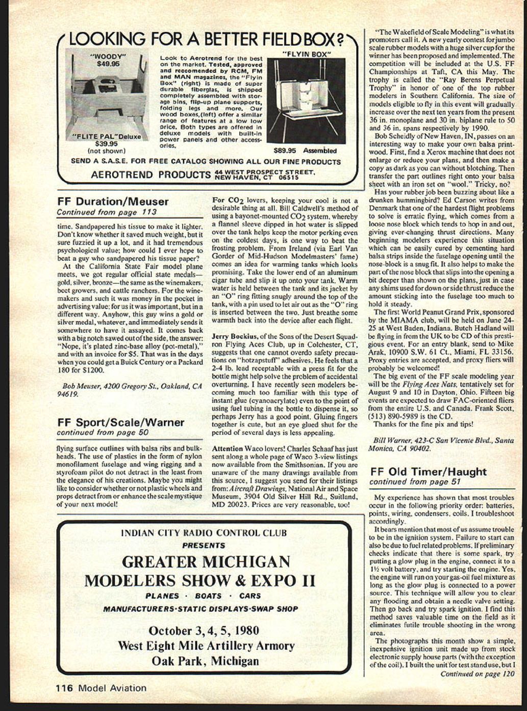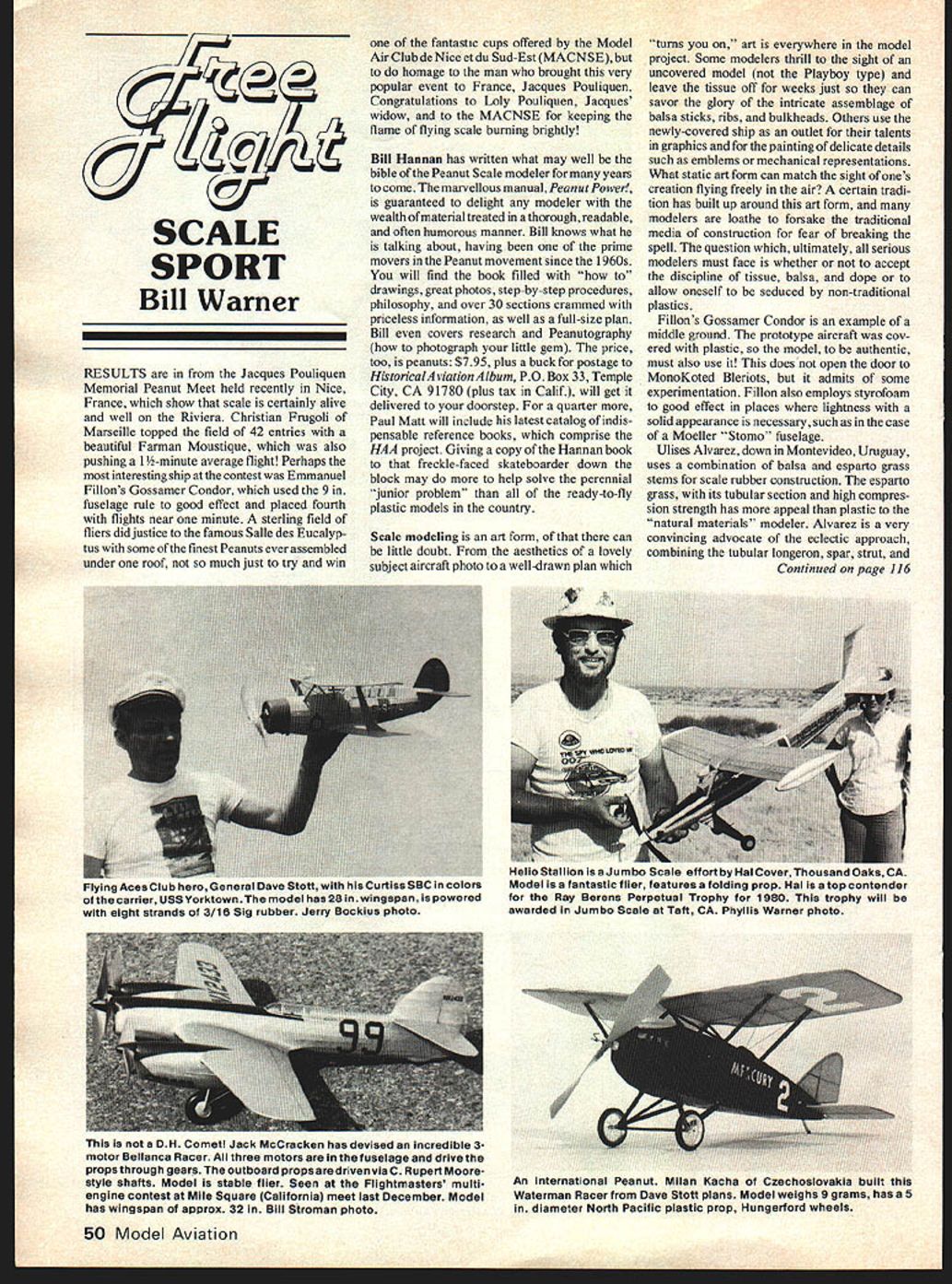 SCALE SPORT Bill Warner RESULTS Jacques Pouliquen Memorial Peanut Meet held recently Nice France show scale certainly alive well Riviera Christian Frugoli Marseille topped field 42 entries beautiful Farman Moustique also pushing 1-minute average flight Perhaps interesting ship contest Emmanuel Fillons Gossamer Condor used 9 fuselage rule good effect placed fourth flights near minute sterling field fliers did justice famous Salle des Eucalyp tus some finest Peanuts ever assembled under roof much just try win fantastic cups offered Model Air Club de Nice et du Sud-Est MACNSF homage man brought very popular event France Jacques Pouliquen Congratulations Loly Pouliquen Jacques widow MACNSE keeping flame flying scale burning brightly Bill Hannan has written what may well bible Peanut Scale modeler years come marvellous manual Peanut Power guaranteed delight modeler wealth ofmaterial treated thorough readable often humorous manner Bill knows what talking about having prime movers Peanut movement since 1 960s will find book filled drawings great photos step-by-step procedures philosophy over 30 sections crammed priceless information well full-size plan Bill covers research Peanutography photograph little gem price too peanuts $795 plus buck postage HistoricalAviation Album PO Box 33 Temple City CA 91780 plus tax Calif will get delivered doorstep quarter Paul Matt will include latest catalog indis pensable reference books comprise HAA project Giving copy Hannan book freckle-faced skateboarder down block may help solve perennial junior problem ready-to-fly plastic models country Scale modeling art form can little doubt aesthetics lovely subject aircraft photo well-drawn plan turns art everywhere model project Some modelers thrill sight uncovered model Playboy type leave tissue off weeks just can savor glory intricate assemblage balsa sticks ribs bulkheads Others use newly-covered ship outlet talents graphics painting delicate details such emblems mechanical representations What static art form can match sight ones creation flying freely air certain tradi tion has built up around art form modelers loathe forsake traditional media construction fear breaking spell question ultimately serious modelers must face whether accept discipline tissue balsa dope allow oneself seduced non-traditional plastics Fillons Gossamer Condor example middle ground prototype aircraft cov ered plastic model authentic must also use does open door MonoKoted Bleriots admits some experimentation Fillon also employs styrofoam good effect places lightness solid appearance necessary such case Moeller Stomo fuselage Ulises Alvarez down Montevideo Uruguay uses combination balsa esparto grass stems scale rubber construction esparto grass its tubular section high compres sion strength has appeal plastic natural materials modeler Alvarez very convincing advocate eclectic approach combining tubular longeron spar strut Continued page 116 50 Model Aviation carrier USS Yorktown model has 28 wingspan powered eight strands 3/16 Sig rubber Jerry Bockius photo Helio Stallion Jumbo Scale effortby Hal Cover Thousand Oaks CA Model fantastic flier features folding prop Hal atop contender Ray Berens Perpetual Trophy 1980 trophy will awarded Jumbo Scale Taft CA Phyllis Warner photo DH Comet Jack McCracken has devised incredible 3motor Bellanca Racer three motors fuselage drive props through gears outboard props aredriven via C Rupert Moorestyle shafts Model stable flier Seen Flightmasters multiengine contest Mile Square California meet last December Model has wingspan approx 32 Bill Stroman photo An international Peanut Milan Kacna CzecfloslovaKia built tills Waterman Racerfrom DaveStottplans Modelweighs9grams hasa5 diameter North Pacific plastic prop Hungerford wheels ING FOR BETTER FIELD BOX J CO2 lovers keeping cool desirable thing Bill CaIdwells method using bayonet-mounted CO2 system whereby flannel sleeve dipped hot water slipped over tank helps keep motor perking coldest days way beat frosting problem Ireland via Earl Van Gorder Mid-Hudson Modelmasters fame comes idea warming tanks looks promising Take lower end aluminum cigar tube slip up onto tank Warm water held between tank its jacket 0 ring fitting snugly around top tank pin used let air out 0 ring inserted between two Just breathe some warmth back device after flight Jerry Bockius Sons Desert Squad ron Flying Aces Club up Colchester CT suggests cannot overdo safety precau tions hotzapstuff adhesives feels 2-4 lb lead receptable press fit bottle might help solve problem accidental overturning have recently seen modelers coming much too familiar type instant glue cyanoacrylate point using fuel tubing bottle dispense perhaps Jerry has good point Gluing fingers together cute eye glued shut period several days less appealing Attention Waco lovers Charles Schaaf has just sent along whole page Waco 3-view listings now available Smithsonian unaware drawings available source suggest send listings irc raft Drawings National Air Space Museum 3904 Old Silver Hill Rd Suitland MD 20023 Prices very reasonable too FF Duration/Meuser Continued page 113 time Sandpapered tissue make lighter Dont know whether saved much weight sure fuzzied up lot tremendous psychological value could ever hope beat guy sandpapered tissue paper California State Fair model plane meets got regular official state medals gold silver bronzethe same winemakers beet growers cattle ranchers winemakers such money pocket advertising value us important different way Anyhow guy wins gold silver medal whatever immediately sends somewhere have assayed comes back big notch sawed out side answer Nope its plated zinc-base alloy pot-metal invoice $5 days could get Buick Century Packard 180 $1200 Bob Meuser 4200 Gregory St Oakland CA 94619 FF Sport/Scale/Warner continued page 50 flying surface outlines balsa ribs bulk heads use plastics form nylon monofilament fuselage wing rigging styrofoam pilot detract least elegance creations Maybe migh
