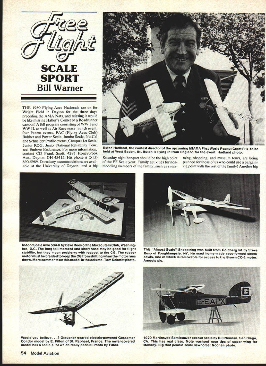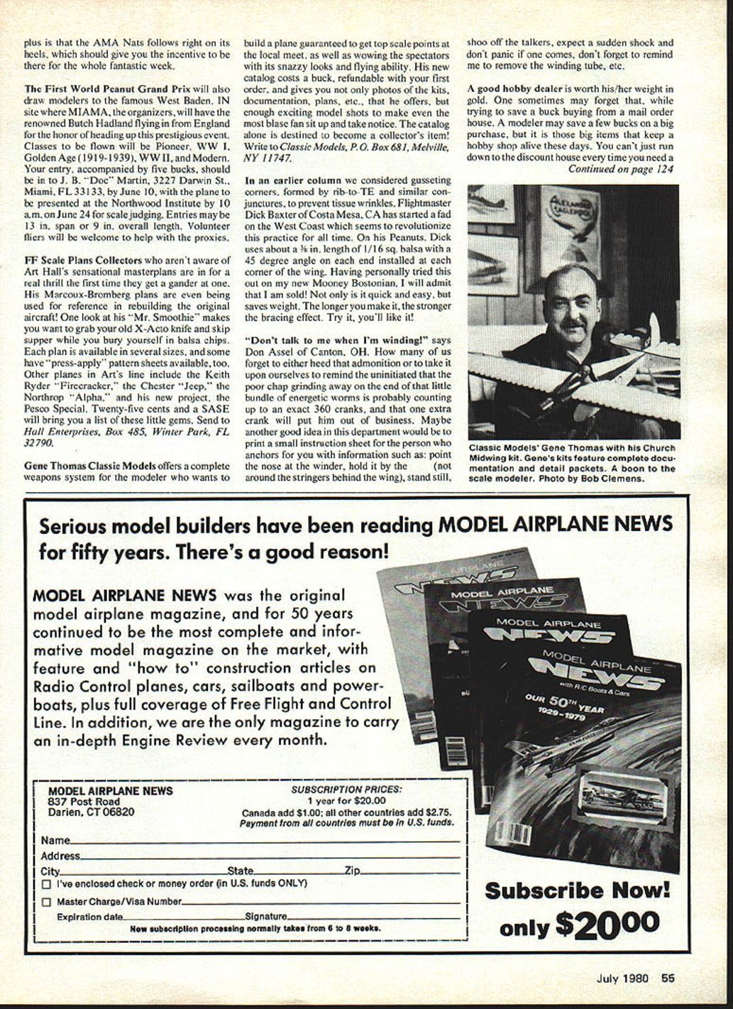1#7 SCALE SPORT Bill Warner THE 1980 Flying Aces Nationals Wright Field Dayton three days preceding AMA Nats missing would like missing Halleys Comet Roadrunner cartoon full program consisting WW WW II well Air Race mass-launch event four Peanut events FAC Flying Aces Club Rubber Power Scale Jumbo Scale No-Cal Schneider Profile events Catapult Jet Scale Junior ROG Junior National Reliability Tour Embryo Endurance information contact CD Frank Scott 4283 Honeybrook Ave Dayton OH 45415 phone 513 890-5989 Dormitory accommodations avail able University Dayton big Saturday night banquet should high point FF Scale year Family activities nonmodeling members family such swimming shopping museum tours being planned us could use bargain ing point rest family Another big 54 Model Aviation Butch Hadland contest director upcoming MIAMA l-mrst World ieanut Urant Prix held West Baden IN Butch flying England event Hadland photo Indoor Scale Avro 504-K Dave Rees Maxecuters Club Washing ton DC long tail moment short nose may good flight stability mean problems respect CG rubber motor must braided keep CG shifting motor runs down comments model thecoluhmn Tom Schmitt photo mis imost scale shoestring built Goldberg kit Steve Buso Poughkeepsie NY used home-made vacu-formed cheek cowls removable access Brown CO-2 motor Arnouts pic Would believe pner geared electric-powered Gossamer Condor model E Fillon St Raphael France mylar-covered model has scale pilot really pedals Photo Fillon 1920 Martinsyde Semiquaver pE~t scale Bill Noonan San Diego CA has real class Note washout near tips upper wing stability Dig peanut scale sawhorse Noonan photo plus AMA Nats follows right its heels should give incentive whole fantastic week First World Peanut Grand Prix will also draw modelers famous West Baden IN site MIAMA organizers will have renowned Butch Hadland flying England honor heading up prestigious event Classes flown will Pioneer WW Golden Age 1919-1939 WW II Modern entry accompanied five bucks should J B Doc Martin 3227 Darwin St Miami FL 33133 June 10 plane presented Northwood Institute 10 am June24 scale judging Entries maybe 13 span 9 overall length Volunteer fliers will welcome help proxies FE Scale Plans Collectors arent aware Art Halls sensational masterplans real thrill first time get gander Marcoux-Bromberg plans being used reference rebuilding original aircraft look Mr Smoothie makes want grab old X-Acto knife skip supper bury yourself balsa chips plan available several sizes some have press-apply pattern sheets available too Other planes Arts line include Keith Ryder Firecracker Chester Jeep Northrop Alpha new project Pesco Special Twenty-five cents SASE will bring list little gems Send Hall Enterprises Box 485 Winter Park FL 32790 Gene Thomas Classic Models offers complete weapons system modeler wants build plane guaranteed get top scale points local meet well wowing spectators its snazzy looks flying ability new catalog costs buck refundable first order gives photos kits documentation plans etc offers enough exciting model shots make blase fan sit up take notice catalog alone destined become collectors item Write Classic Models PO Box 681 Melville NY 11747 earlier column considered gusseting comers formed rib-to-TE similar con junctures prevent tissue wrinkles Flightmaster Dick Baxter Costa Mesa CA has started fad West Coast seems revolutionize practice time Peanuts Dick uses about 4s length 1/16 sq balsa 45 degree angle end installed comer wing Having personally tried out new Mooney Bostonian will admit am sold quick easy saves weight longer make stronger bracing effect Try youll like Dont talk Im winding says Don Assel Canton OH us forget eitber heed admonition take upon ourselves remind uninitiated poor chap grinding away end little bundle energetic worms probably counting up exact 360 cranks extra crank will put him Out business Maybe another good idea department would print small instruction sheet person anchors information such point nose winder hold around stringers behind wing stand still shoo off talkers expect sudden shock dont panic comes dont forget remind remove winding tube etc good hobby dealer worth his/her weight gold sometimes may forget trying save buck buying mail order house modeler may save few bucks big purchase big items keep hobby shop alive days cant just run down discount house time need Continued page 124 MODEL AIRPLANE NEWSSUBSCRIPTION PRICES 837 Post Road1 year $2000I Darien CT 06820Canada add $100 other countries add $275 IPayment trom countries must US funds NameI AddressI CityStatlipI Ive enclosed check money order US funds ONLY Master Charge/Visa Number______________________ IExpiration dateSignature INew subscrltlon processIng normally takes S S weeks [v32][b-2-10-1-10]] July 1980 55 assic MoUeIs ene nomas wHin nis Lnurcn Midwing kit Genes kits feature complete docu mentation detail packets boon scale modeler Photo Bob Clemens Serious model builders have reading MODEL AIRPLANE NEWS fifty years Theres good reason MODEL AIRPLANE NEWS original model airplane magazine 50 years continued complete infor mative model magazine market feature construction articles Radio Control planes cars sailboats powerboats plus full coverage Free Flight Control Line addition magazine carry in-depth Engine Review month Subscribe Now $2000 READY NOW AAmco Inc have issued three NEW R/C kits last two years best challenged anyone industry BIG-H QUIKRAY 500 very newest R/C kit X RAY AAmco issue new kit just sake putting out another kit new kits well planned Modeler also create sales Dealers Distributors because R/C kits own selling!! WHAT IS NEXT? WATCH MR GUS modelers industry has need kit like MR GUS very long time Lou Andrews AAmco guy company will issue RN during latter part 1979and two World Champshe has little opportunity crack record hard fly competition too occasion combined San Valeers California Eagles Annual Taft March 8 Thirteen straight maxes total score of57 minutes will probably sta
