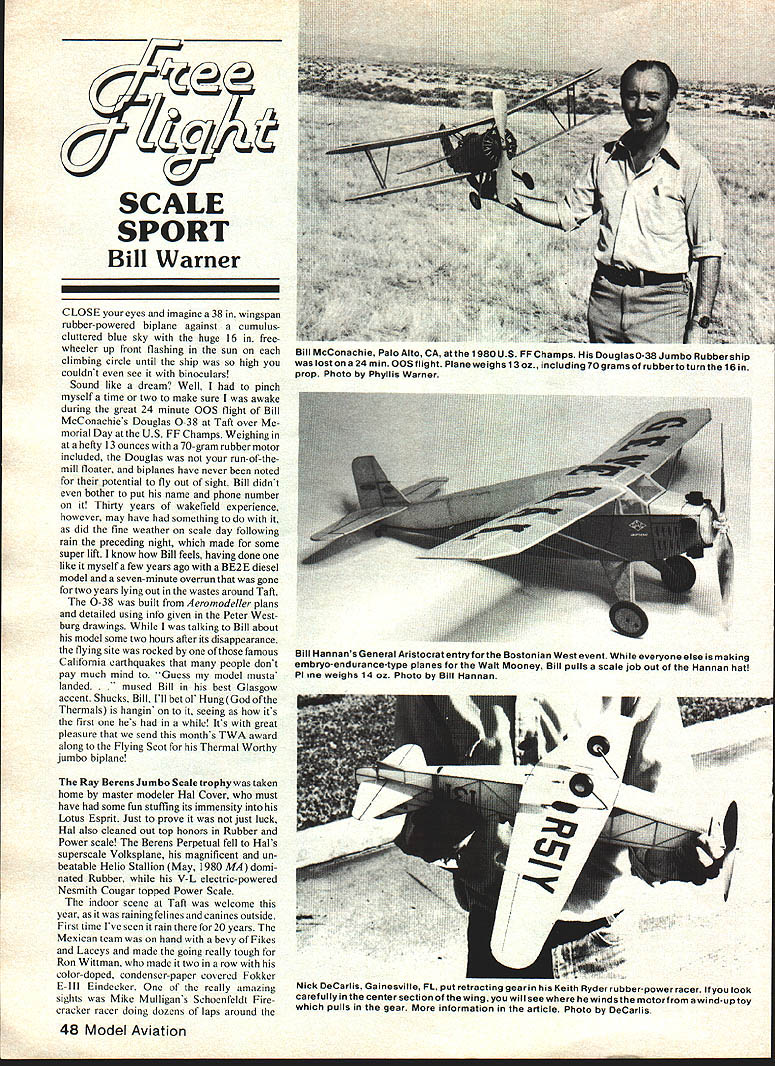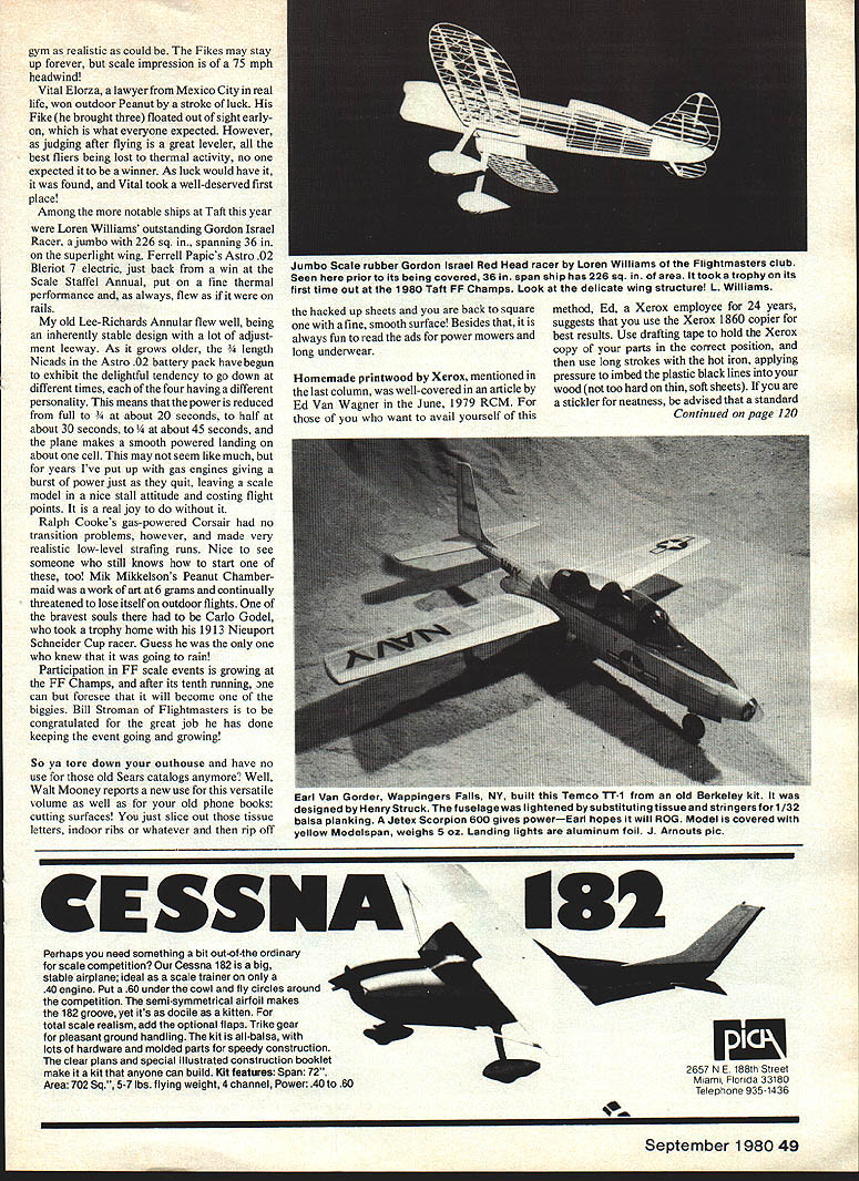 SCALE SPORT Bill Warner CLOSE eyes imagine 38 wingspan rubber-powered biplane against cumuluscluttered blue sky huge 16 freewheeler up front flashing sun climbing circle until ship high couldnt see binoculars Sound like dream Well pinch myself time two make sure awake during great 24 minute OOS flight Bill MeConachies Douglas 0-38 Taft over morial Day US FF Champs Weighing hefty 13 ounces 70-gram rubber motor included Douglas run-of-themill floater biplanes have never noted potential fly out sight Bill didnt bother put name phone number Thirty years wakefield experience however may have something did fine weather scale day following rain preceding night made some super lift know Bill feels having done like myself few years ago BE2E diesel model seven-minute overrun gone two years lying out wastes around Taft 0-38 built Aeromodeller plans detailed using info given Peter Westburg drawings talking Bill about model some two hours after its disappearance flying site rocked famous California carthquakes people dunt pay much mind Guess model musts landed used Bill best Glasgow accent Shucks Bill Ill bet ol HungGod Thermals hangin seeing its first hes Its great pleasure send months TWA award along Flying Scot Thermal Worthy jumbo biplane Ray Berens Jumbo Scale trophy taken home master modeler Hal Cover must have some fun stuffing its immensity Lotus Esprit Just prove just luck Hal also cleaned out top honors Rubber Power scale Berens Perpetual fell Hals superseale Volksplane magnificent un beatable Helio Stallion May 1980 MA domi nated Rubber V-L electric-powered Nesmith Cougar topped Power Scale indoor scene Taft welcome year raining felines canines outside First time Ive seen rain 20 years Mexican team hand bevy Fikes Laceys made going really tough Ron Wittman made two row color-doped condenser-paper covered Fokker E-lll Findecker really amazing sights Mike Mulligans Schoenfeldt Fire cracker racer doing dozens laps around 48 Model Aviation Bill McConachie Palo Alto CA atthe 1980 US FF Champs Douglaso-38 Jumbo Rubber ship lostona 24 mm OOSflight Planeweighsl3oz including7ogramsof rubbertoturnthe 1 Bin prop Photo Phyllis Warner Bill Hannans General Aristocrat entryforthe Bostonian West event everyone else making embryo-endurance-type planes Walt Mooney Bill pulls scale job out Hannan hat P1 inc weighs 14 02 Photo Bill Hannan 1 / Nick DeCarlis Gainesville FL put retracting gear Keith Ryder rubber-power racer look carefully center section wing will see winds motor winduptoy pulls gear information article Photo DeCarlis gym realistic could Fikes may stay up forever scale impression 75 mph headwind Vital Elorza lawyer Mexico City real life won outdoor Peanut stroke luck Fike brought three floated Out sight earlyon what everyone expected However judging after flying great leveler best fliers being lost thermal activity no expected itto winner As luck would have it found Vital took well-deserved first place Among notable ships Taft year Loren Williams outstanding Gordon Israel Racer ajumbo 226 sq spanning 36 superlight wing Ferrell Papics Astro 02 Bleriot 7 electric just back win Scale Staffel Annual put fine thermal performance always flew rails old Lee-Richards Annular flew well being inherently stable design lot adjust ment leeway As grows older th Nicads Astro 02 battery pack have begun exhibit delightful tendency go down different times four having different personality means power reduced full t 20 seconds half about 30 seconds t 45 seconds plane makes smooth powered landing about cell may seem like much years Ive put up gas engines giving burst power just quit leaving scale model nice stall attitude costing flight points real joy Ralph Cookes gas-powered Corsair no transition problems however made very realistic low-level strafing runs Nice see someone still knows start too Mik Mikkelsons Peanut Chamber maid work art 6 grams continually threatened lose itself outdoor flights bravest souls Carlo Godel took trophy home 1913 Nieuport Schneider Cup racer Guess knew going rain Participation FF scale events growing FF Champs after its tenth running ne can foresee will become biggies Bill Stroman Flightmasters congratulated great job has done keeping event going growing So ya tore down outhouse have no use old Sears catalogs anymore Well Walt Mooney reports new use versatile volume well old phone books cutting surfaces just slice out tissue letters indoor ribs whatever rip off hacked up sheets back square fine smooth surface Besides always fun read ads power mowers long underwear Homemade printwood Xerox mentioned last column well-covered article Ed Van Wagner June 1979 RCM want avail yourself method Ed Xerox employee 24 years suggests use Xerox 1860 copier best results Use drafting tape hold Xerox copy parts correct position use long strokes hot iron applying pressure imbed plastic black lines wood too hard thin soft sheets stickler neatness advised standard Continued page 120 CESS Perhaps need something bit out-ofthe ordinary scale competition Cessna 182 big stable airplane ideal scale trainer 40 engine Put 60 under cowl fly circles around competition semi-symmetrical airfoil makes 182 groove yet its docile kitten total scale realism add optional flaps Trike gear pleasant ground handling kit all-balsa lots hardware molded parts speedy construction clear plans special illustrated construction booklet make skit anyone can build Kit features Span 72 Area 702 Sq 5-7 lbs flying weight 4 channel Power 40 60 2657NE 88hS ee Main Fo da3380 Teephone935 436 September 1980 49 Jumbo Scale rubber Gordon Israel Red Head racer Loren Williams Flightmasters club Seen prior its being covered 36 span ship has 226 sq area took trophy its first time out 1980 Taft FF Champs Look delicate wing structure L Williams Earl Van Gorder Wappingers t Temco TT-1 old Berkeley kit designed Henry Struck fuselage lightened substituting tissue stringers 1/32 balsa planking Jetex Scorpion 600 gives powerEarl hopes will ROG Model covered 
