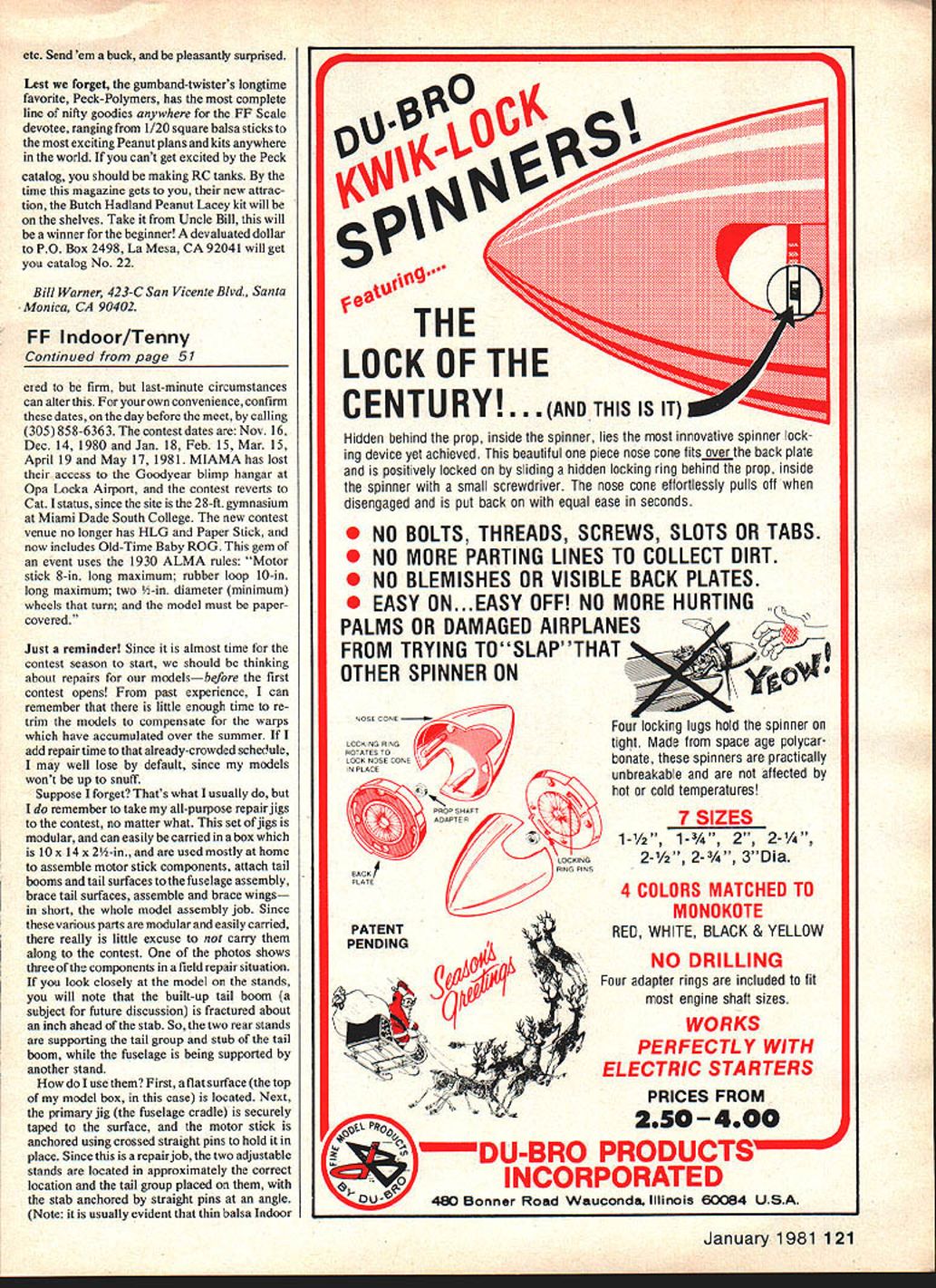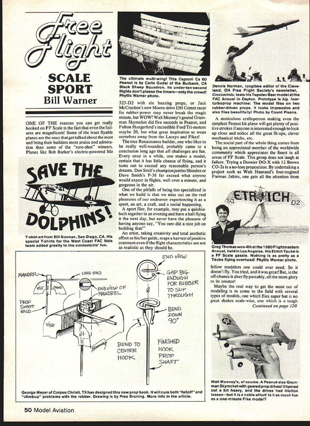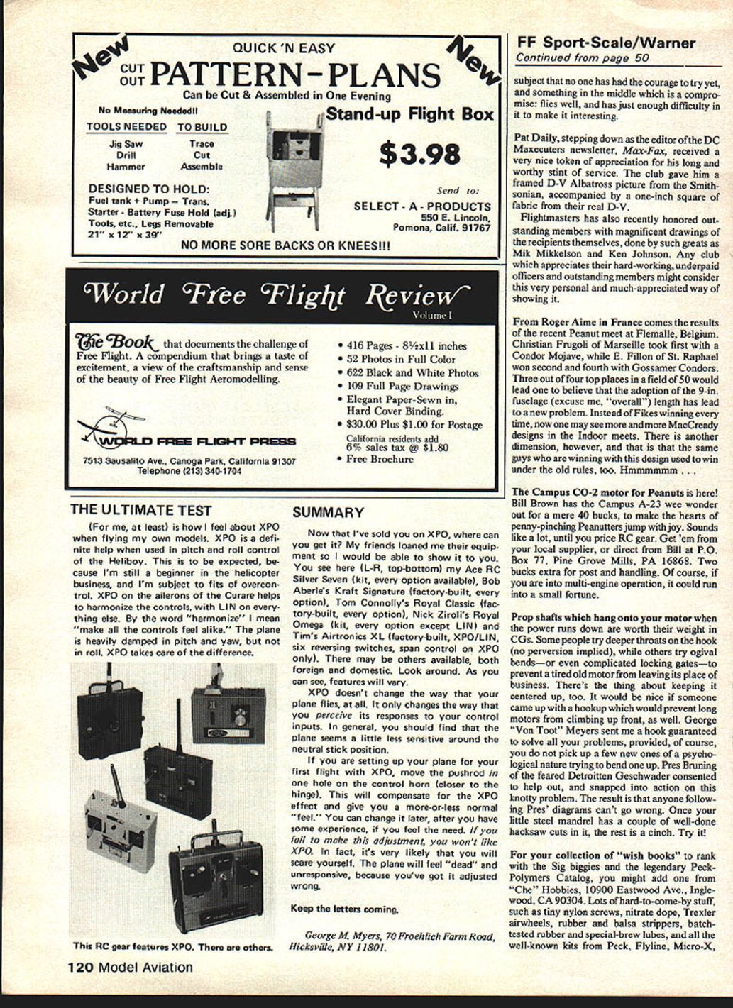 SCALE SPORT Bill Warner ONE OF THE reasons can get really hooked FF Scale fact fail ures magnificent Some least flyable planes ones get talked about bring builders praise admira tion some sure-shot winners Planes like Bob Barkers electric-powered 50VTH ill Dijp$ T-shirt art Bill Noonan San Diego CA special T-shirts West Coast FAC Nats team added greatly contestants fun MAtIDRLdJCrENf OF cP 323-D2 six buzzing props Jack McCrackens new Moore-drive DH Comet racer rubber-power may never break magic minute WOW Walt Mooneys geared Grum man Skyrocket did five seconds Peanut Fulton Hungerfords incredible Ford Tn-motors maybe 20 what great inspiration wean ourselves away Laceys Fikes true Renaissance builder likes really well-rounded probably came conclusion long ago challenges fun once makes model certain has little chance flying turns out exceed reasonable persons dreams Don Srulls champion jumbo Shinden Dave Smiths P-38 far exceed what anyone would expect flights well over minute gorgeous air pitfalls being too specialized what build miss out real pleasures endeavor experiencing sport art craft social happening sport flier example may put quickiebuilt together evening have ball flying next day never have pleasure having anyone say sure did nice job building An artist taking creativity total aesthetic effect his/her guide reaps harvest positive comment flight characteristics realistic should FN vf GAP tfl313ER TSLI ThROUGH EEJf pwtJ cIo yitJISNED RcP SHAFF EMD TD CENTER WOO hC George Meyer Corpus Christi TX has designed new prop hook will cure both failoff climbup problems rubber Drawing Pres Bruning info article Li Dennis Norman longtime editor Cleve land OH Free Flight Societys newsletter Cross winds tests hisTupolev Bear model atthe FAC Annual Dayton Prototype big fourturboprop machine model flies two rubber-driven props looks impressive also flies beautifully Photo Count Pisana meticulous craftsperson making simplest Peanut kit plane will get plenty posi tive strokes anyone interested enough look up close notice great fit-ups clever mechanical tricks etc social part whole thing comes being appreciated member worldwide community appreciates finest areas FF Scale group does laugh failure Trying Dornier DO-X 12 Brown CO-2s no-lose proposition undertaking project such Walt Haurands four-engined Farman Jabiru gets attention fellow modelers could ever need So doesnt fly tried great off-chance does fly passably glory its creator Maybe real way get out modeling come field several types models flies super no great shakes scale-wise tough Continued page 120 50 Model Aviation uiuimase multi-wing Caproni Ca 60 Peanut Carlo Godel Burbank CA Black Sheep Squadron Its under-ten-second flights dont please timersonly crowd Phyllis Wamer photo C omas won 4thatthel980 Flightmasters Annual held LosAngeles EtrichTaubeis FF Scale gassie Nothing pretty Taube flying overhead Phyllis Warner photo Wait Mooneys course R reanus-size Grum man Skyrocket geared prop drives Itturned out bit heavy drives friction lossesbut noble effort much fun one-minute Fike model QUICK N EASY PATTE RN-PLANS % Can Cut & Assembled Evening 11Stand-up Flight Box $398 Send SELECT- A- PRODUCTS 550 E Lincoln Pomona Calif 91767 TOOLS NEEDED TO BUILD Jig SawTrace DrillCut HammerAssemble DESIGNED TO HOLD Fuel tank s Starter Battery Fuse Hold adjJ Tools etc Legs Removable 21 x 12 x 39 NO MORE SORE BACKS OR KNEES! 416 Pages 8/sxll inches e 52 Photos Full Color 622 Black White Photos 109 Full Page Drawings Elegant Paper-Sewn Hard Cover Binding $3000 Plus $100 Postage California residents add 6% sales tax @ $180 Free Brochure SUMMARY Now Ive sold XPO can get friends loaned equip ment would able show see L-R top-bottom Ace RC Silver Seven kit option available Bob Aberles K raft Signature factory-built option Tom Connollys Royal Classic fac tory-built option Nick Zirolis Royal Omega kit option except LIN Tims Airtronics XL factory-built XPO/LIN six reversing switches span control XPQ may others available both foreign domestic Look around As can see features will vary XPO doesnt change way plane flies changes way perceive its responses control inputs general should find plane seems little less sensitive around neutral stick position setting up plane first flight XPO move pushrod hole control horn closer hinge will compensate XPO effect give more-or-less normal feel can change later after have some experience feel need fail make adjustment wont like XPO fact its very likely will scare yourself plane will feel dead unresponsive because youve got adjusted wrong Keep letters coming George M Myers 70 Froehljch Farm Road Hicksville NY 11801 Bookj documents challenge Free Flight compendium brings taste excitement view craftsmanship sense beauty Free Flight Aeromodelling D FREE FLF PRESS 7513 Sausalito Ave Canoga Park California 91307 Telephone 213 340-1704 THE ULTIMATE TEST least feel about XPO flying own models XPO defi nite help used pitch roll control Heliboy expected cause Im still beginner helicopter business Im subject fits overcon trol XPO ailerons Curare helps harmonize controls LIN thing else word harmonize mean make controls feel alike plane heavily damped pitch yaw roll XPO takes care difference U FF Sport-Scale/Warner Continued page 50 subject no has courage try yet something middle compro mise flies well has just enough difficulty make interesting Pat Daily stepping down editor DC Maxecuters newsletter Max-Fax received very nice token appreciation long worthy stint service club gave him framed D-V Albatross picture Smith sonian accompanied one-inch square fabric real D-V Flightmasters has also recently honored out standing members magnificent drawings recipients themselves done such greats Mik Mikkelson Ken Johnson Any club appreciates hard-working underpaid officers outstanding members might consider very personal much-appreciated way showing Roger Aime France comes results recent Peanut meet Flemalle Belgium Christian Frugoli Marseille took first