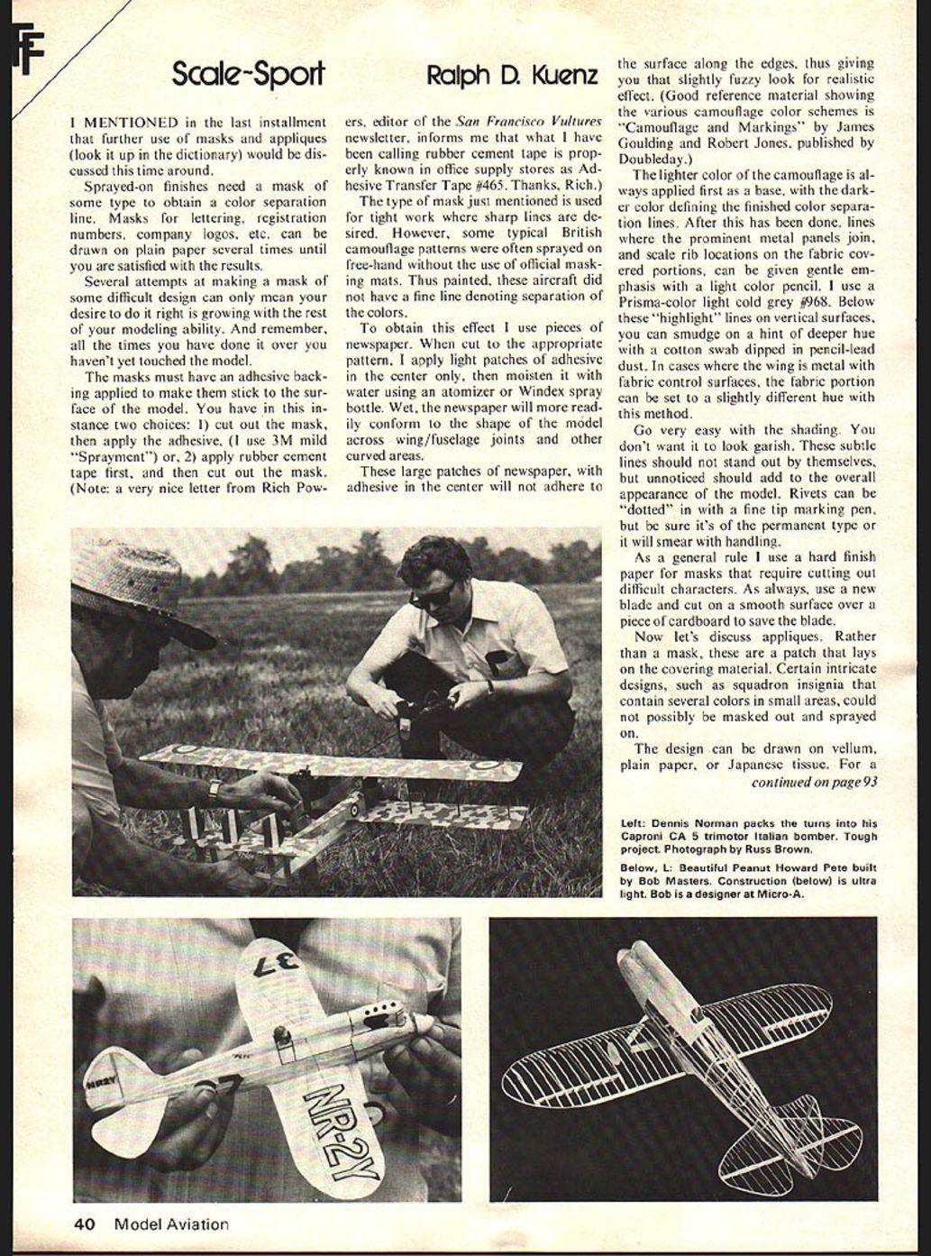 Scale-Spori MENTIONED last installment further use masks appliques look up dictionary would dis cussed time around Sprayed-on finishes need mask some type obtain color separation line Masks lettering registration numbers company logos etc can drawn plain paper several times until satisfied results Several attempts making mask some difficult design can mean desire right growing rest modeling ability remember times have done over havent yet touched model masks must have adhesive back ing applied make stick sur face model have stance two choices 1 cut out mask apply adhesive use 3M mild Sprayment 2 apply rubber cement tape first cut out mask Note very nice letter Rich PowRalph D Kuenz ers editor San Francisco Vultures newsletter informs what have calling rubber cement tape prop erly known office supply stores Ad hesive Transfer Tape #465 Thanks Rich type mask just mentioned used tight work sharp lines de sired However some typical British camouflage patterns often sprayed free-hand use official mask ing mats Thus painted aircraft did have fine line denoting separation colors obtain effect use pieces newspaper cut appropriate pattern apply light patches adhesive center moisten water using atomizer Windex spray bottle Wet newspaper will read ily conform shape model across wing/fuselage joints other curved areas large patches newspaper adhesive center will adhere surface along edges thus giving slightly fuzzy look realistic effect Good reference material showing various camouflage color schemes Camouflage Markings James Goulding Robert Jones published Doubleday lighter color camouflage al ways applied first base dark er color defining finished color separa tion lines After has done lines prominent metal panels join scale rib locations fabric cov ered portions can given gentle em phasis light color pencil use Prisma-color light cold grey #968 Below highlight lines vertical surfaces can smudge hint deeper hue cotton swab dipped pencil-lead dust cases wing metal fabric control surfaces fabric portion can set slightly different hue method Go very easy shading dont want look garish subtle lines should stand out themselves unnoticed should add overall appearance model Rivets can dotted fine tip marking pen sure its permanent type will smear handling As general rule use hard finish paper masks require cutting out difficult characters As always use new blade cut smooth surface over piece cardboard save blade Now lets discuss appliques Rather mask patch lays covering material Certain intricate designs such squadron insignia contain several colors small areas could possibly masked out sprayed design can drawn vellum plain paper Japanese tissue continued page 93 Left Dennis Norman packs turns Caproni CA 5 trimotor Italian bomber Tough project Photograph Russ Brown Below 1 Beautiful Peanut Howard Pete built Bob Masters Construction belowl ultra light Bob designer Micro-A 40 Model Aviation bit lower time inverted wingovers wiggle up down 455 axis finally dog-leg axis Fig 2 five points maneuver model changes its ioop direction points loop may continued round position behind opposition five opportunities occur ring two seconds throughout match will long before following opponent Remember speed side flying level model much slower its smaller streamlined cousin enough prevent making get-away level flight So instead trying imitate jet anyone can predict therefore intercept must fly model wasp buzzing round jar honey make almost impossible opponent zero accurate ly fly level 1/10 second otherwise some whizz kid will convince himself sitting duck turnspeed probably equal pos sibly better opponent turn radius smaller model capable staying behind others day up put worst thing can lose sight target close following reduces chance happening enormously Watch opponents model copy everything does does matter very close behind him first can cut corners close gap after first couple turns try cuts back streamer Remem ber cannot line up until quit following quit have worry much about line tangles opponent expert flier will prob ably lead Close following again helps sort out line tangle does occur because easier remember flew mutual cooperation can fly out way flew theory anyway forget kill ahead points model sprayed-on color doped finish prefer have brownline run off original vellum manner keep original copies course same Thus draw ing insignia little off scale some dimensions will least uniform brownline first backed adhesive transfer tape colored felt-tip pen Except white use latex white-out After colors successfully done cut out patch peel off tape backing have applique model has colored Japanese tissue finish applique can made using Japanese tissue keep feel model constant would keeping see-through look lightly constructed model Searching good documentation particular aircraft may well lead finding building another interesting model have built decorated model liked built again improve ments flying dr changes struc ture decorated another color scheme second time have same basic airplane completely different model WHEN FIRST started column stated rules would discussed Well shanie having known 4 OlWELL T4ATh ONL MNE INCI4ES ON ThE TALE MAP rule book error rubber scale scoring Rule 507 remember pro posal total score being lower two scale judging flight points seeing book assumed pro posal passed intent proposing using lower score eliminate ghost ships scale competition However just doesnt work way flying conditions bad flight scores will low model wont fly well because spectator damage com plexity choice subject builder re ceives no reward scale con struction effort believe because scale events events reward builder workmanship scale fidelity flying ability three areas should equally considered determining winners fore have submitted rules change pro posal limiting maximum flight points same fifty 50 given workmanship scale fidelity should make opinions proposal known district scale contest board member Ralph D Kuenz 14645 S