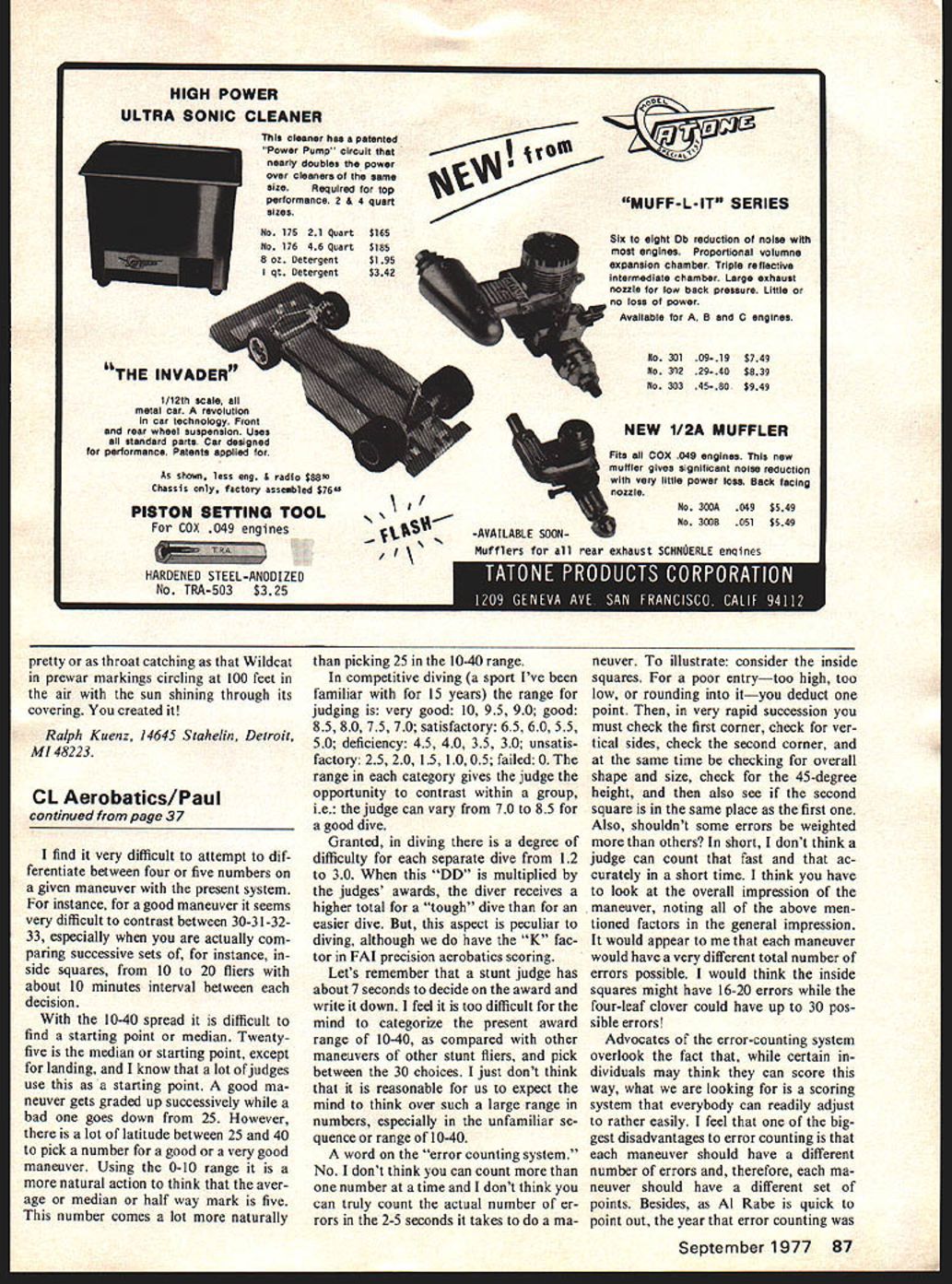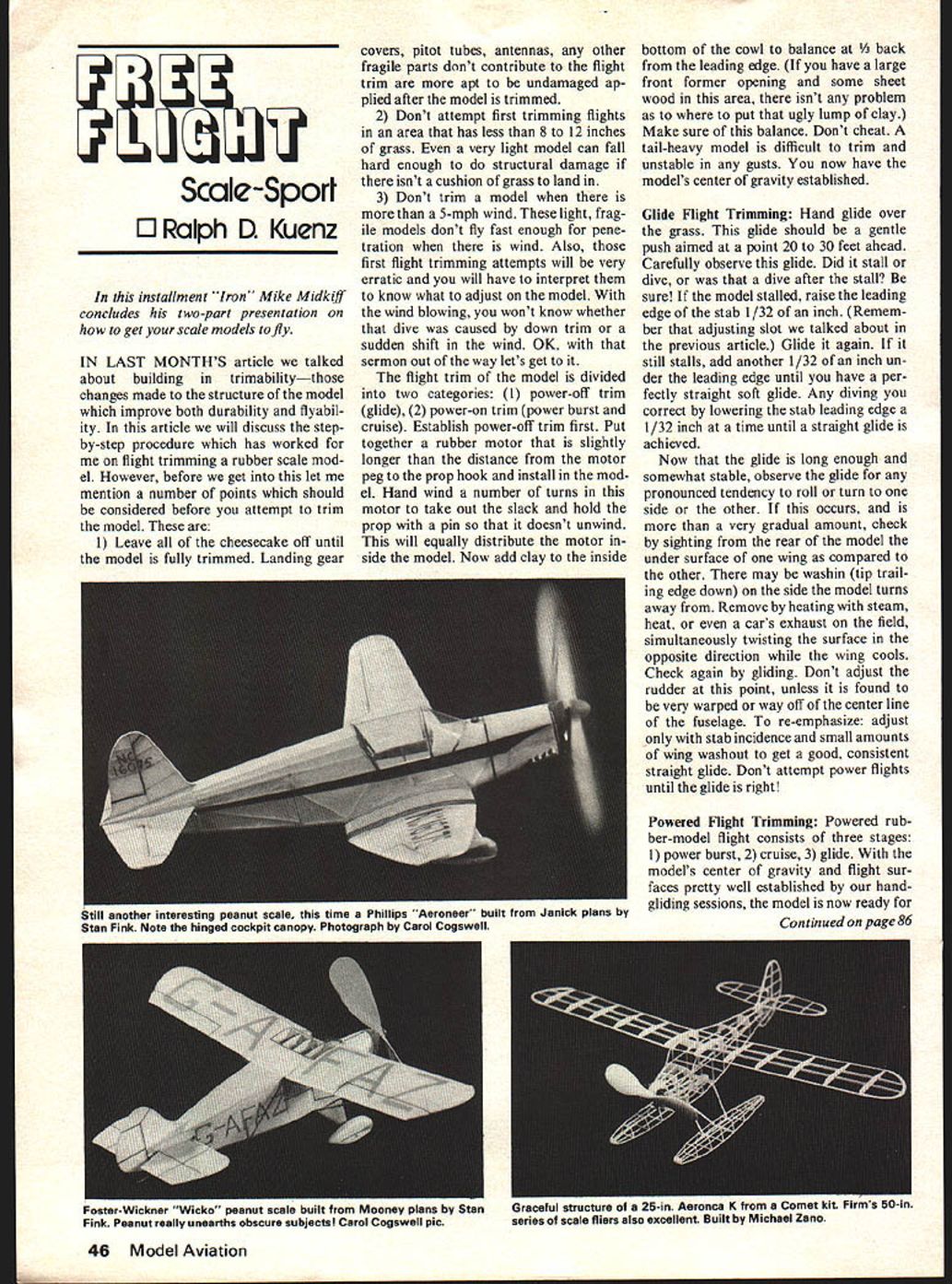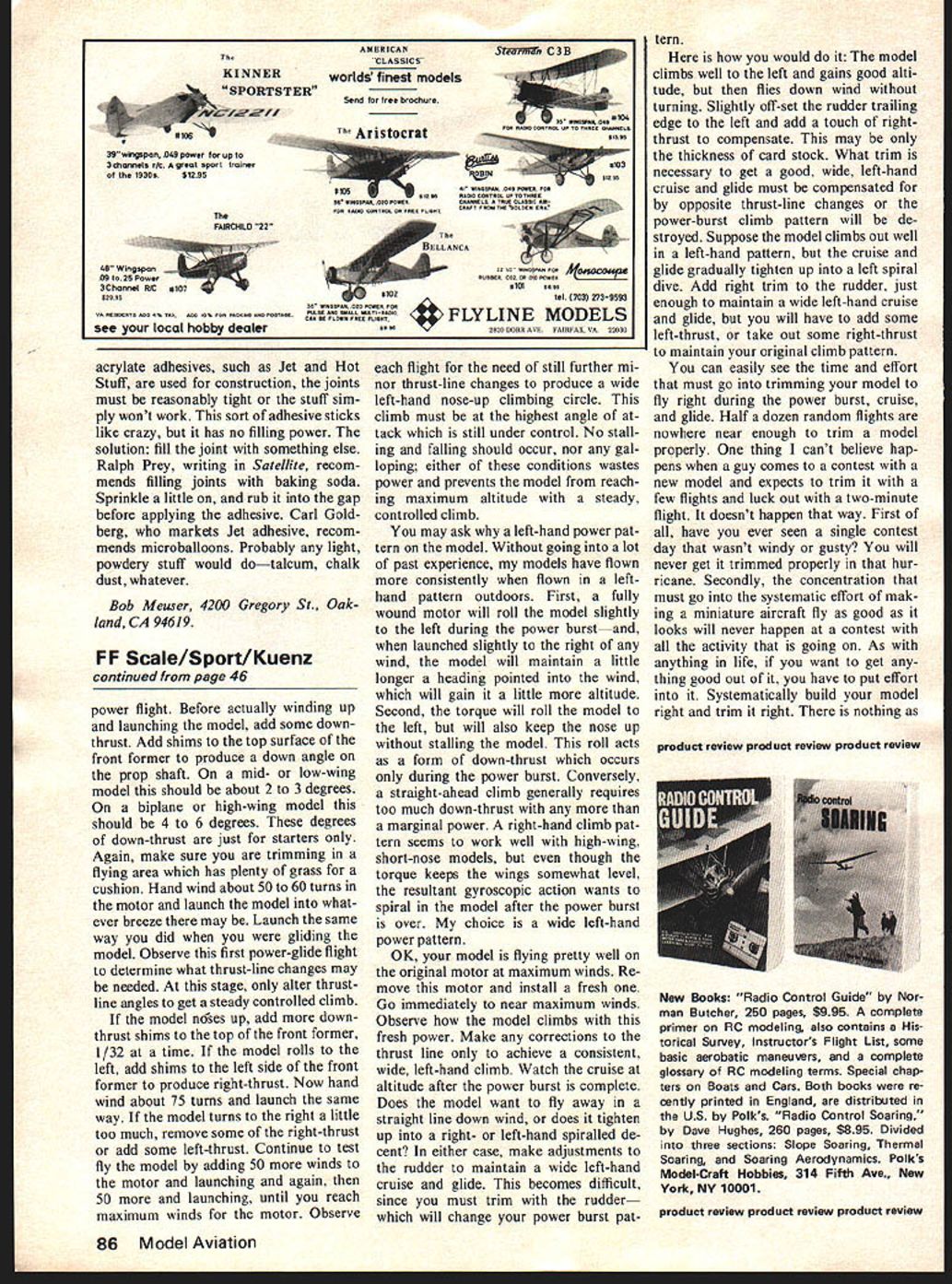 B Scale-Sport O Ralph D Kuenz installment Iron Mike Midkiff concludes two-part presentation get scale models fly IN LAST MONTHS article talked about building trimabilitythose changes made structure model improve both durability flyabil ity article will discuss stepby-step procedure has worked flight trimming rubber scale mod el However before get let mention number points should considered before attempt trim model I Leave cheesecake off until model fully trimmed Landing gear covers pitot tubes antennas other fragile parts dont contribute flight trim apt undamaged ap plied after model trimmed 2 Dont attempt first trimming flights area has less 8 12 inches grass very light model can fall hard enough structural damage isnt cushion grass land 3 Dont trim model 5-mph wind light frag ile models dont fly fast enough pene tration wind Also first flight trimming attempts will very erratic will have interpret know what adjust model wind blowing wont know whether dive caused down trim sudden shift wind OK sermon out way lets get flight trim model divided two categories 1 power-off trim glide 2 power-on trim power burst cruise Establish power-off trim first Put together rubber motor slightly longer distance motor peg prop hook install mod el Hand wind number turns motor take out slack hold prop pin doesnt unwind will equally distribute motor side model Now add clay inside bottom cowl balance leading edge have large front former opening some sheet wood area isnt problem put ugly lump clay Make sure balance Dont cheat tail-heavy model difficult trim unstable gusts now have models center gravity established Glide Flight Trimming Hand glide over grass glide should gentle push aimed point 20 30 feet ahead Carefully observe glide Did stall dive dive after stall sure model stalled raise leading edge stab 1/32 inch Remem ber adjusting slot talked about previous article Glide again still stalls add another 1/32 inch un der leading edge until have per fectly straight soft glide Any diving correct lowering stab leading edge 1/32 inch time until straight glide achieved Now glide long enough somewhat stable observe glide pronounced tendency roll turn side other occurs very gradual amount check sighting rear model under surface wing compared other may washin tip trail ing edge down side model turns away Remove heating steam heat cars exhaust field simultaneously twisting surface opposite direction wing cools Check again gliding Dont adjust rudder point unless found very warped way off center line fuselage re-emphasize adjust stab incidence small amounts wing washout get good consistent straight glide Dont attempt power flights until glide right Powered Flight Trimming Powered rub ber-model flight consists three stages I power burst 2 cruise 3 glide models center gravity flight sur faces pretty well established handgliding sessions model now ready Continued page 86 46 Model Aviation Still another interesting peanut scale time rhillips Aeroneer built Janick plans Stan Fink Note hinged cockpit canopy Photograph Carol Cogswell Foster-Wickner Wicko peanut scale built Mooney plans Stan Fink Peanut really unearths obscure subjects Carol Cogswell pic Graceful structure ot Zn-in Aeronca I.omat Ku series scale fliers also excellent Built Michael Zano TOp KINNER ~SPORTSTER~ 39wmppon O49poooer up 3chonnets T/c great sport troifler ot t930s$1295 FAIRCHILD 22 IRS Wingspan 9 to25Power 3Chonnel RIC *107 $2990 see local hobby dealer acrylate adhesives such Jet Hot Stuff used construction joints must reasonably tight stuff sim ply wont work sort adhesive sticks like crazy has no filling power solution fill joint something else Ralph Prey writing Satellite recom mends filling joints baking soda Sprinkle little rub gap before applying adhesive Carl Gold berg markets Jet adhesive recom mends microballoons Probably light powdery stuff would dotalcum chalk dust whatever Bob Meuser 4200 Gregory St Oak land CA 94619 FF Scale/Sport/Kuenz continued page 46 power flight Before actually winding up launching model add some downthrust Add shims top surface front former produce down angle prop shaft mid- low-wing model should about 2 3 degrees biplane high-wing model should 4 6 degrees degrees down-thrust just starters Again make sure trimming flying area has plenty grass cushion Hand wind about 50 60 turns motor launch model what ever breeze may Launch same way did gliding model Observe first power-glide flight determine what thrust-line changes may needed stage alter thrustline angles get steady controlled climb model ndes up add downthrust shims top front former 1/32 time model rolls left add shims left side front former produce right-thrust Now hand wind about 75 turns launch same way model turns right little too much remove some right-thrust add some left-thrust Continue test fly model adding 50 winds motor launching again 50 launching until reach maximum winds motor Observe AMERICAN CLASSICS worlds finest models Send free brochure SzwmYn 04 PIE RAm CONTROL VP TO THREE IOIANRDL& FOR RADIOT o r jCOAST PRIOR TiE %OLDENERO Tb ELLA NC ROJRUR COO DO 000 POWER etOlRNRN Itt 703 2739593 NR WINGSPAN 020 POWER PAR PULSE ARD PSALL WRTI.RAIOO FLYLINE MODELS OAR RD FLOWN FREE PLIROT 2905V2020 DOOR AVEFAIRFAX VA22030 flight need still further mi nor thrust-line changes produce wide left-hand nose-up climbing circle climb must highest angle tack still under control No stall ing falling should occur nor gal loping either conditions wastes power prevents model reach ing maximum altitude steady controlled climb may ask left-hand power pat tern model Without going lot past experience models have flown consistently flown lefthand pattern outdoors First fully wound motor will roll model slightly left during power burstand launched slightly right wind model will maintain little longer heading pointed wind will gain little altitude Second torque will roll model left will also keep nose up stalling model roll acts form down-thrust occurs during power burst Conve