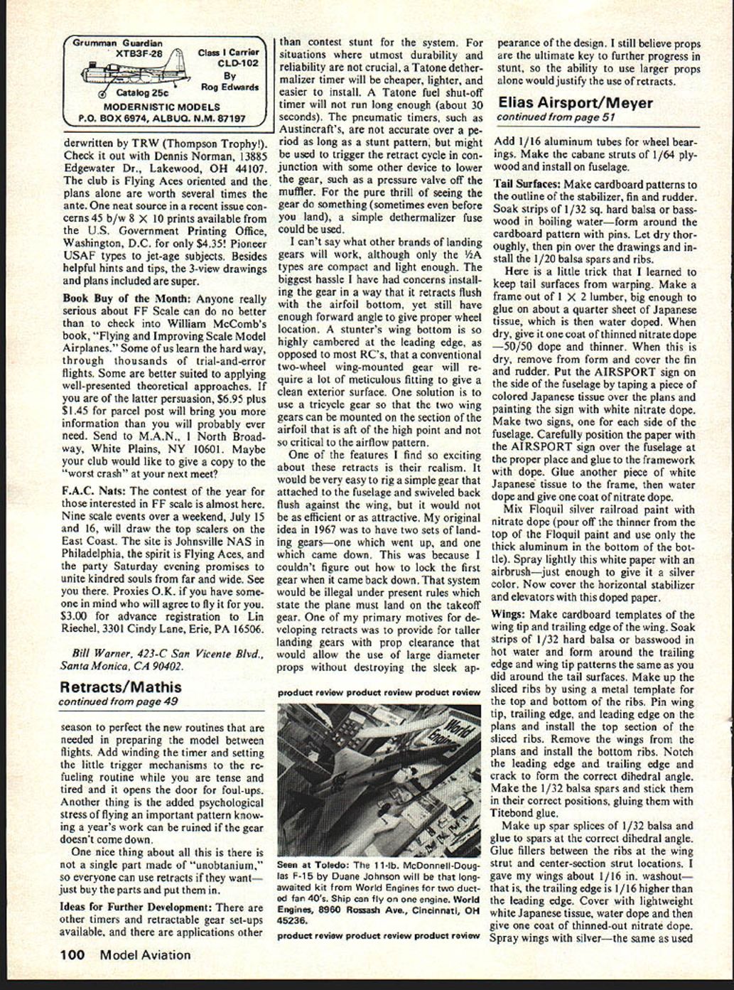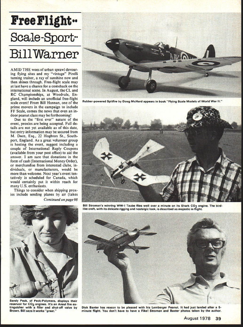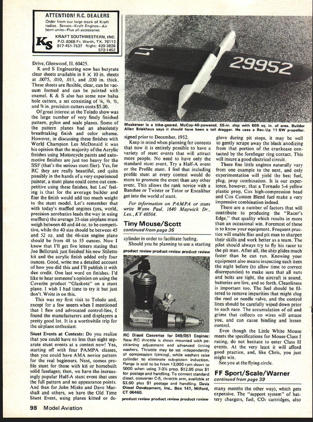 Free Flight Scale -Sport Bill Warner AMID THE woes urban sprawl devour ing flying sites vintage Pirelli turning traitor ray sunshine now shines through Free-flight scale may last have chance comeback international scene August CL RC Championships Woodvale En gland will include unofficial free-flight scale event Bill Hannan prime movers campaign include FF Scale comes news door peanut class may forthcoming Due first ever nature event proxies being accepted Full de tails yet available date entry information may secured M Duce Esq 22 Hoghton St Southport England As great volunteer group hosting event suggest including couple International Reply Coupons available post office aid answer am sure donations form cash International Money Order merchandise interested clubs dividuals manufacturers would welcome Next years event ten tatively scheduled Canada would certainly put within reach US enthusiasts Things consider shipping prox ies include sending planes air takes August1978 39 Rubber-powered Spitfire Doug McHard appears book Flying Scale Models World War II Continued page 98 Bill Stromans winning WW-l Taube flies well over minute its Shark CO2 engine bird like craft its delicate rigging nostalgic look described majestic flight Sandy Peck Peck-Polymers displays reservoir CO2 engines Its Ansul fire ex tinguisher filler shut-off valve Dick Baxter has reason pleased Lemberger Peanut just landed after 5Brown Bill says works great minute flight dont have have Fikel Stroman Baxter photos taken author Drive Glenwood IL 60425 K S Engineering now has butyrate clear sheets available 8 X 10 sheets 0075 010 015 030 thick sheets flexible clear can vac uum formed can painted enamel K & S also has some new balsa hole cutters set consisting 5/ precision cutters costs $500 great interest Toledo show large number very finely finished pattern pylon scale planes Some pattern planes absolutely breathtaking finish color scheme However discussing finishes World Champion Les McDonald opinion majority Acrylic finishes using Motorcycle paints auto motive finishes just too heavy SSF thats serious stunt flier Yes RC really beautiful quite possibly hands very experienced painter stunt plane could come out com petitive using finishes Les feel ing average builder flier finish would add too much weight stunt model Lets remember todays muffled engines yes world precision aerobatics leads way using mufflers average 35-size airplane must weigh between 40 44 oz competi tive 40 size should between 45 52 oz 46-size engine plane should 48 55 ounces Now know Ill get five letters stating Joe Bellcrank just finished new Stiletto kit acrylic finish added four ounces Good write detailed account did Ill publish due credit last word finishes Id like hear someones opinion using Coverite product Glaskote stunt plane wish time try just dont Write first visit Toledo except few sneers mentioned flew advocated control-line found manufacturers displayers pretty good lot worthwhile trip airplane enthusiast Stunt Events Contests realize could have no less eight sep arate stunt events contest now Yes starting off four PAMPA classes could have AMA novice pattern real beginners Next comes pro file stunt kit homebuilt solid fuselages have increas ingly popular Half-A stunt event uses full pattern no appearance points John Miske Dave Mar shall others have Old Time Stunt Event using planes kitted de signed prior December 1952 Keep mind planning contests now entirely possible have variety stunt events will attract people No need have standard stunt event Try Half-A event Profile stunt feel including profile stunt contest would promote event other event allows rank novice Banshee Twister Tutor Excalibur get world stunt information PAMPA stunt write Wynn Paul 1640 Maywick Dr Lex. KY40504 Tiny Mouse/Scott continued page 36 cylinder order facilitate fueling Should planning use starting product review product review product review RC Diesel Converter 049/051 Engines New RC throttle shock mounted po sitioning adjustment advanced timing washers Throttle may set independently compression timing washers raise cylinder eliminate sub-piston induction Range said 13000 rpm down 5000 using 7-3% prop $1295 plus $1 postage handling convert standard diesel converter C-5 throttle arm available $300 plus $1 postage handling Davis Diesel Development Inc Box 141 Milford CT 06460 product review product review product review glove during pit stops may well gently scrape away black anodizing portion crankcase con tacted forefinger ring contact will insure good electrical circuit fine little engines naturally vary example next experimentation will yield best fuel plug prop combination exper ience however Tornado 5-4 yellow plastic prop Cox high-compression head Cox Custom Blend fuel make very impressive combination indeed number factors will contribute producing Racers Edge quality results occasional win Foremost know equipment Frequent prac tice will enable flier pit man sharpen skills work better team pilot should always try fly racer pit man After ship glides much faster can run Knowing equipment also means inspecting item night before allow time correct discrepancies make sure nuts bolts tight aircraft sound batteries live forth Cleanliness important too fuel should fil tered remove impurities might clog reed needle valve control lines should carefully wiped down prior race accumulation oil grime collects wires will amaze can cause binding lessen control though Little White Mouse meets specifications Mouse Class racing hesitate enter Class II events very least will afford good practice like Chris just might win See flying circle FF Sport/Scale/Warner continued page 39 months other way gets expensive support system bat tery chargers fuel C02 cartridges also 98 Model Aviation ATTENTION RC DEALERS Order large stock Kraft radios ServosKraft EnginesAir born unitsPlus accessories KRAFT SOUTHWESTERN INC P08068 Ft Worth TX 76112 817-451-7537 Night 42g-3828 572-1452 Musketeer tnke-g