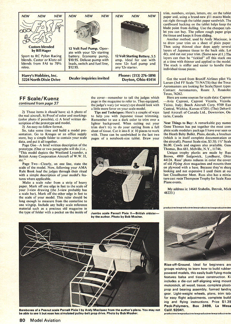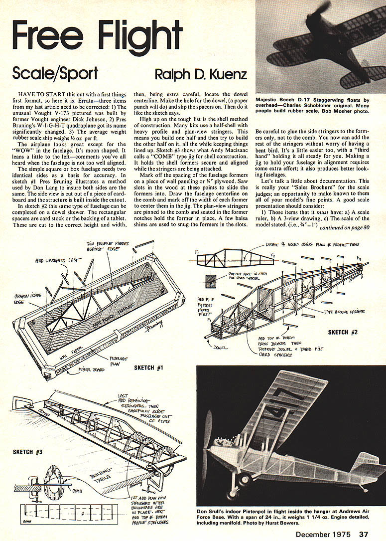 Free Flight Scale/Sport HAVE TO START out first things first format Erratathree items last article need corrected 1 unusual Vought V-173 pictured built former Vought engineer Dick Johnson 2 Pres Brunings W-I-G-H-T quadraplane got its name significantly changed 3 average weight rubber scale ship weighs er ft airplane looks great except WOW fuselage Its moon shaped leans little leftcomments youve heard fuselage too well aligned simple square box fuselage needs two identical sides basis accuracy sketch #1 Pres Bruning illustrates method used Don Lang insure both sides same side view cut out piece card board structure built inside cutout sketch #2 same type fuselage can completed dowel skewer rectangular spacers card stock backing tablet cut correct height width Ralph D Kuenz being extra careful locate dowel centerline Make hole dowel paper punch will slip spacers like sketch says High up tough list shell method construction kits use half-shell heavy profile plan-view stringers means build half try build other half keeping things lined up Sketch #3 shows what Andy Macisaac calls COMB type jig shell construction holds shell formers secure aligned stringers being attached Mark off spacing fuselage formers piece wall paneling ood Saw slots wood points slide formers Draw fuselage centerline comb mark off width former center jig plan-view stringers pinned comb seated former notches hold former place few balsa shims used snug formers slots careful glue side stringers form ers comb now can add rest stringers worry having bent bird Its little easier too third hand holding steady Making jig hold fuselage alignment requires some extra effort also produces better look ing fuselages Lets talk little about documentation really Sales Brochure scale judges opportunity make known models fine points good scale presentation should consider items must have scale ruler b 3-view drawing c scale model stated i e_ ontinued page 80 ft6ii3tr nGe - I]~ 4 II 1-11-21 e4Ju4HPS ftE IL ii ii — 41L J ptME J9 --J ]LL-lti-SD rt$ M ~1AX 2iaour isw F$ / // 7/ tieersI ite icwi / F SKETCH #2 jtE-fLt/E JDOLOSL NLE cii-g sfces2s December1975 37 Majestic Beech D-1 7 Staggerwing floats overheadCharles Schobloher original people build rubber scale Bob Mosher photo tDD UPg*qr L ASr eFAJIMItE - PJ SKETCH #1 Don SruIls indoor Pietenpol flight inside hangar Andrews Air Force Base span 24 in. weighs 1 1/4 oz Engine detailed including manifold Photo Hurst Bowers NEWNEWNEW NEWNEWNEW NEWNEWNEW Custom blended12 Volt Fuel Pump Oper Bill Hagerate 12v starting Sport RC Pylon Racingbattery Economy pump12 Volt Starting Battery 55 blends Castor Klotz oil$1095 Deluxe pump withamp Ideal use blends FAI 700/0leads switch fuel linenew 12v fuel pump nitro$1295any 12v starter Harrys Hobbies IncPhone 513 276-5898 5224 North Dixie DriveDealer inquiries invitedDayton Ohio 45414 FF Scale/Kuenz continued page 37 2 items should have photo real aircraft b Proof color markings color photo possible c brief written de scription prototype model 3 An easy-to-follow format So take some time build model pre sentation Go Kresges office supply store buy simple folder contain scale data put together Page brief written description prototype two paragraphs will ie model depicts Westland Lysander British Army Cooperation Aircraft WW II etc Page TwoClearly line state scale model Now following AMA Rule Book lead judges through ritual simple description models fea tures applicable Make scale ruler strip heavy paper Mark off edge feet scale 3-view drawing 3-view probably has scale bar Mark off other edge feet scale model ruler should long enough measure centerline wingtip Include bulky scale reference material such precious old magazine type folder pocket inside cover remember tell judges page magazine refer Thus equipped judges wary weary eye should look little favor scale model Tips Techniques Heres couple ways help Japanese tissue trimming Remember use dark color trim over lighter background cutting out trim dont try cutting full sheet tissue Cut 8 X 10 pieces work can sandwiched last two pages notebook-size tablet Draw trim numbers stripes letters etc tablet paper using brand-new #11 exacto blade cut right through tablet paper sandwich cardboard backing tablet helps keep blade point dulling Use cheapest tab let can buy yellow rough paper grips tissue keeps sliding Another method used Andy Macisaac draw trim sheet plain paper using thinned clear dope apply several layers Japanese tissue back side Let dry cut out trim Same new #11 layers can tickled off stack time thinner applied model stack stiffer easier handle individual tissue pieces Got word Braniff Airlines pilot Vic Larsen 3rd FF Scale 75 NATS Texas Aeromasters looking Scale/Sport types Contact Aeromasters Route 3 Roanoke Texas 76262 some sources scale data Caproni Avia Caproni Caproni Vizzola Vizzola Ticino Italy Beech Aircraft Corp 9709 East Central Wichita Kansas 67201 Dehavil land Aircraft Canada Ltd Downsview tario Canada Neat Things Buy remarkable guy named Gene Thomas has put together com plete scale modelers package have ever seen Heath Baby Bullet Plans decals brochure itself complete documentation aircraft Peanut Scale size 5350 1 Scale $600 Cowls engines also available Gene Thomas Box 681 Melville NY 11746 Unique trophy planks made Russ Brown 4909 Sedgewick Lyndhurst Ohio 44124 Russ photo reduces color covers old Flying Aces magazines mounts plywood base Because theyre sharp looking expensive used last Cloudhuster Meet Russ also has minia ture cast resin Thompson Trophy Scale Race Plane events address 14645 Stahelin Detroit Mich 48223 Rise-off-Ground Ideal beginners groups wishing learn build rubberpowered models easily built flying model features balsa tissue construction Kit includes die-cut self-aligning wing mount motorstick wood tissue complete plastic prop bearing assembly formed landing gear Light-weight wheels plans trim tabs easy flight adjustments complete build ing flying instructions Price $139 