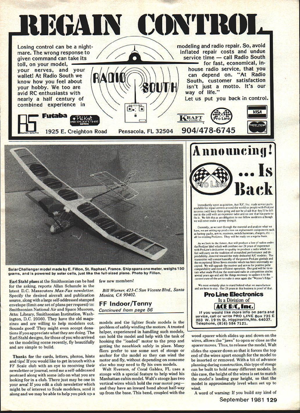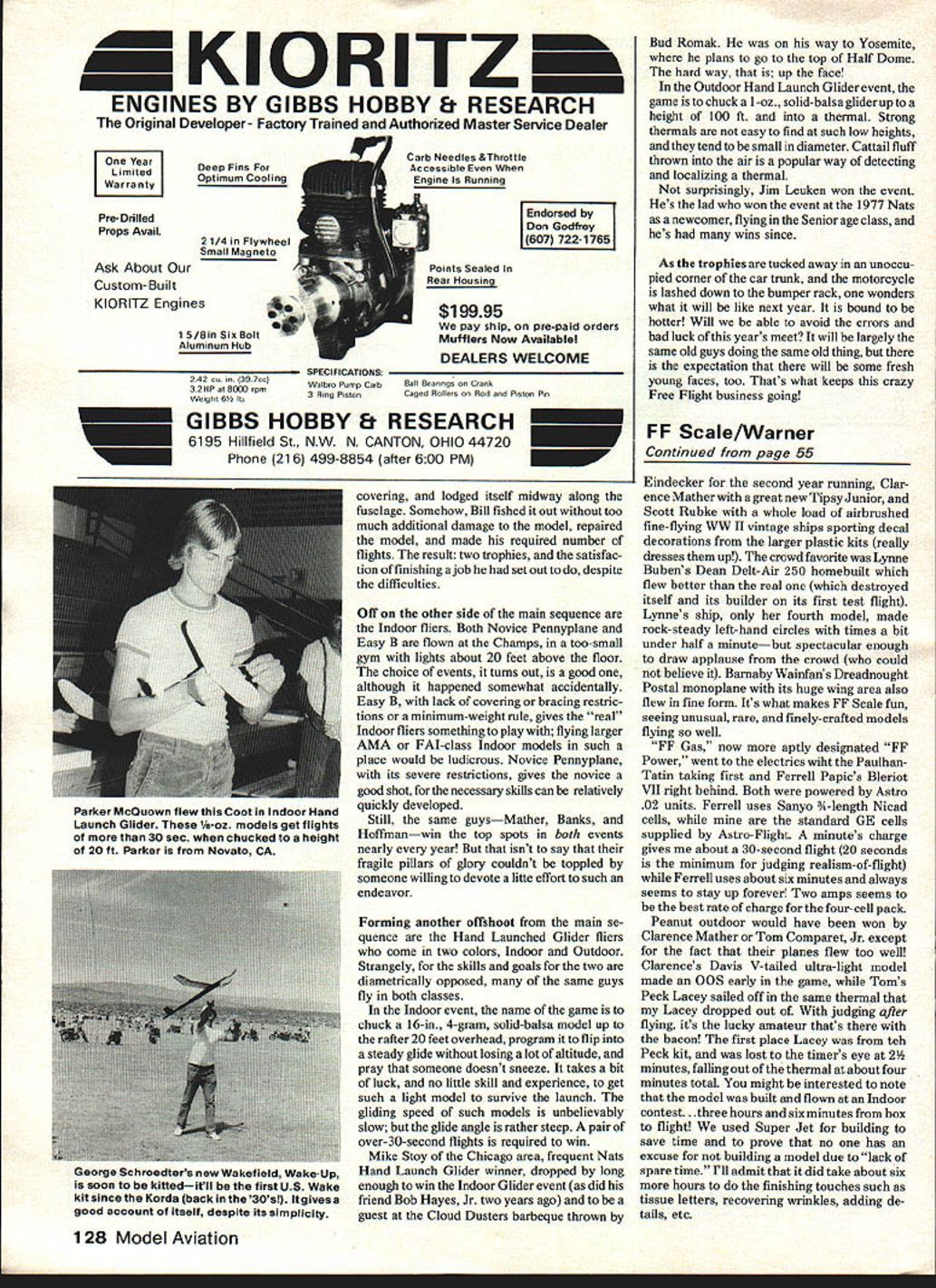FCC Flight Scale/Sport Bill Warner IN REPLY TO readers wonder column spending time hints tips just let say magnificent in-depth treasuries available Bill Hannans Peanut Power Bill McCombs Flying Improving Scale Model Airplanes Fred Halls Indoor Scale Model Flying new entry field Ron Williams Building Flying Indoor Model Airplanes Suffice say thousand words other month cannot begin scratch surface what above books well real Scale nut number clubs devoted art such Flightmasters Flying Aces DC Maxecuters Detroit Cloudhusters Scale Staffel San Diego Cleveland Free Flight Society etc newsletters source inspiration rejuvenation limited column Well continue pass tips either unique recurring use Keep em coming Repairing tissue frustrating point distraction Loren Williams Flightmasters passes little gem replacing area has doped-on tissue markings lettering brush thinner over area lay layer Saran Wrap about 54 Model Aviation Bill Noonan San Diego Scale Staffel did up two caricature Boston Farman Boston Taube birds 14-gram Mooney Bostonian event Planes fly endurance Noonan photo Junkers 352 Russian disguise Jumbo Rubber ship Dick Seifried did 38 minutesatthe 1 98i Taft FFChamps Heres Dickbeforetheflight should have seen grin afterwards Model has DT needs Boo arer wiin nis III-rasea McuonneII XP67 twin rubber 5flIp Plane has made good flights butwas victim over-enthusiastic launch few minutes after picture taken Bill Warner photo Jim Algar Reseda CA rubber-powered Comper Swift think looks great should see air Warner photo Arizonas own Dave Smith great P38 Rubber mode, very realistic real attention-getter Phyllis Warner photo K 4 $/ flnL Would somebody please brush bumble bee off back Asst Ed loves combination two favorites space exploration neat old airplanes minute can remove letter roundel intact ready put back after under lying tissue has replaced Super idea Another use Saran Wrap have using success least 10 years repairing split tissue Minor splits tears come together easily can redone brushing clear dope along rip applying Saran Wrap over side does want come up adhere Saran puff air fuselage 0 15m music-wire prod shoved though opposite surface may help along being noticeable After hour peel off Saran Wrap blend rough edges left doped spot surrounding area using little thinner brush little practice repair will almost invisible final tip has repairing holes tear-outs Often tempted just slap bit tissue Band-Aid manner usually looks like devil due doubleTWA Thermal Worthy Aircraft award thickness talking about translucentDick Siefried Granada Hills CA Jumbo color-tissue coverings re-cover theRubber JU-352 trimotor outboard engines whole area between two structural componentswere dummies won hands-down great ribs whatever joint will bethermal flight 28 minutes official 38 minutes following balsa line will haveon watch chase crew plane single-thickness tissue per original onlyfrom Warplanes Third Reich takes minute two longer tissue iscaptured German ship redone painted cheap Really improves appearancesRussian markings red trim white back ground Czechs presented Stalin new Mercedes inside Indoor session dominated fine models Ron Wittman won Continued page 128 1981 US Free Flight Championships Taft over Memorial Day provided usual quota thrills enthusiast years outstanding performance earns coveted September 1981 55 1910PaulhanTatin Aero-Torpille No1 powered Astro Flight 02 Electric Won Power event Taft FF Championships iuv ulrauaan-vermora peanut nyc rilmun UIIIUFUIIIJ flOU IIIdUU HUU hand-launched flights maintaining altitude needs work get climb Definitely beginners model Fillon photo KIORITZ tNIiINES BY GIBBS HOBBY & RESEA Original Developer Factory Trained Authorized Master Service Dealer Year Limited Warranty Pre- Drilled Props Avail Ask About Custom- Built KIORITZ Engines Deep Fins Optimum Cooling 21/4 Flywheel Small Magneto 1 5/8in Six Bolt Aluminum Hub Carb Needles &Throttle Accessible Engine Running Don Godfrey [2z22276J Points Sealed Rear Housing $19995 pay ship pre-paid orders Mufflers Now Availablel DEALERS WELCOME 5FECIFICATION5 242co 357ccWoIbro Pnorp CobRoll Reorngs Crenk 32HP ot 8000 too3 Rog PstoeCoged Rollers Rod ond Fstoo Rn ght 6 lb GIBBS HOBBY & RESEARCH 6195 HIlifleld St NW N CANTON OHIO 44720 Phone 216 499-8854 after 600 PM covering lodged itself midway along fuselage Somehow Bill fished out too much additional damage model repaired model made required number flights result two trophies satisfac tion finishing ajob set out despite difficulties Off other side main sequence Indoor fliers Both Novice Pennyplane Easy B flown Champs too-small gym lights about 20 feet above floor choice events turns out good although happened somewhat accidentally Easy B lack covering bracing restric tions minimum-weight rule gives real Indoor fliers something play flying larger AMA FAI-class Indoor models such place would ludicrous Novice Pennyplane its severe restrictions gives novice good shot necessary skills can relatively quickly developed Still same guysMather Banks Hoffmanwin top spots both events nearly year isnt say fragile pillars glory couldnt toppled someone willing devote litte effort such endeavor Forming another offshoot main se quence Hand Launched Glider fliers come two colors Indoor Outdoor Strangely skills goals two diametrically opposed same guys fly both classes Indoor event name game chuck 16-in 4-gram solid-balsa model up rafter 20 feet overhead program flip steady glide losing lot altitude pray someone doesnt sneeze takes bit luck no little skill experience get such light model survive launch gliding speed such models unbelievably slow glide angle rather steep pair over-30-second flights required win Mike Stoy Chicago area frequent Nats Hand Launch Glider winner dropped long enough win Indoor Glider event did friend Bob Hayes Jr two years ago guest Cloud Dusters barbeque thrown Bud Romak way Yosemite plans go top Half Dome hard way up face Outdoor Hand Launch Glider event gam