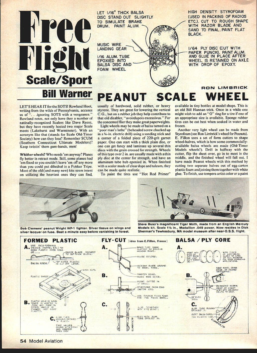 Fee Flight LET I/I& THICK BALSA DISC STAND OUT SLIGHTLY TO SIMULATE BRAKE DRUM PAINT ALUM MUSIC WIRE LANDING GEAR 1/16 ALUM TUBE EPOXIED INTO BALSA DISC AND FOAM WHEEL Scale/Sport HIGH DENSITY STYROFOAM CUSED IN PACKING OF RADIOS ETC CUT TO ROUGH SHAPE WITH RAZOR BLADE AND SAND TO FINAL PAINT FLAT BLACK 1/64 PLY DISC CUT WITH PAPER PUNCH PAINT ALUM AND GLUE IN PLACE AFTER WHEEL IS RETAINED ON AXLE WITH DROP OF EPOXY RON LIMBRICK Bill Warner PEANUT SCALE WHEEL LETS HEAR IT SOTS Rowland Hoot writing wilds Pennsylvania accuses us oring SOTS vengeance Rowland notes have number natinally-recognized Scalers like Dave Reese have recently hosted two major Scale meets Lakehurst Warminster acronym like stands Scale Old-Timer Society can lose Remember SCUM Southern Connecticut Ultimate Modelers Keep twistin gum-bands men Whither wheels needs em anyway Planes fly better retract mode Still some planes em fixed couldnt leave em off could put dihedral Fokker Tripe Most old new kits seem intent utilizing heaviest ones can find FORMED PLASTIC USE VECLAFOEMING DEVICE MATTEL SIC TO DEAW P ASNC DOSE FODM OFDADOF SLEDS SECUEND --TAC NDCN2 eALNA POEM0 SOD U PLUNTID N C 1 OFF ACNE UNIS NUDE FLUALO 5_______ PASTIC fEUD N WDDC B FEUME N UEUT N DUES ANPDNM 051 DOSE HAND E N P00EV NDO DIRT UN C 50EN 0D E ENDED WE ually hardwood solid rubber heavy styrene great lowering vertical CG rubber job help contribute old disabler avoirdupois excessivus concerned flier make great paperweights Light wheels may made balsa turned poor mans lathe beheaded screw chucked up 4-in electric drill using sanding stick corner folded piece 220-grit garnet paper can start thick plain disc can get fancy laminate up several thin discs grain crossed strength Wheels type over 2 usually made thin ply disc center strength have aluminum tube hub epoxied finished sealer made ofcleardope talcum can made quite realistic paint tires use Hot Rod Primer FLY CUT idea EFjlIon France A0 5UoEE SOLOED HACKSAW SUEDE GWGUND CD AMEND FGDM GUANPEN EDGE AlES GUIDE MUJAD CLONED S 4 DEILL NEDFOAMNO DADDONFOM6 LINE POUNDS DOCK FOAM HOE ONE RINSE WMEE C- ASH SUN DOGETEUC SUN, INCOI AUM CNN EPOHED N 5 available tiny bottles model shops old Bill Hannan trick Once might wish add 0 ring tire appropriate size available Sponge rubber tires can cut best soaked water frozen Another very light wheel can made Styrofoam see Ron Limbricks wheel Peanuts E Fillon uses set form cutters shape wheel-halves some commerciallyavailable balsa wheels made Old-Timer Models wheels Drill halfway cutter flip sheet over go meet middle finished wheel will fall Out have made Peanut wheels method cutting two separate halves out egg-carton plastic foam joining together white glue finish use tempera artist color paint START 'J/v NA DCS ONNOF /ihf ON NASA SOFt BA NA Ioff DUNG 0 Does FOR ANT huffON o PLYWOOD PUNY AMES N~f\AIFOE MODE DEMAND WA OKAPP CAD GSA 6MW NUNEL USING EDGE OF FOLDED BUP PER OSANADED 5025W ODOR OF ClANG UCEYUUDE GE SF055 UNLES TO .DLO /4EE C AL MNE NNUNGI$iIk EROs ED LORD NALNA S DEN DSP W 2 4 4W 54 Model Aviation peanut Wright tighter r tissue wings silver lacquer fuse Beat minute easy before vanishing forest mag cent made Trom Mercury Models kit bcale 1fs Medallion 049 power Now resides Dick Shermans Tewkesbury MA model museum after near-O S S flight BALSA / PLY CORE does eat foam wheels came old Sleek Streeks thin plastic shells work well except newer ones seem come safe wheel too Scale-like PeckPolymers went better made black very nice color tire Red props red wheels make colorful product druggists shelf look like devil Scale model Adding paper disc cover void inside wheels adds realism reduces drag better happen have old Mattel Vacu-Forms watch swap meets some Sigs heat-forming plastic sheet can make owneither over heavy wheels over forms own manufacture Remember leave some extra height half-wheel form can trim off transition area pulled two halves can Hot-Stuffed together light coat epoxy around strength other main type wheel spoked wheel Fulton Hungerford makes sizes makes em well hesitate abuse patience trying describe make em Order Pecks get list FH Wheels 1770 Lilac Circle Titusville FL 32780 Suffice itto say try own remember use large diameter spud lacing form must absolutely perpendicular prevent tire wobble tire made poor mans lathe method using two laminations balsa later separated razor blade tacks Using hub consisting two lengths nested aluminum tubing larger being shorter provide shoulder end accept thread spoking lace polyester silk thread over half-wheel down hub shoulder around little back up over wheel half around locating pin over few spokes back over wheel half down hub around bit back up over etc will give dished-downward side thread spokes Touch attachment point Hot Stuff make top lacing Finish off adding top wheel half Hot Stuffing other half thread spoking sand wiched between youre confused should buying wheels Fulton other 99% us Smugglers have weird anyway proven B-29 captured Feds best stories recently comes Bill Stroman got charming avgas attendant Denning TX Seems chap load illegal stuff returning States get Vari-eze probably would have ignored him guy cruising 150 feet What dopey use homebuilt keep hearing reports Vari-ezes Quickies being built successfully models date no has sent proverbial contrasty 5 x 7 black-andwhite photo Hint hint thorniest problems facing FF Scaler Free Flighter matter warp removalwings empennage Aswe plan get detail soon please drop us card favorite warp-removal plan Some swear steam some swear few like gas heat some say nay Should soak entire wing water overnight cover ing pin down year Let us know what has worked both at-home on-the-field warp removal Thanks great letters photos especially ones off-the-shoulder dresses support Keep em flying Bill Warner 423-C San Vicente Blvd Santa Monica CA 90402 February 1982 55 jac mutrauau1 ceimanca racer vuw iiuurpuratus muure iirivu stirrup tfdflbU~5UIUr1 CSLUIII OIIU UUFUU IIIUI