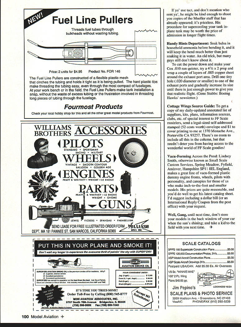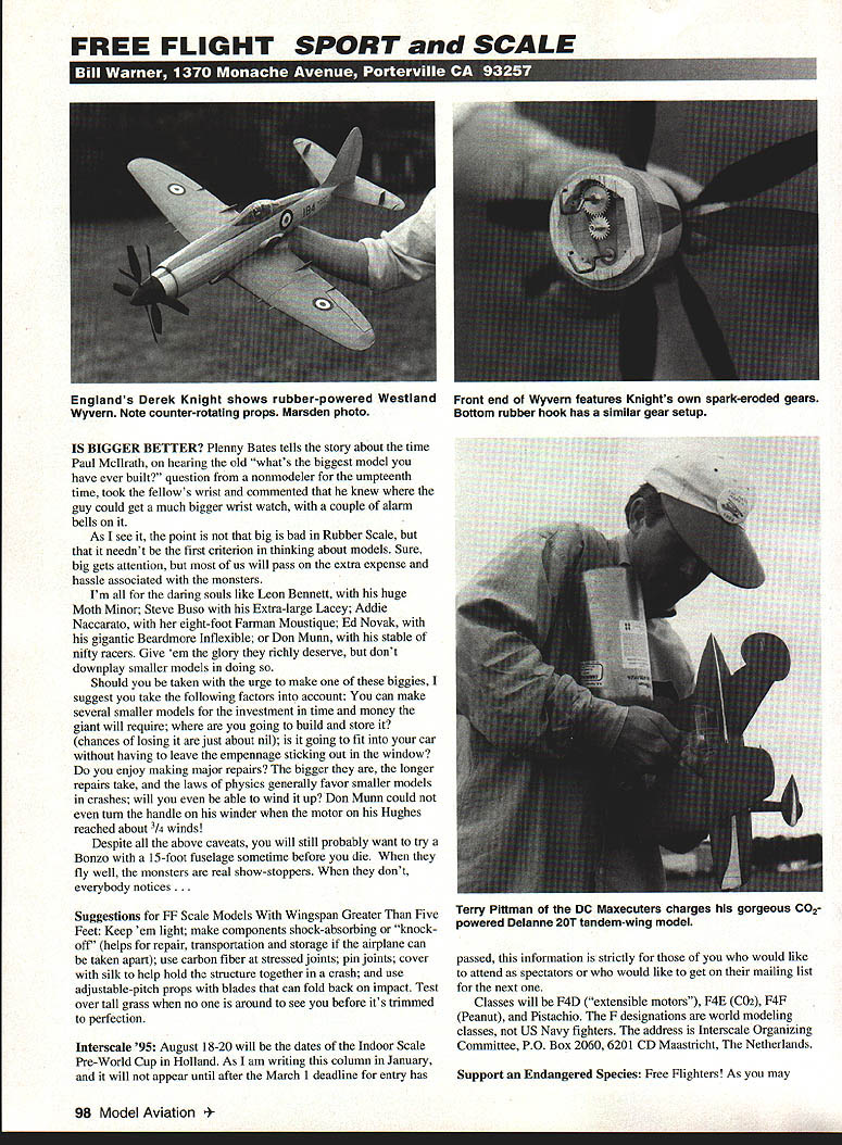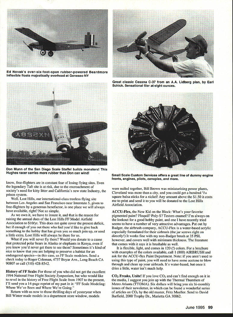 FREE FLIGHT SPORT SCALE IS BIGGER BETTER Plenny Bates tells story about time Paul Mcllrath hearing old whats biggest model have ever built question nonmodeler umpteenth time took fellows wrist commented knew guy could get much bigger wrist watch couple alarm bells As see point big bad Rubber Scale neednt first criterion thinking about models Sure big gets attention us will pass extra expense hassle associated monsters Im daring souls like Leon Bennett huge Moth Minor Steve Buso Extra-large Lacey Addie Naccarato eight-foot Farman Moustique Ed Novak gigantic Beardmore Inflexible Don Munn stable nifty racers Give em glory richly deserve dont downplay smaller models doing Should taken urge make biggies suggest take following factors account can make several smaller models investment time money giant will require going build store chances losing just about nil going fit car having leave empennage sticking out window enjoy making major repairs bigger longer repairs take laws physics generally favor smaller models crashes will able wind up Don Munn could turn handle winder motor Hughes reached about 3/4 winds Despite above caveats will still probably want try Bonzo 15-foot fuselage sometime before die fly well monsters real show-stoppers dont everybody notices Suggestions FF Scale Models Wingspan Greater Five Feet Keep em light make components shock-absorbing knock off helps repair transportation storage airplane can taken apart use carbon fiber stressed joints pin joints cover silk help hold structure together crash use adjustable-pitch props blades can fold back impact Test over tall grass no around see before its trimmed perfection Interscale 95 August 18-20 will dates Indoor Scale Pre-World Cup Holland As am writing column January will appear until after March 1 deadline entry has passed information strictly would like attend spectators would like get mailing list next Classes will F4D extensible motors F4E C02 F4F Peanut Pistachio F designations world modeling classes US Navy fighters address Interscale Organizing Committee PO Box 2060 6201 CD Maastricht Netherlands Support Endangered Species Free Flighters As may 98 Model Aviation ands Derek Knight shows rubber-powered Westland Wyvern Note counter-rotating props Marsden photo Front end Wyvern features Knights own spark-eroded gears Bottom rubber hook has similar gear setup Terry Pittman DC Maxecuters charges gorgeous C02powered Delanne 20T tandem-wing model know free-fighters constant fear losing flying sites legendary Taft site risk due encroachment societys need kitty litter Californias new state Industry prison system Well Lost Hills international-class treeless flying site between Los Angeles San Francisco near Interstate 5 given free-fighters generous benefactor place will always have available right simple As own have insure reason raising annual dues Lost Hills FF Model Airfield Association $10/yr does quite cover present deficit enough out feel youd like give back something hobby has given much join up send little extra Lost Hills will always us What will never fly Would donate cause protected polar bears Alaska elephants Kenya knew youd never get see Sometimes its kind nice know helping preserve habitat endangered speciesin case us FF Scale modelers Send check today Roger Coleman 4737 Boyar Ave Long Beach CA 90807 call 310 428-8542 History FF Scale did get excellent 1994 National Free Flight Society Symposium would like revel history Free Flight Scale 1907 present Ill send 14-page reprint part FF Scale Modeling Weve Been Going Return us now thrilling days yesteryear Bill Winter made models department store window models nailed together Bill Brown miniaturizing power plants Cleveland city could get hundred 1/16 square balsa sticks nickel Any amount above $150 costs print send will donated Lost Hills Airfield Association ACCU-FIex New Kid Block Whats favorite pigmented paint Floquil Poly-S Testors enamel Im always lookout good hobby paint have recently tried seems have number very attractive advantages Put out Badger airbrush company ACCU-Flex water-based acrylic especially formulated airbrush jar screws right directly works fine non-Badger brush 35 PSI however covers well minimum thickness literature comes says brushable well flexible light comes 120 rs brochure examples colors available call 1 800 AIRBRUSH ask ACCU-flex Paint Department Note arent used using type paint will need have some acetone blow through clean up airbrush Its water-based once dries little water isnt much help CO2 Freaks Unite love CO2 cant find enough media suggest join up Thermal Thumbers Metro Atlanta TIOMA Six dollars will bring six bi-monthly issues newsletter can found wonderful series articles CO2 old master Fritz Mueller Send David Barfield 2000 Trophy Dr Marietta GA 30062 June1995 99 Ed Novaks over-six-foot-span rubber-powered Beardmore Inflexible floats majestically overhead Geneseo NY Great classic Cessna C-37 AA Lidberg plan Earl Schick Sensational flier eight ounces Don Munn San Diego Scale Staffel builds monsters Hughes racer carries rubber Don can wind Small Scale Custom Services offers great line dummy engine fronts engines pilots canopies WILHAMS ACCESSORIES 4 PILOTS STANDARD TSMAN RACING TAR VINTAGE TH CONTOUR BALLOON EN AGE 4 ENGINES PRATT & WHITNEY HT HONE tICKERS DAU EELL.or LASE FOR FREE ILLUSTRATED ORDER FORM DEPT MA 181 PAWNEE ST SAN MARCOS CALIFORNIA 92069 - Dont wait longer experience awesome thrill ofpaintin sky SUPER 0DRI ____________________________________ SUPERORI AVIATION SMOKE OIL penrion seseke oil reodolers Vtiby hi SapeIst intense smoke R CONVENIENT UNITS Ca 14 1-gal JNsI 48013I ConsIslertI petIOoeoooe II SUPERORI has canoed epotatiso heal free beet Ask 0mm PattIok Case von Lie--- --- Shieke Arts indushy naoolastons like AMP TME ItoI$ ISCO ________________________________Onats IUgaIItI 27&O0 ITS TIME YOU TRIED SOME Order Toll-Free Calling 800 545-8777 MOW AVIATIOt4 AS800IATES INC 9197 Setitto l6tlo Awoue Srldpvisw IL 60466I